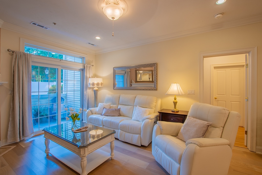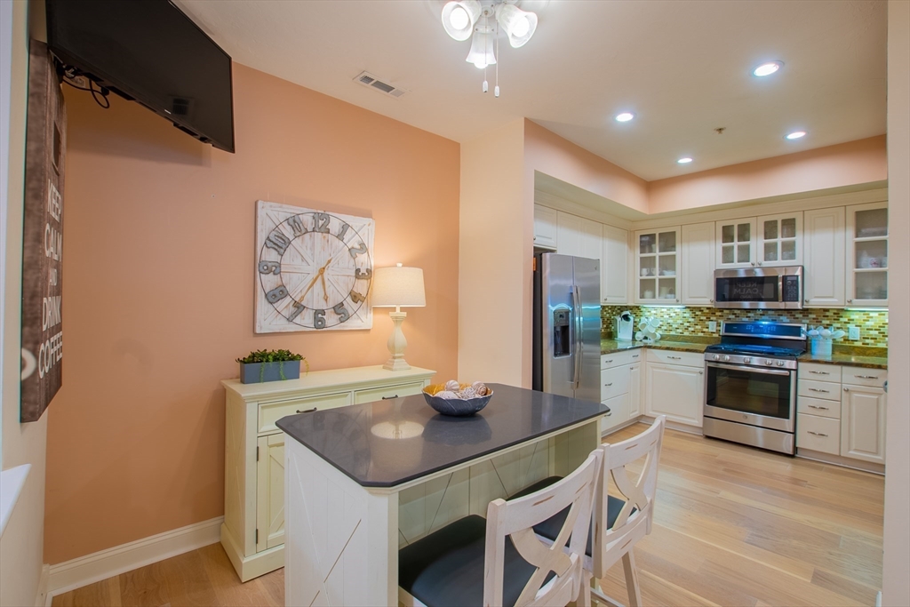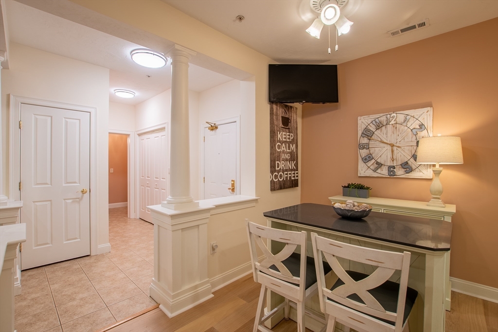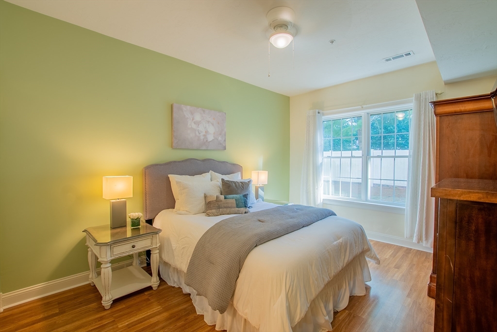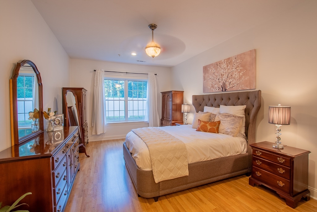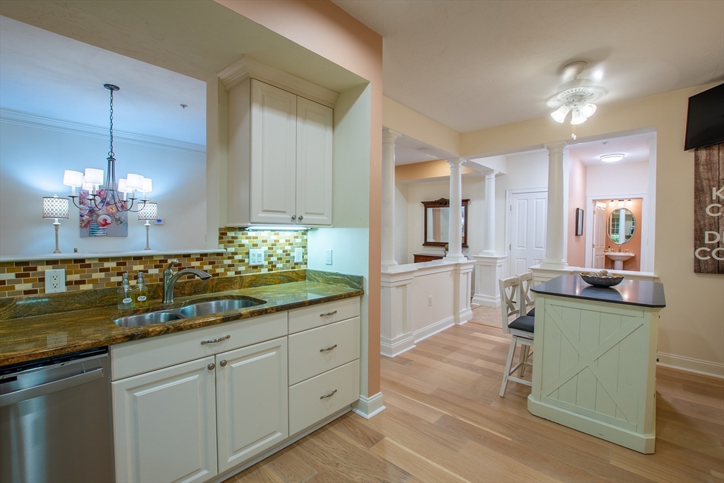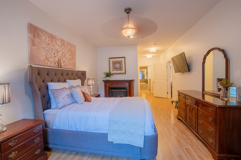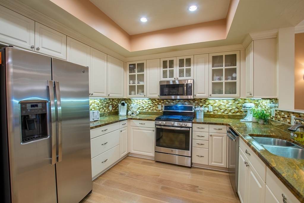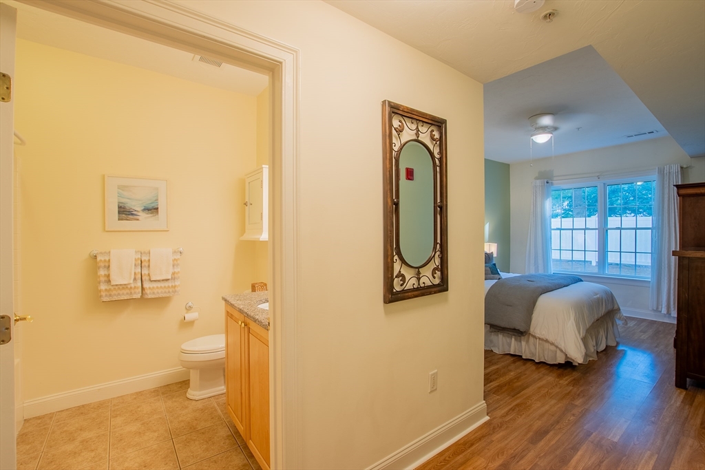 Beautifully maintained two-bedroom, 2.5-bath condo in desirable Bedford. This spacious unit features an updated kitchen with tiled backsplash, granite countertops and stainless steel appliances. The open-concept living and dining area showcases enhanced woodwork, including crown molding and wainscoting, plus updated flooring throughout. The generous primary suite offers two walk-in closets and an en suite bath with whirlpool tub and double vanity. The second bedroom has a private full bath. Additional highlights include in-unit laundry, gas fireplace, central A/C, covered patio, and two assigned garage parking spaces. Conveniently located near Route 128/95, shops, restaurants, and Bedford’s top-rated schools—ideal for professionals, downsizers, or anyone seeking a move-in-ready home with low-maintenance and single-level living full of sophistication.