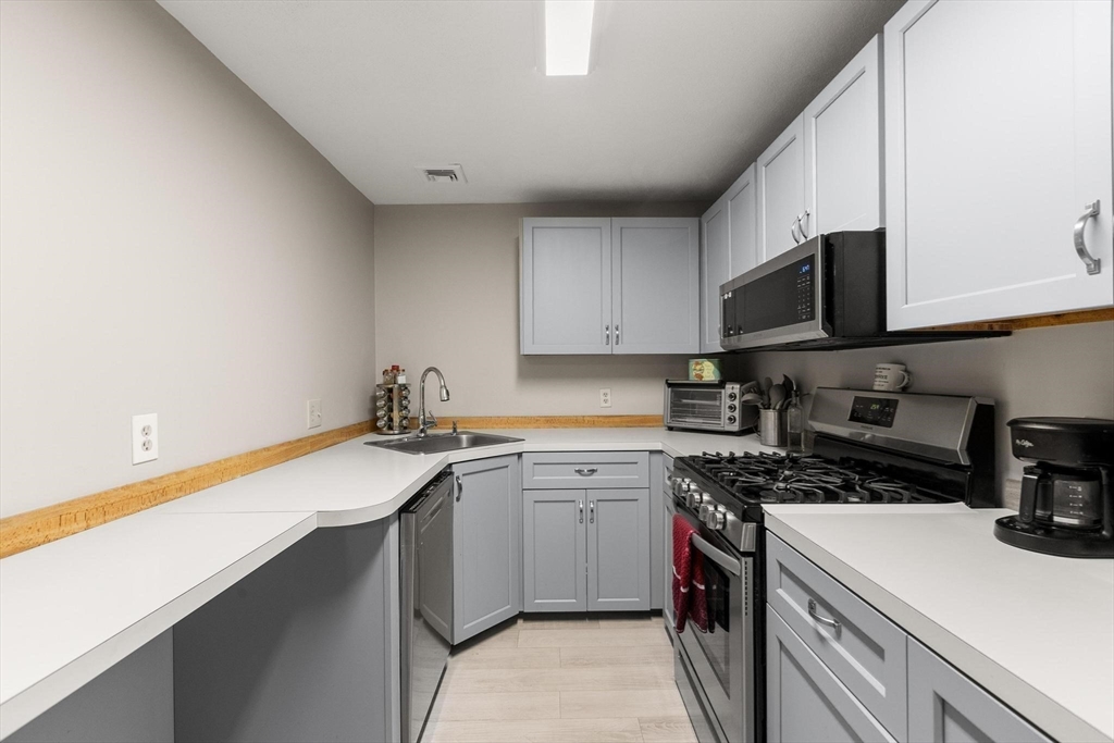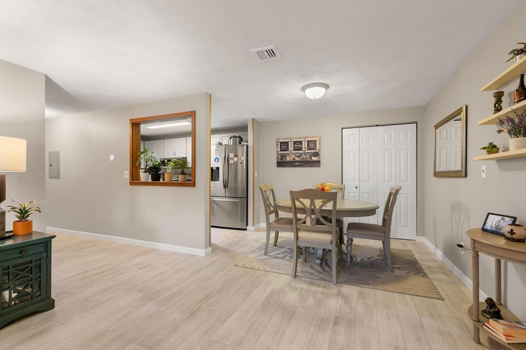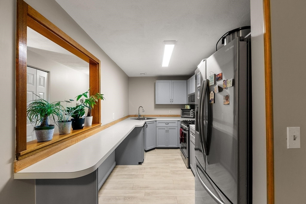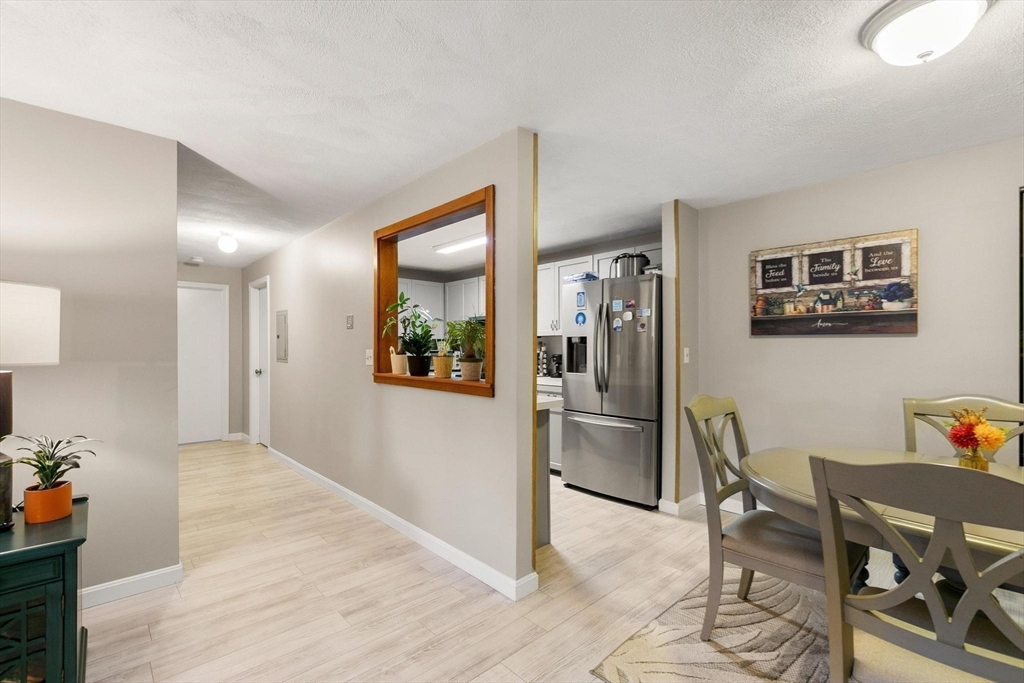 Step into this beautifully updated garden-level condo offering a bright, modern interior and move-in-ready convenience. The spacious kitchen features sleek stainless steel appliances, abundant cabinet space, and a wide pass-through that opens to the dining area—perfect for entertaining. The updated bath and in-unit laundry add everyday comfort and function. Enjoy two generously sized bedrooms with large windows and great natural light. Neutral flooring, fresh paint, and stylish finishes flow throughout. This pet-friendly, professionally managed complex includes water, sewer, snow removal, landscaping, master insurance, two assigned parking spaces, and guest parking. Conveniently located near shopping, restaurants, and commuter routes—this home truly has it all