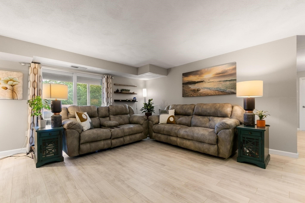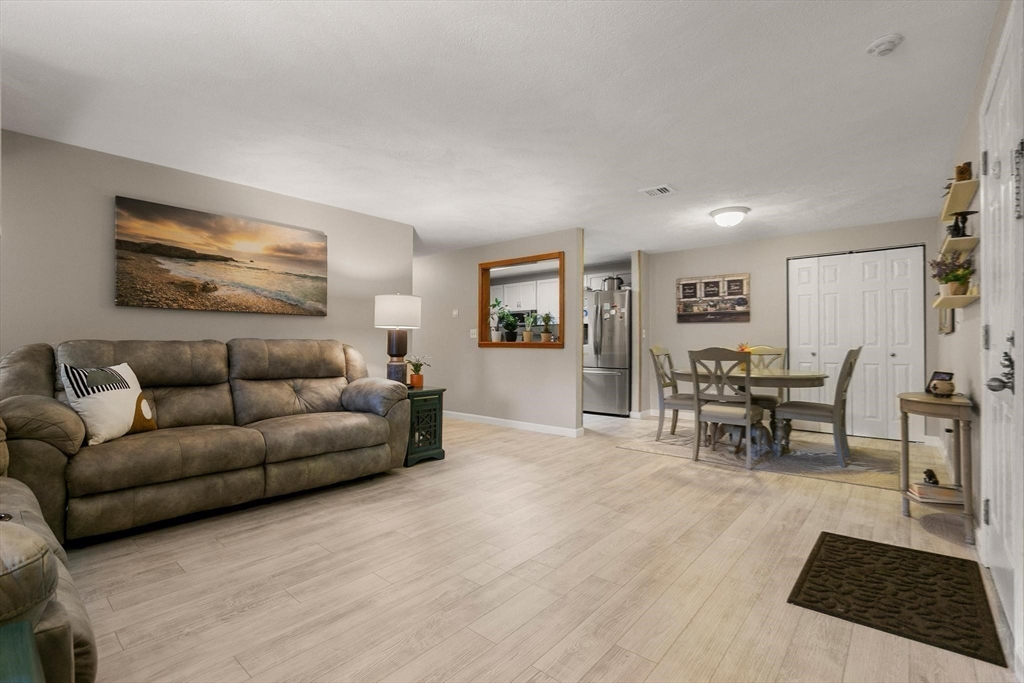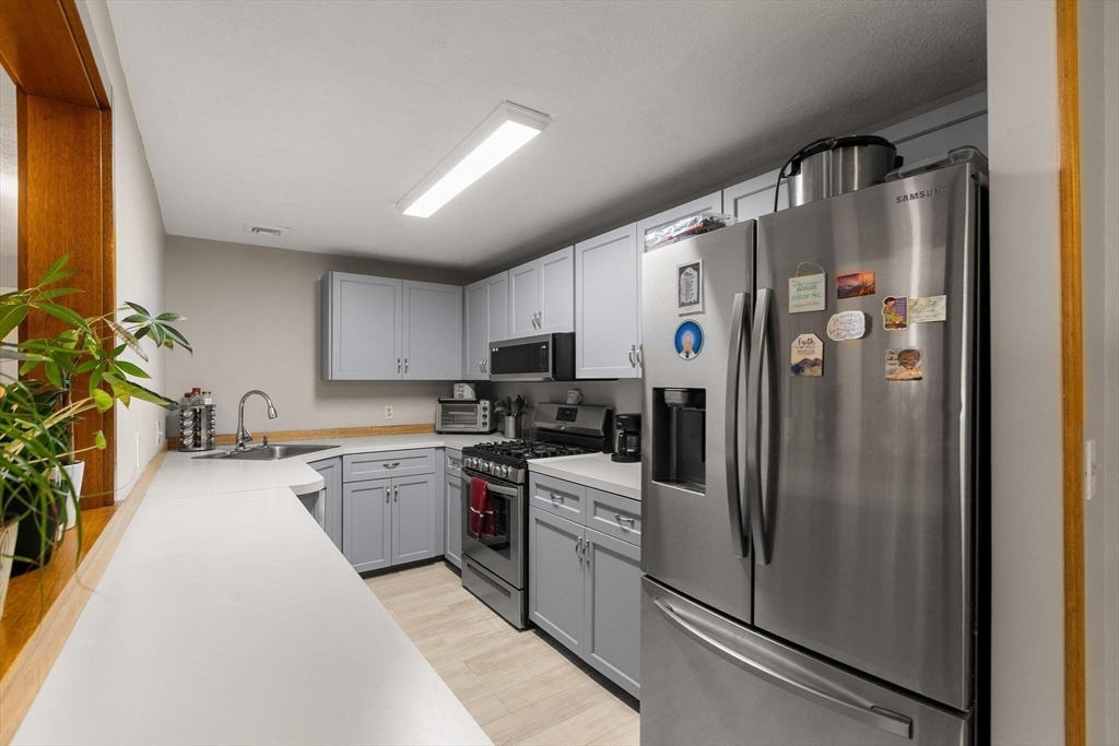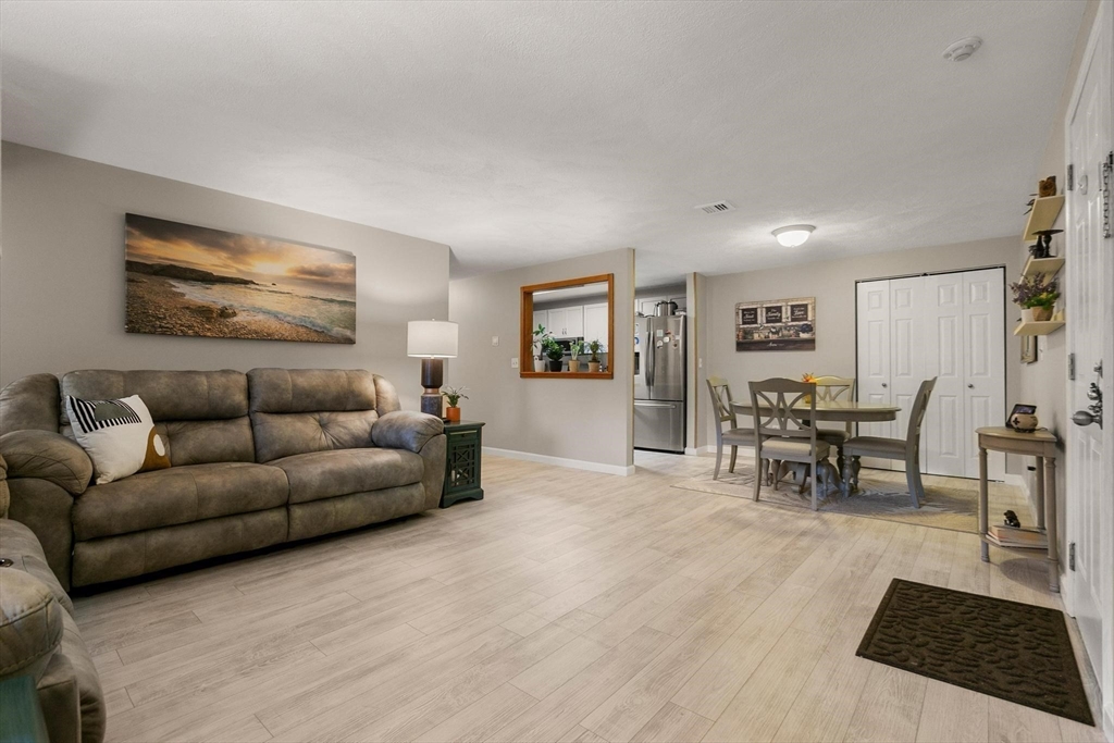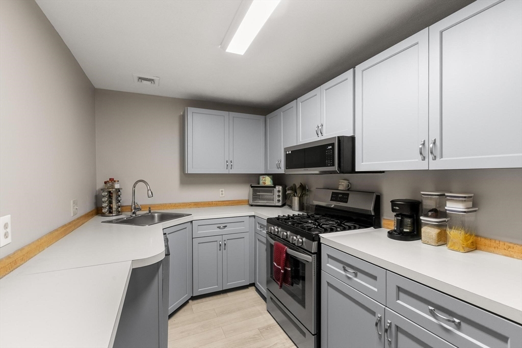 Step into this beautifully updated garden-level condo offering a bright, modern interior and move-in-ready convenience. The spacious kitchen features sleek stainless steel appliances, abundant cabinet space, and a wide pass-through that opens to the dining area—perfect for entertaining. The updated bath and in-unit laundry add everyday comfort and function. Enjoy two generously sized bedrooms with large windows and great natural light. Neutral flooring, fresh paint, and stylish finishes flow throughout. This pet-friendly, professionally managed complex includes water, sewer, snow removal, landscaping, master insurance, two assigned parking spaces, and guest parking. Conveniently located near shopping, restaurants, and commuter routes—this home truly has it all