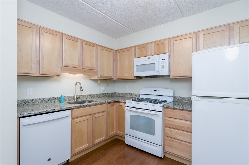 Spacious ground level condominium with deeded garage parking. Excellent commuter location with short access to commuter rail, Mass Pike & 495. Tons of area amenities including shopping & restaurants. Unit is very bright with lots of natural light. Large rooms, kitchen features granite countertops, gas range, refrigerator and dish washer. Separate dining area abuts kitchen and living room. Rear facing balcony perfect for enjoying some quiet time outside. Main bedroom features en-suite full bathroom and walk in closet. Easy living: association includes refuse removal, swimming pool, laundry, exterior maintenance, landscaping, snow removal, exercise room, clubroom, heating & air conditioning!