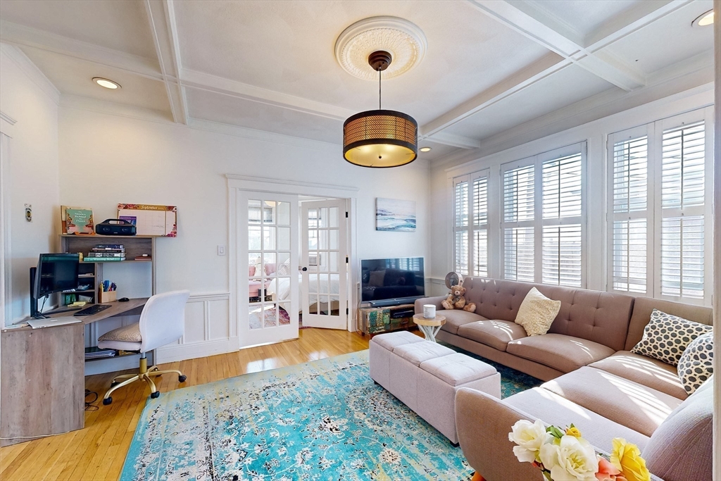 Penthouse with downtown Boston and Seaport views! Welcome to this stunning floor thru 2 bed+bonus room w 2 windows atop Bellingham Hill.With 14 windows spanning 3 exposures,new entryway skylight, kitchen,2022 new roof !The abundance of natural light!Serious wow factor is enhanced by very flexible floor plan.Hardwood floors compliment original beams, crown molding &an eye catching rose medallion.The 1220 square feet offers a variety of uses w/bedrooms on opposite sides.Possible uses include 2 bed w/dining & living rooms, living room w/2 beds & a bright home office, gym or tremendous walk-in closet,or 3 bed w/ living/dining area.Owner improvements include newly renovated kitchen w/ countertops & sink,new cabinetry&flooring.5 new windows& skylight.From your private balcony,enjoy coffee/cocktail & fresh breeze while working from home.Huge 4'7' WALK-IN closet.Silver Line,Commuter Rail &easy downtown access & views!