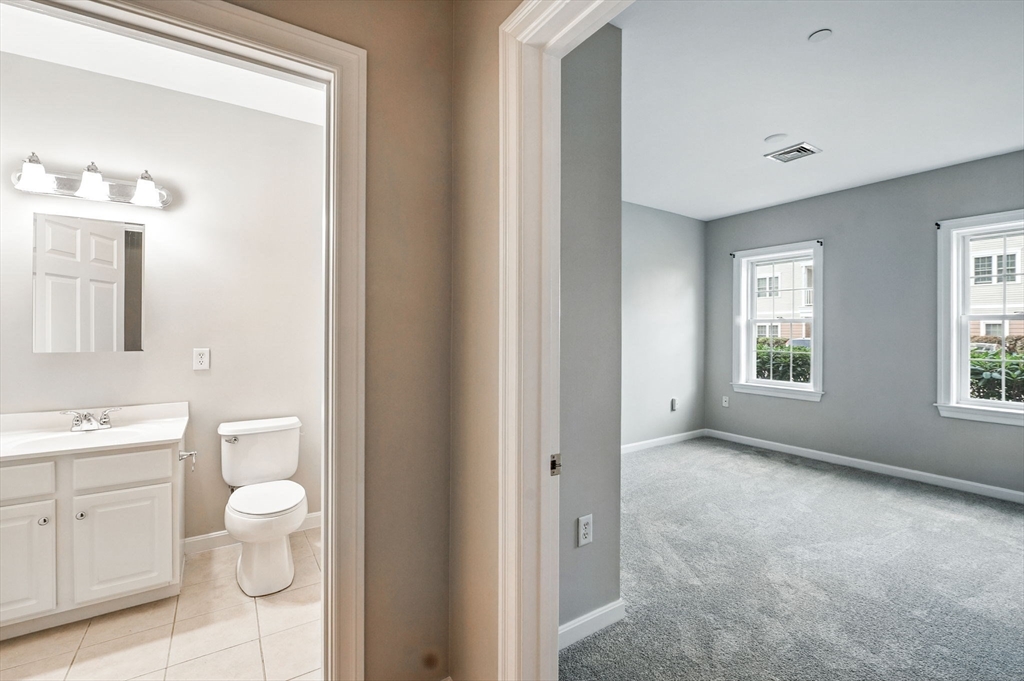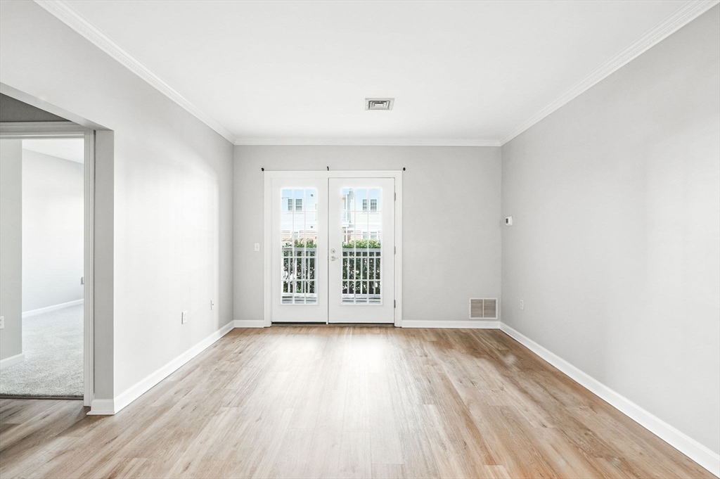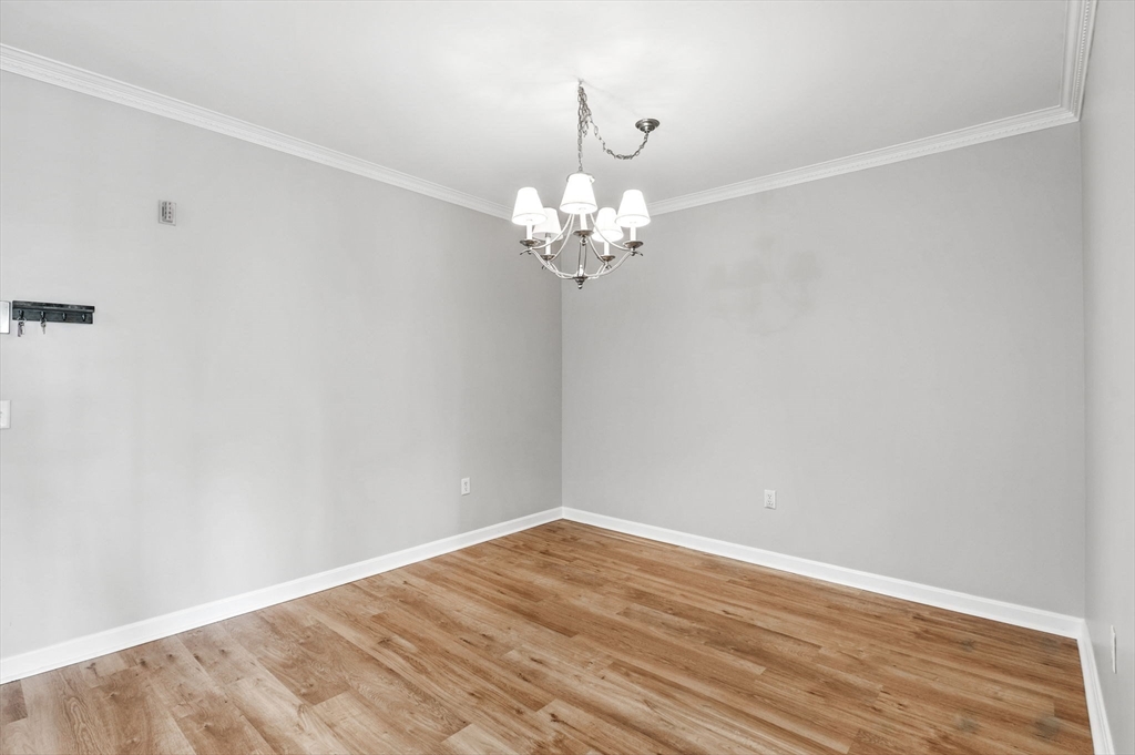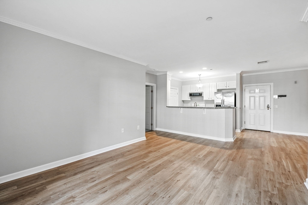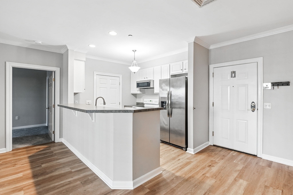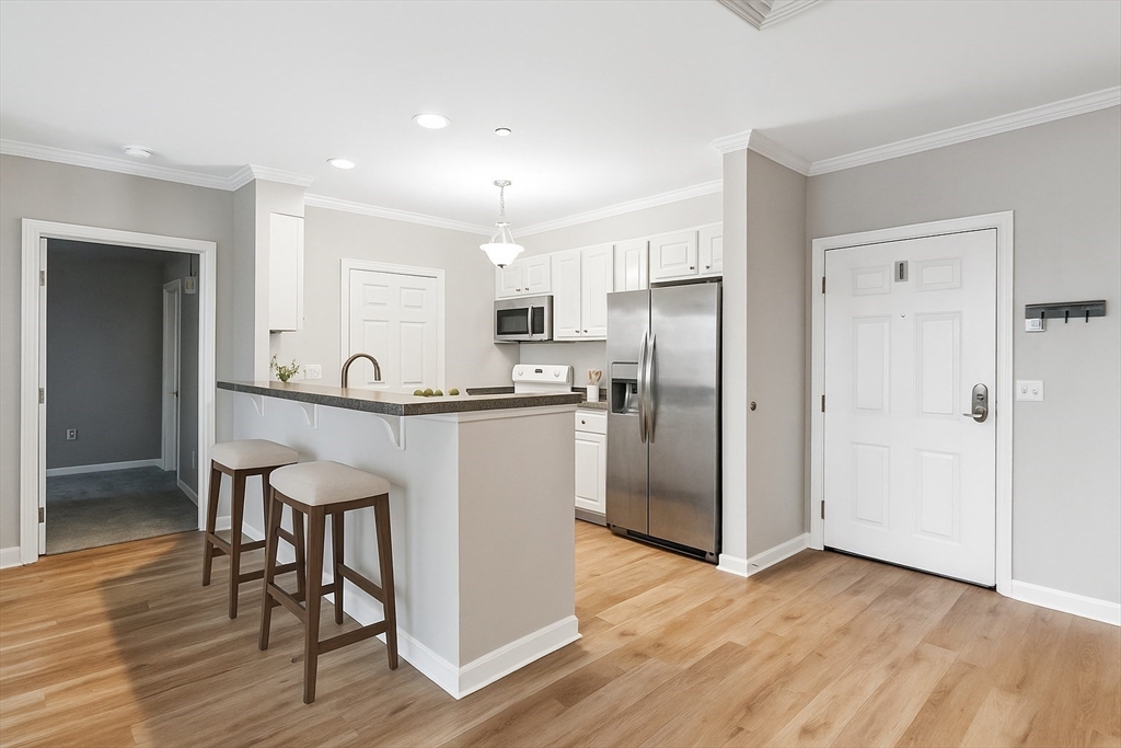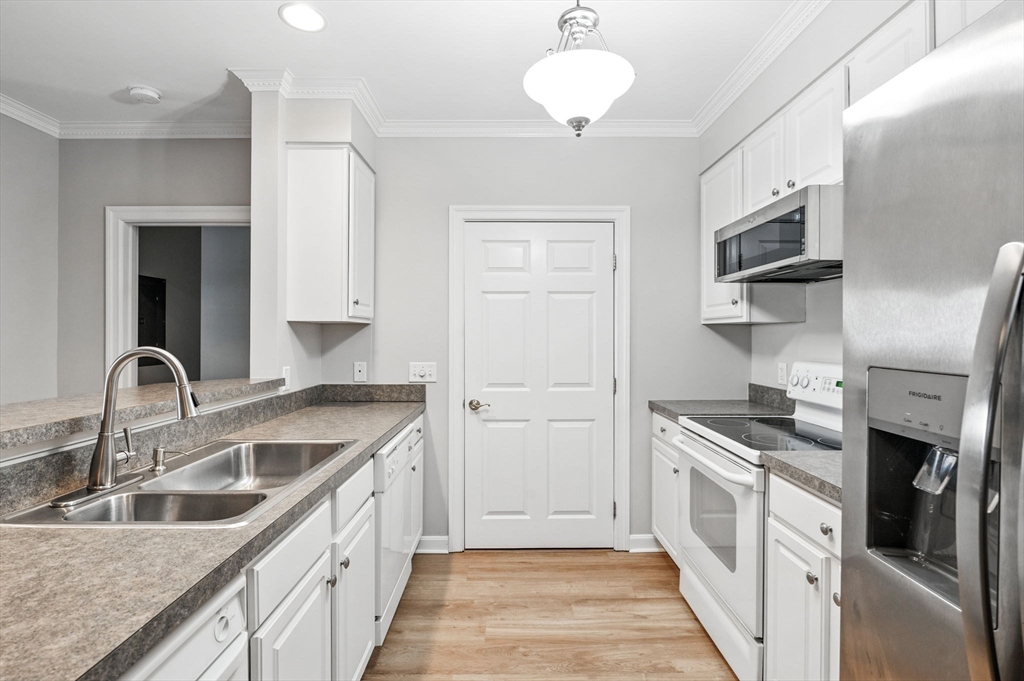 This ground-floor 2-bedroom, 2-bath condo offers single-level living with modern updates and unbeatable amenities. The home features an open-concept layout designed for today’s lifestyle. The kitchen boasts stainless steel appliances breakfast bar, recessed lighting, and crown molding, flowing seamlessly into the dining and living rooms. Elegant French oak luxury vinyl flooring and decorative trim add a polished touch. Step out from the living room to your private covered deck—perfect for morning coffee or evening relaxation. The primary suite includes a walk-in closet and full en-suite bath, while the second bedroom is ideal for guests, a home office, or fitness space. Added conveniences include in-unit laundry and a large private storage room (9’5” x 31’) in the lower level. Enjoy resort-style living at Kittredge Crossing with a clubhouse, fitness center, pool, and deeded parking. Located near shopping, dining, and top schools—with brand new carpeting and freshly painted walls!