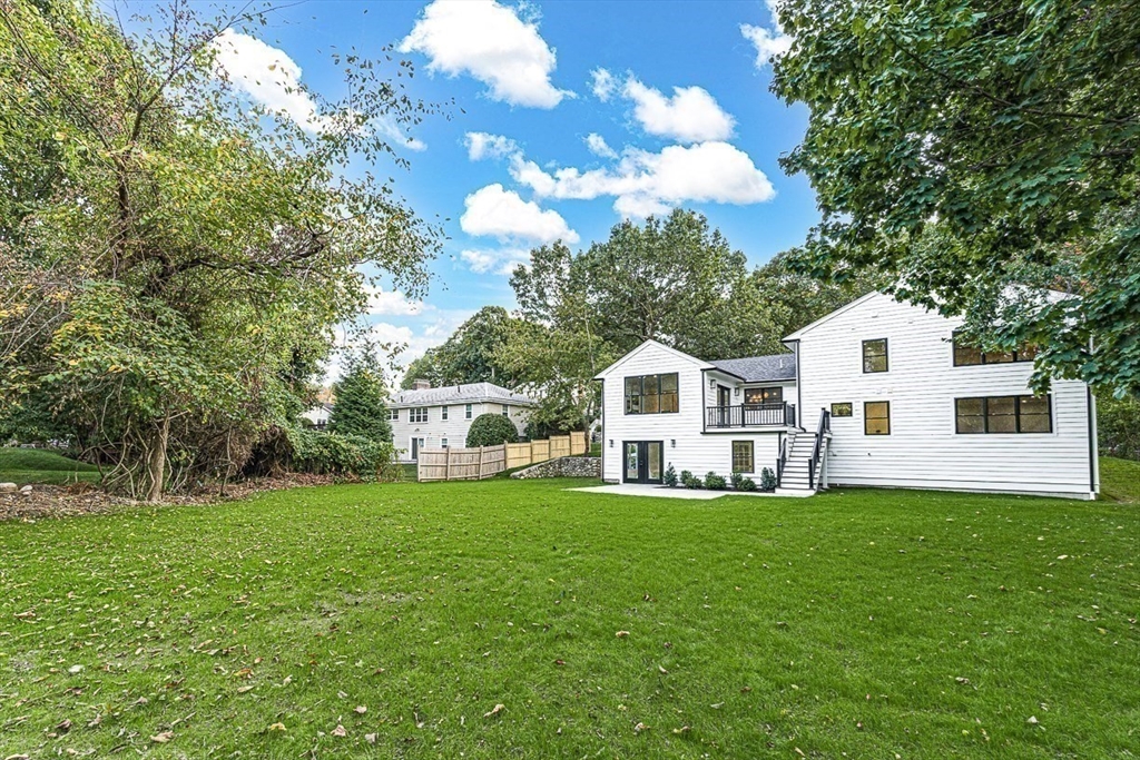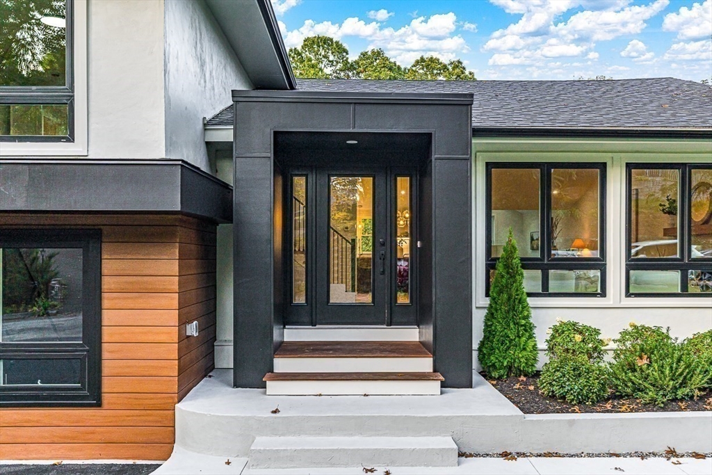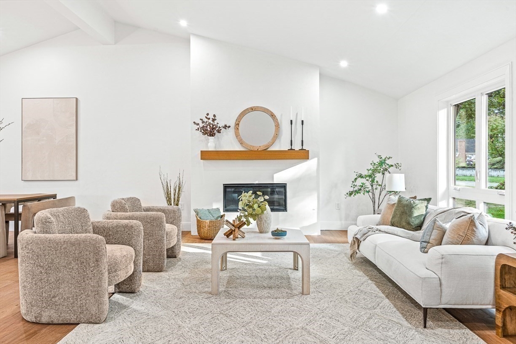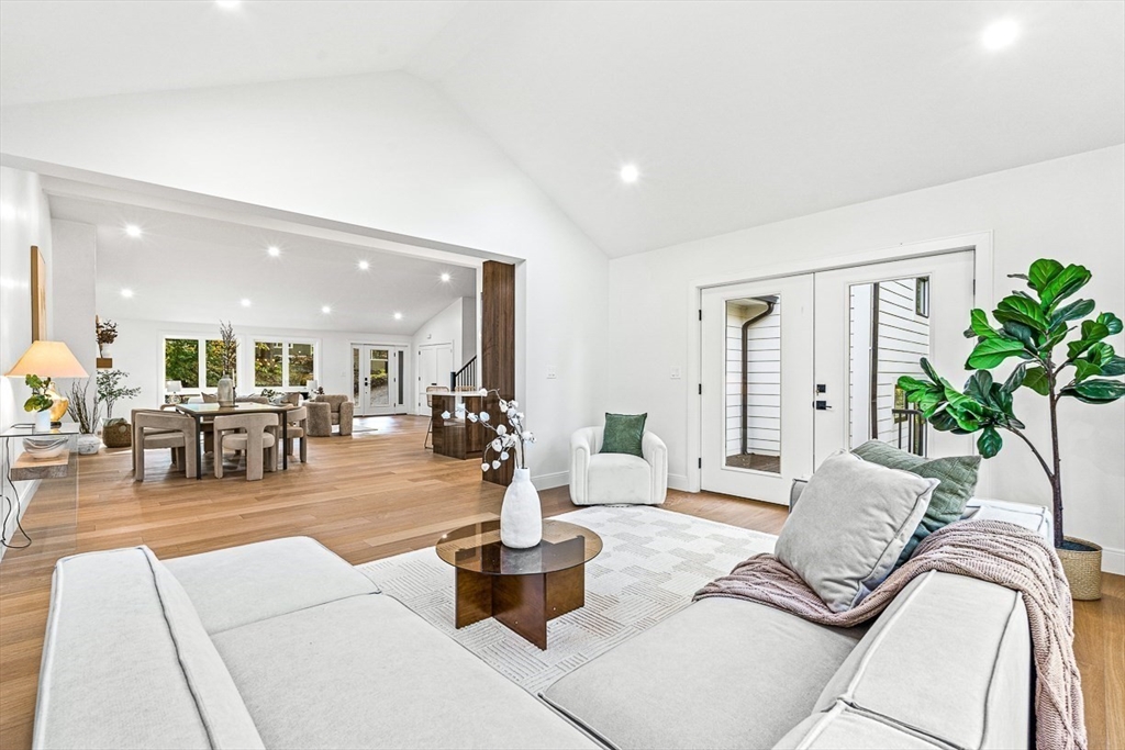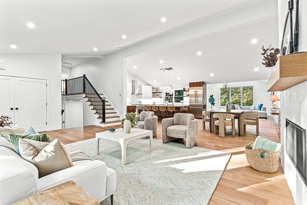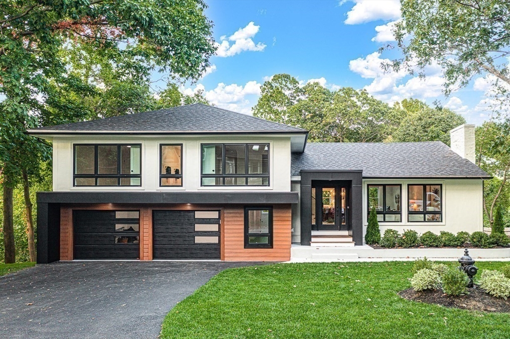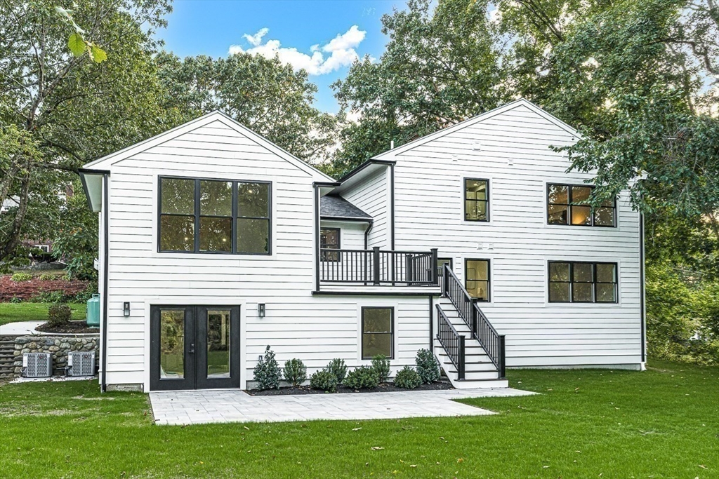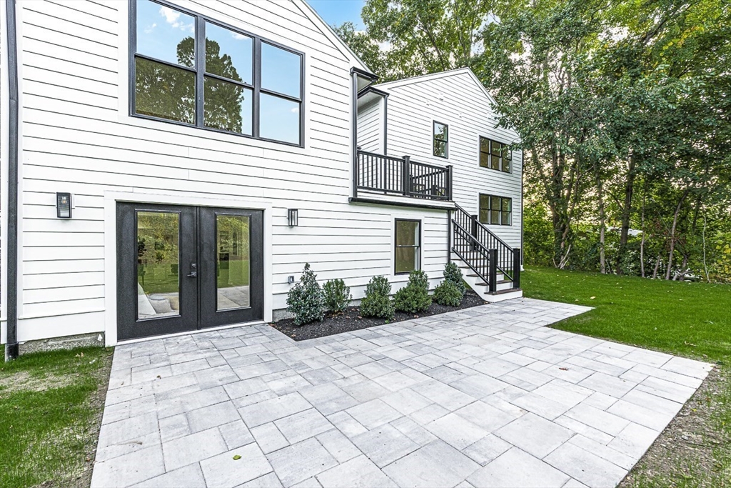 Indulge in modern luxury with this stunning home, set on a double 1/2 acre lot. This 4 bedroom, 4.5-bathroom home seamlessly blends chic style with an abundance of functional space. The architectural design is dramatic, showcasing soaring ceilings, a stunning contemporary fireplace, state of the art kitchen & sun filled living room which opens to a fabulous deck, creating a perfect indoor-outdoor space. The gourmet kitchen features a sleek design w/ a large island, high end appliances, & stylish open shelving. Upstairs, the lavish primary suite features a spa like bath & large custom closet. The 3 additional bedrooms offer ensuite baths. The walk out LL family room w/ wet bar is the perfect space to unwind. This property also features a 2 gar attached garage, mud room, office & laundry room. The double lot offers many possibilities ~ level w/ patio. This home is located near conservation trails, top-rated schools & Boston offering a lifestyle of convenience, luxury & tranquility!