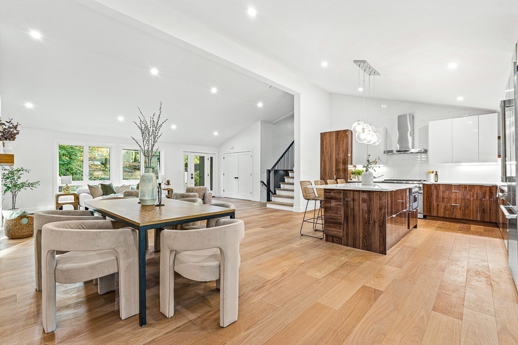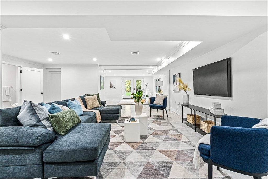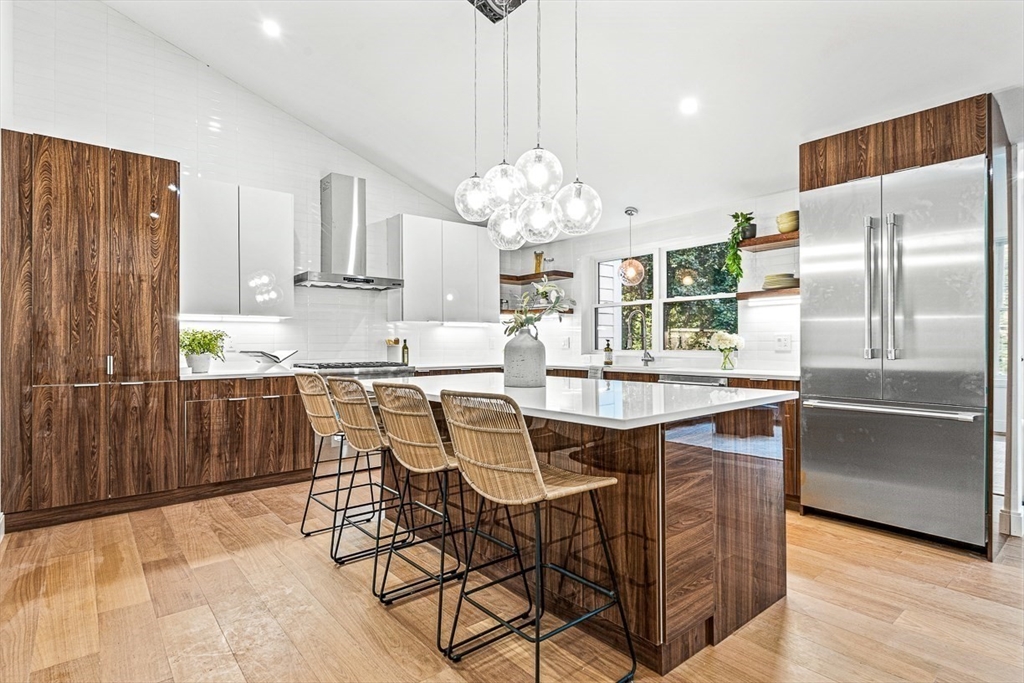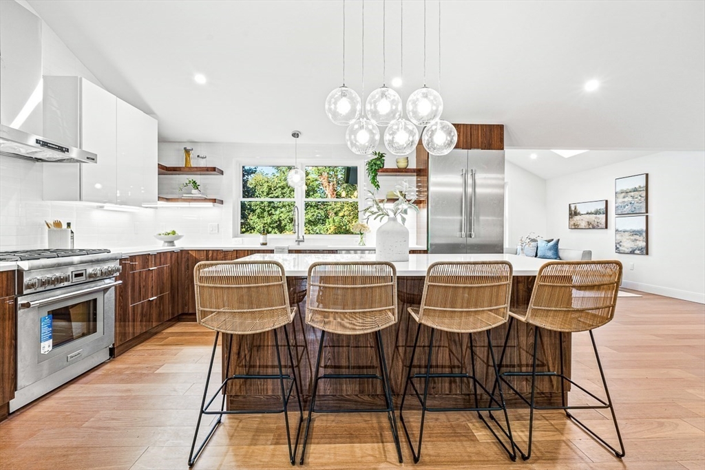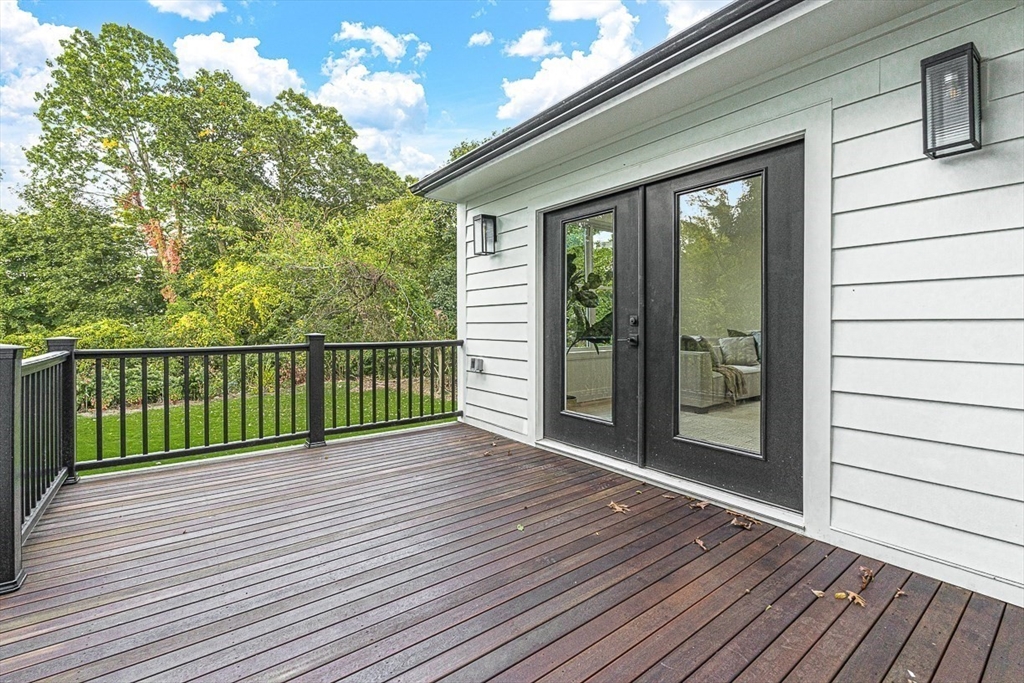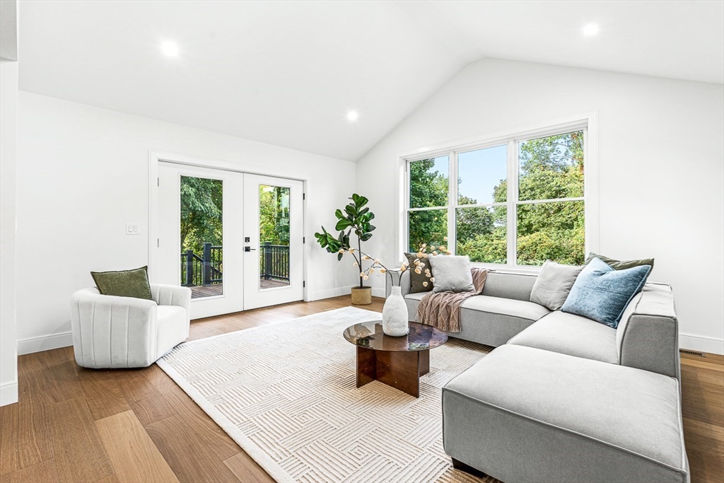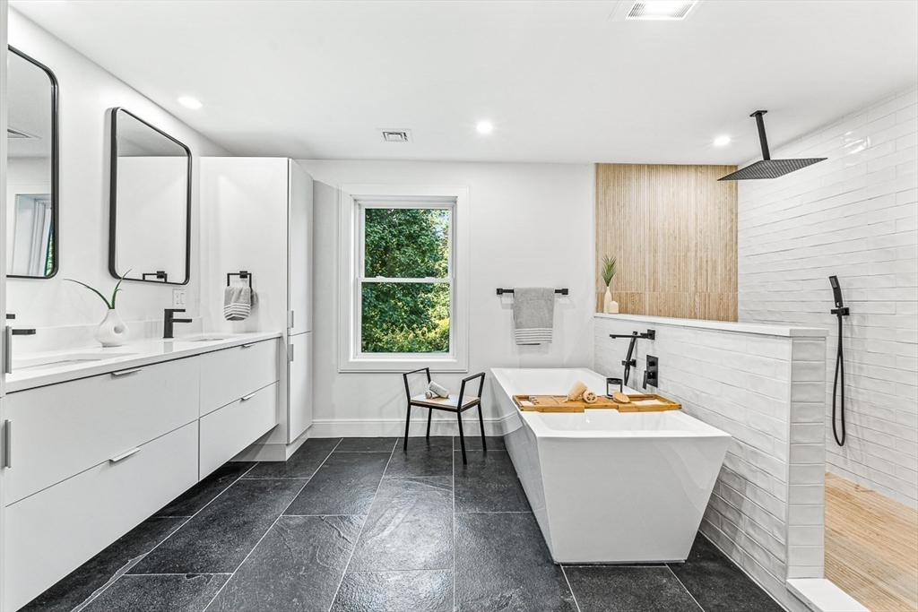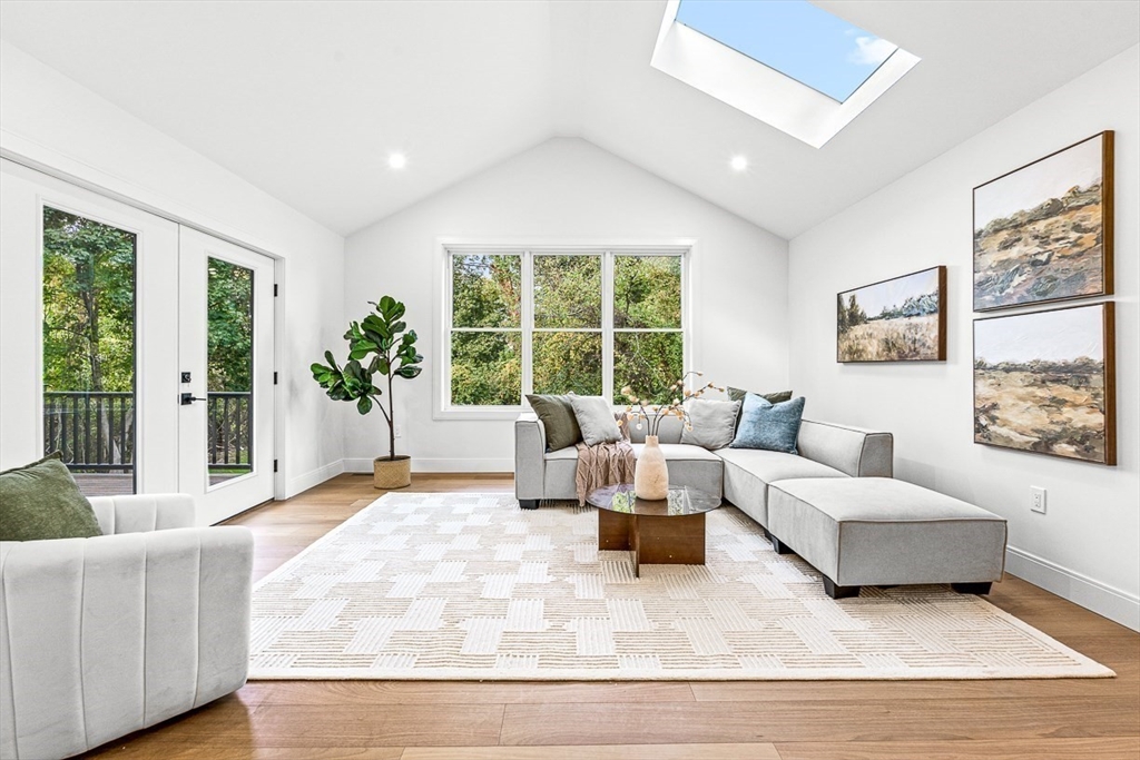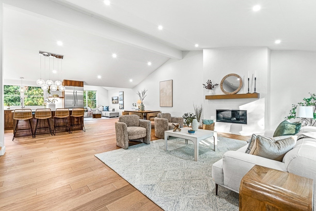 Indulge in modern luxury with this stunning home, set on a double 1/2 acre lot. This 4 bedroom, 4.5-bathroom home seamlessly blends chic style with an abundance of functional space. The architectural design is dramatic, showcasing soaring ceilings, a stunning contemporary fireplace, state of the art kitchen & sun filled living room which opens to a fabulous deck, creating a perfect indoor-outdoor space. The gourmet kitchen features a sleek design w/ a large island, high end appliances, & stylish open shelving. Upstairs, the lavish primary suite features a spa like bath & large custom closet. The 3 additional bedrooms offer ensuite baths. The walk out LL family room w/ wet bar is the perfect space to unwind. This property also features a 2 gar attached garage, mud room, office & laundry room. The double lot offers many possibilities ~ level w/ patio. This home is located near conservation trails, top-rated schools & Boston offering a lifestyle of convenience, luxury & tranquility!