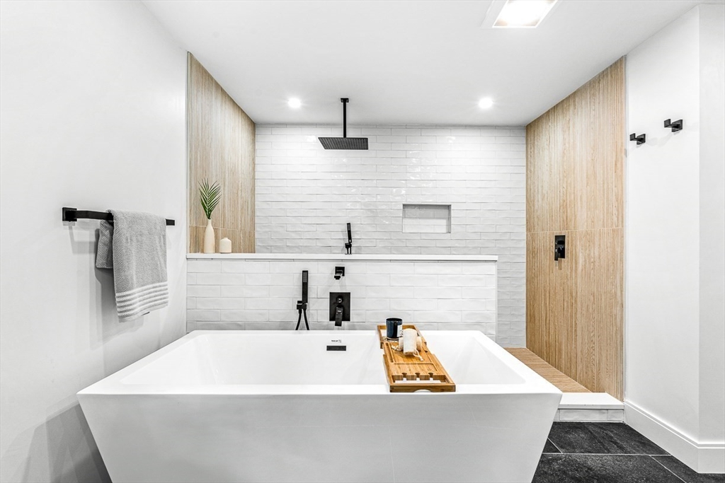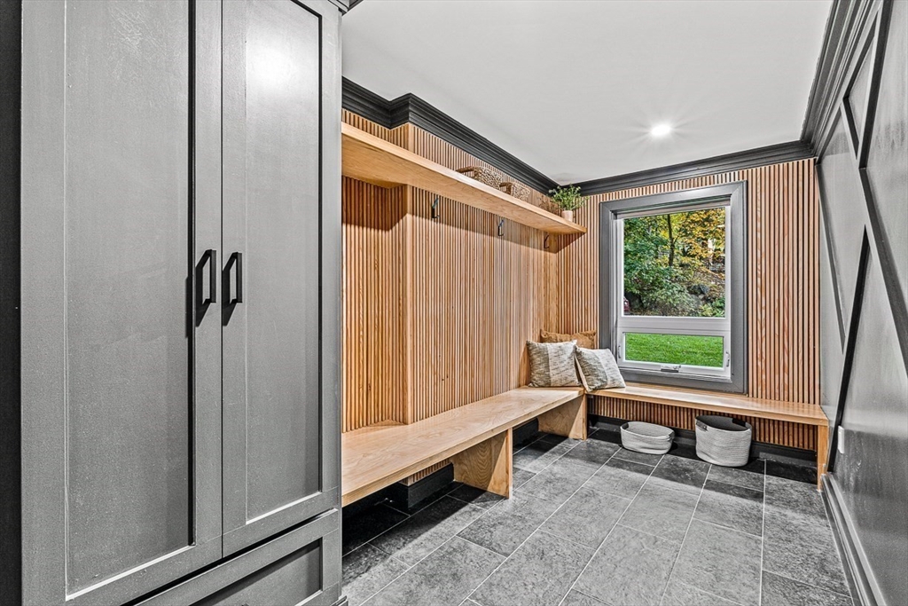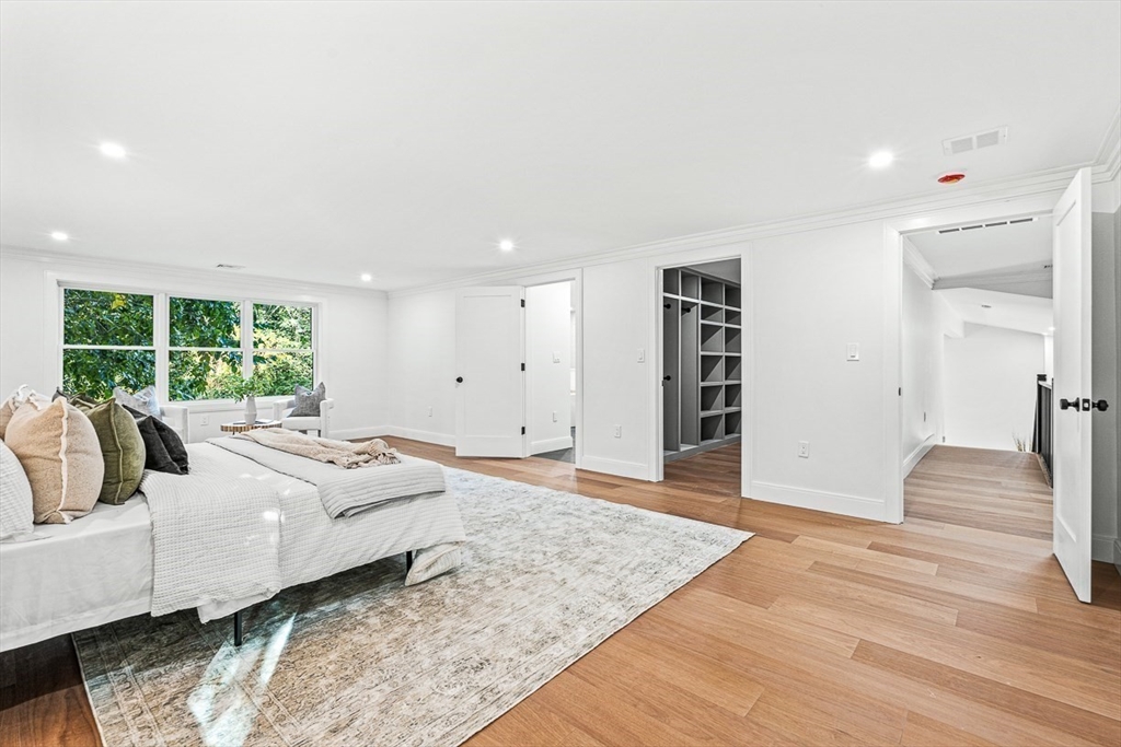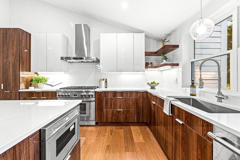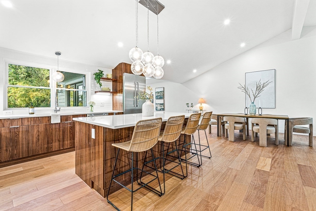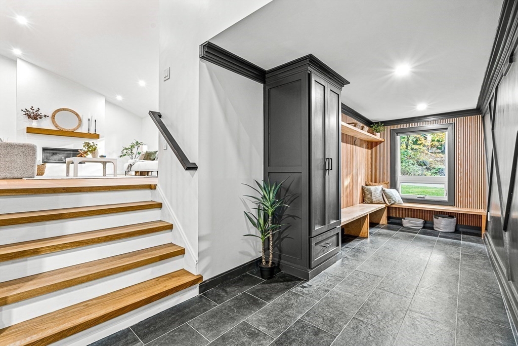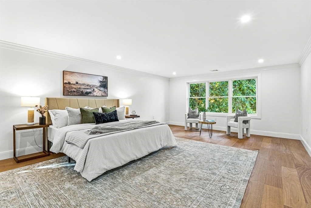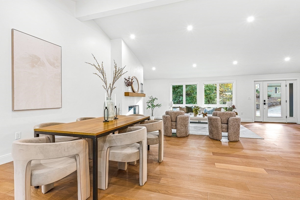 Indulge in modern luxury with this stunning home, set on a double 1/2 acre lot. This 4 bedroom, 4.5-bathroom home seamlessly blends chic style with an abundance of functional space. The architectural design is dramatic, showcasing soaring ceilings, a stunning contemporary fireplace, state of the art kitchen & sun filled living room which opens to a fabulous deck, creating a perfect indoor-outdoor space. The gourmet kitchen features a sleek design w/ a large island, high end appliances, & stylish open shelving. Upstairs, the lavish primary suite features a spa like bath & large custom closet. The 3 additional bedrooms offer ensuite baths. The walk out LL family room w/ wet bar is the perfect space to unwind. This property also features a 2 gar attached garage, mud room, office & laundry room. The double lot offers many possibilities ~ level w/ patio. This home is located near conservation trails, top-rated schools & Boston offering a lifestyle of convenience, luxury & tranquility!