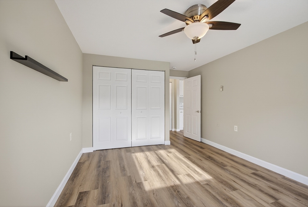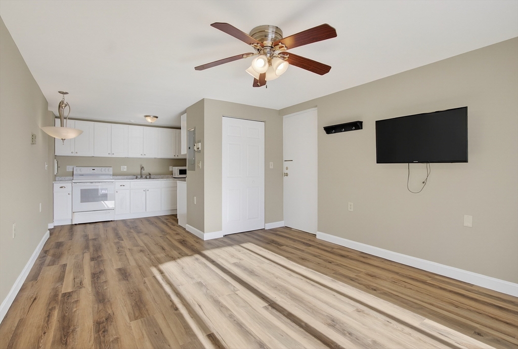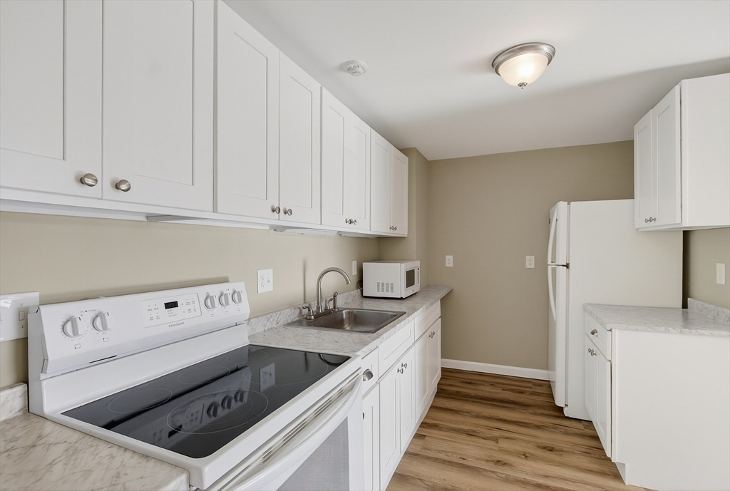 Back on Market! Villa Del Rio offers single-level living, convenient location, and LOW CONDO FEES! Natural light abounds in this 1 bed/1bath unit with an open floor plan with recent vinyl plank flooring into the living room, kitchen and bedroom. The kitchen, with NEW cabinets, NEW countertops, and updated/upgraded electrical and plumbing, is ready for years of happy use! Balcony/deck (overlooking Rockwell Pond) adds extended space this time of year. On site small storage space and laundry in neighboring building. Convenient location to downtown, shopping, restaurants and access to highway or MBTA. Within ¼ mile of public transportation. There is nothing to do but move in. Welcome home!