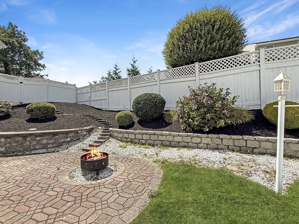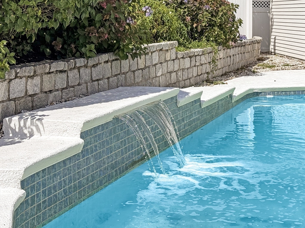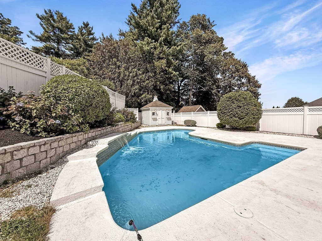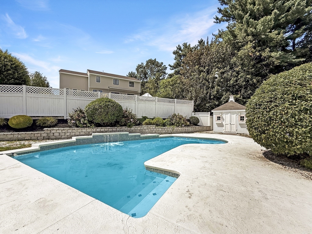 Set high on a double cul-de-sac, this lovingly maintained masterpiece at 5 Blueberry Lane offers three levels of comfort, style, and unique details that make it a truly special place to call home. Enter through a custom glass doorway into a soaring foyer with chandelier and feature windows. The main level boasts a dining room with dimmable chandelier, a French-door office, bright living room with gas fireplace, and a one-of-a-kind kitchen featuring easy-care white cabinets and sparkling Starlight pink Technistone countertops. A charming half-bath completes the level. Upstairs find three bedrooms, full bath, laundry, and a spacious primary suite with wood floors, double-sink vanity, linen closet, and oversized bath. The lower level offers a bedroom, half-bath, closets, and French doors. Outdoors, enjoy a fenced yard with deck, fire pit area, and celebrity-style saltwater pool with waterfall. Updates include new Maytag dishwasher, LG washer/dryer, pool filter, robot, and salt cell.