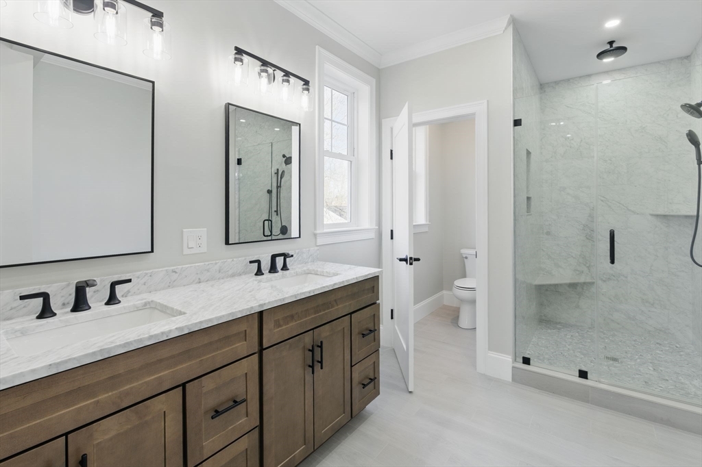 Beautifully staged to showcase its full potential! This stunning new construction in Danvers’ desirable Prep area blends thoughtful design with/ high-end finishes throughout. Privately set, the home offers a spacious layout ideal for both everyday living & entertaining. The chef’s kitchen is a showstopper with 8’ island, quartz counters, GE Café appliances, & walk-in pantry. Enjoy gatherings by the gas fireplace or host in the elegant dining area with/ detailed millwork. Featuring 2 primary suites, 1 on each level, each with/ spa-like baths, marble-topped vanities & rain shower heads. Upstairs offers a vaulted great room, homework/reading nook, 3 additional bedrooms, & a finished 3rd floor for flexible bonus space. Radiant heat in baths & mudroom, 5” white oak floors throughout, Hardie siding, 3-car heated garage, irrigation & roughed-in plumbing in the basement for future expansion. A rare blend of luxury, space & location.