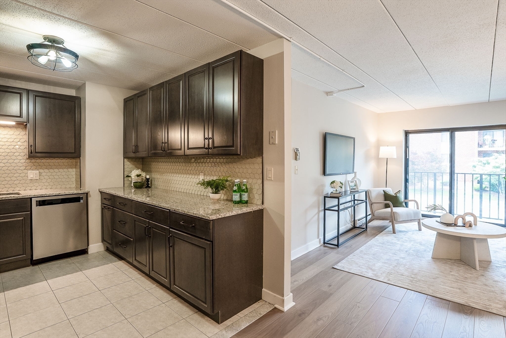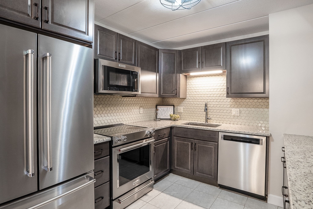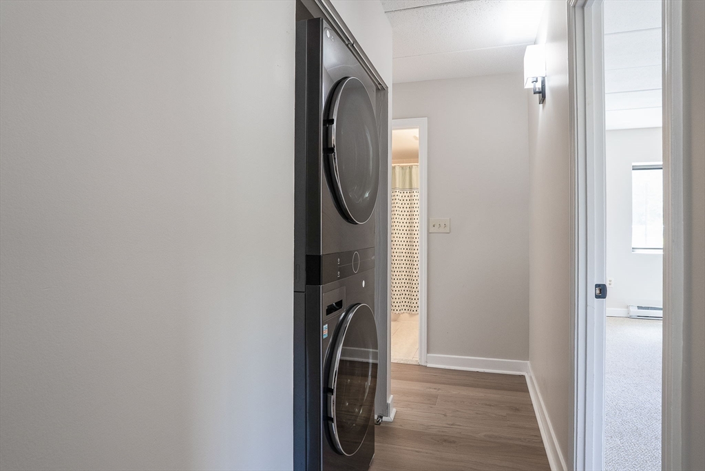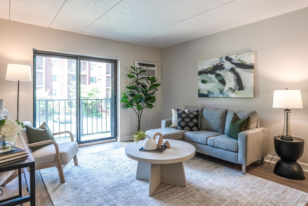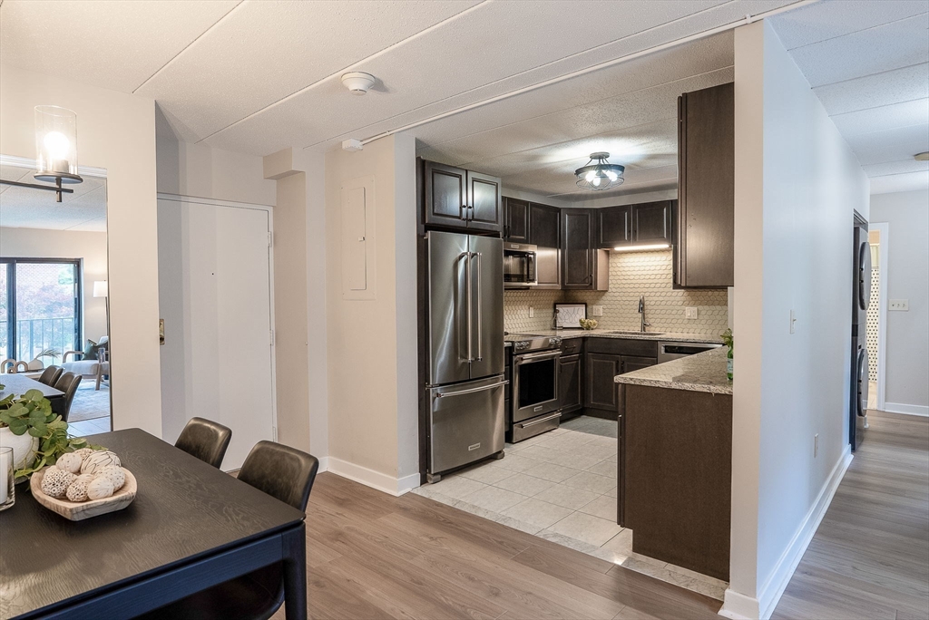 Stylishly renovated 2-bedroom, 2-bath condo—move-in ready! Open-concept design features gleaming new laminate floors flowing from dining to spacious living room. Chef's kitchen boasts stainless steel appliances, granite countertops, and sleek modern finishes. Primary suite includes ensuite bath and walk-in closet, plus both bedrooms feature plush new carpeting. Convenient in-unit laundry! Steps from MBTA commuter rail at Melrose Highlands for quick Boston access. Easy vehicle access off I-93, with Routes 1 and 95 nearby for convenient commuting. Foodies enjoy nearby dining in Stoneham Center, Melrose, and Wakefield. Nature lovers appreciate quick access to parks trails and Lake Quannapowitt! Solid brick construction with elevator access adds convenience and durability. Quality finishes and a prime location!
