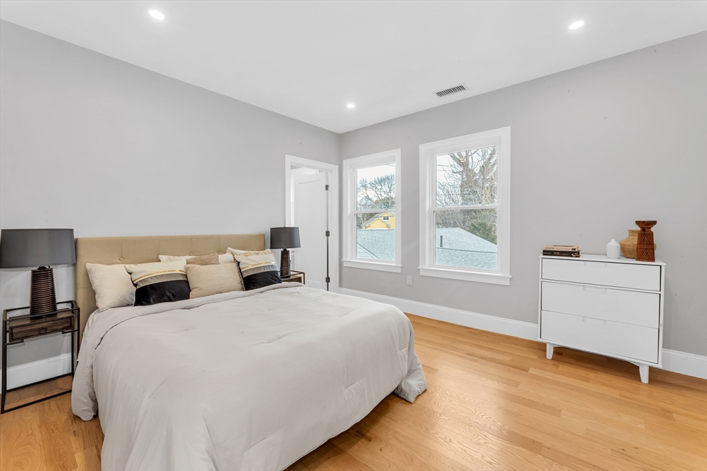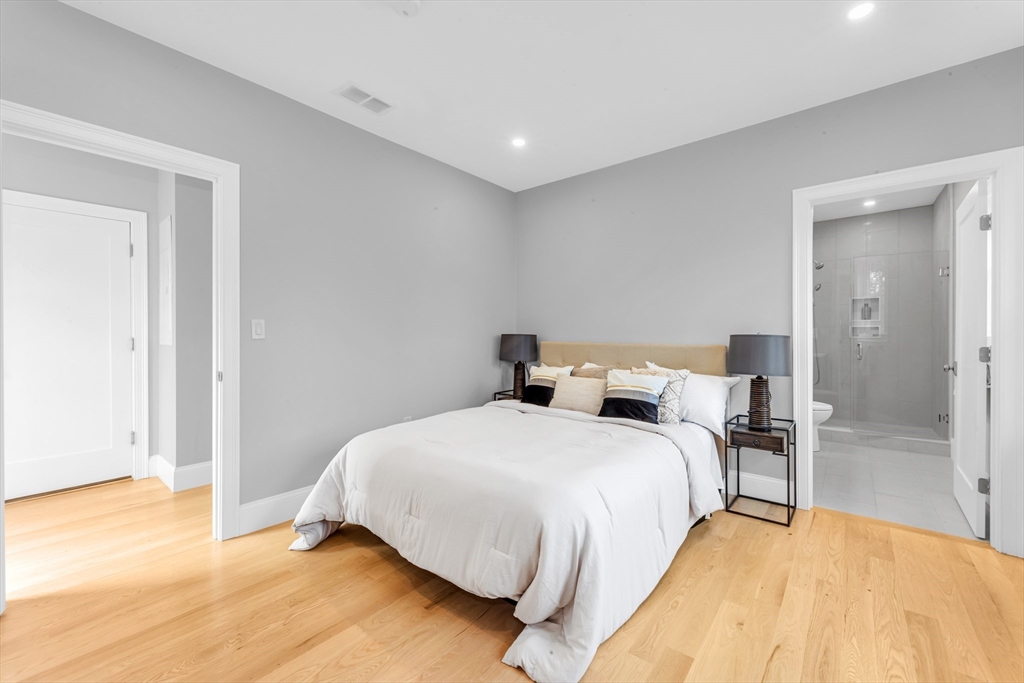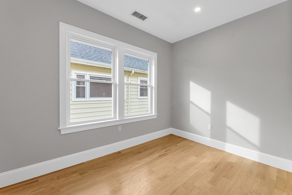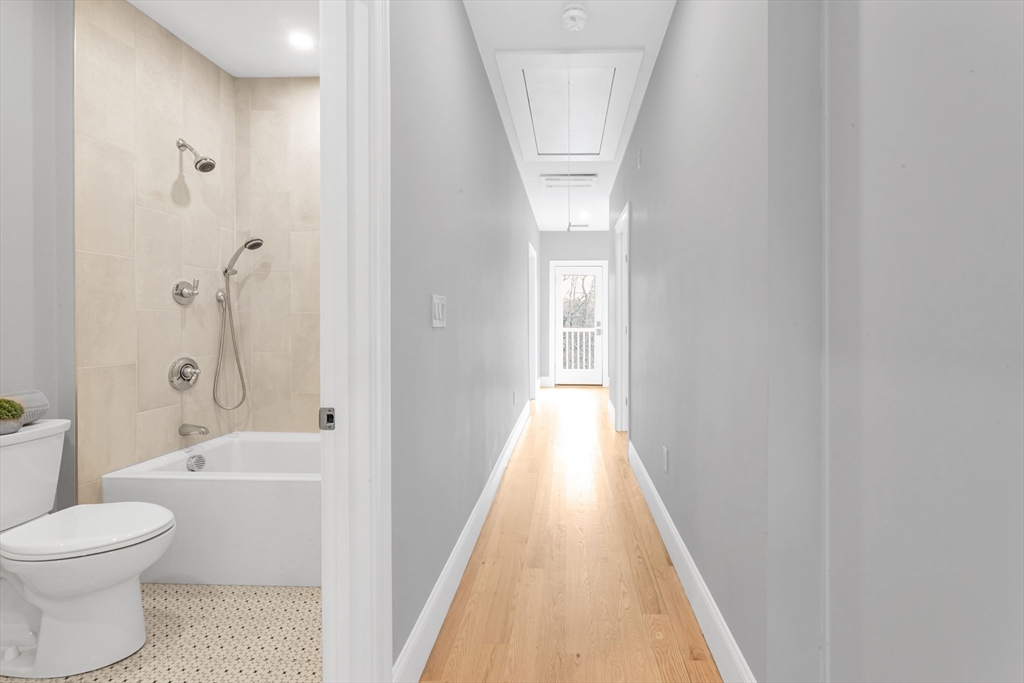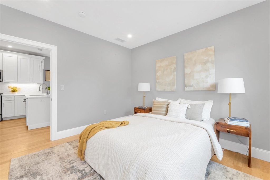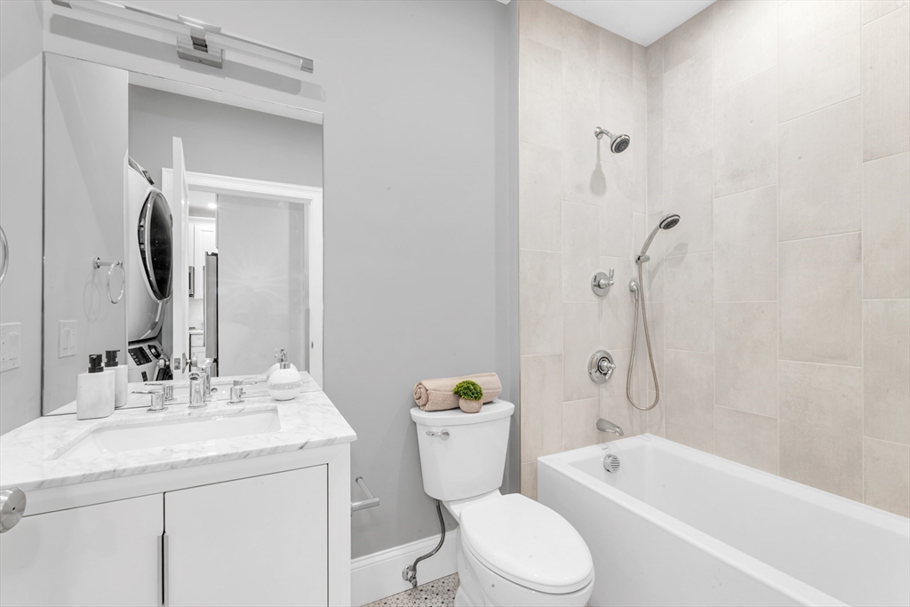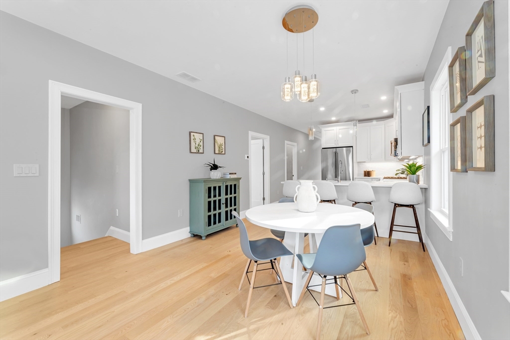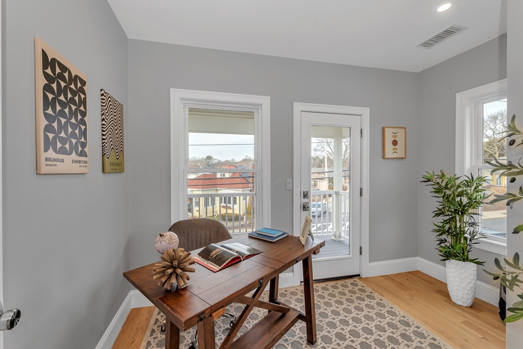 Bright, beautifully renovated, and truly spacious—this move-in-ready Roslindale condo lives like a home. Three generous bedrooms PLUS a sunlit front office with porch access deliver real flexibility for WFH, guests, gym, or playroom. A private primary suite features great closets and an en-suite bath with a sleek shower. The open-concept kitchen is the centerpiece with GE Café appliances, chef-style gas range, and a breakfast bar that seats four—perfect for entertaining. Hardwood floors, updated systems, and high-efficiency heating & cooling bring modern comfort with low-maintenance ease. In-unit laundry, garage parking + an additional outdoor spot, and shared common outdoor space. Plenty of storage with pull-down attic storage plus dedicated basement storage.