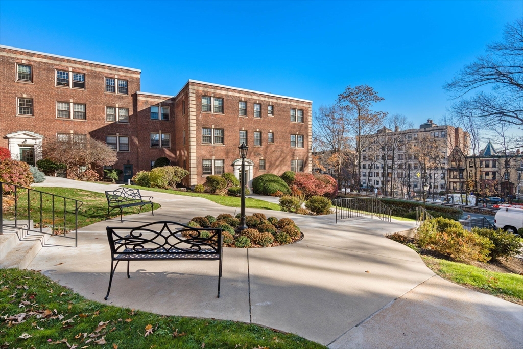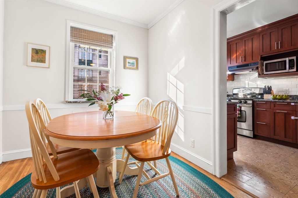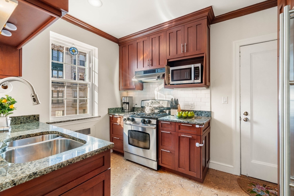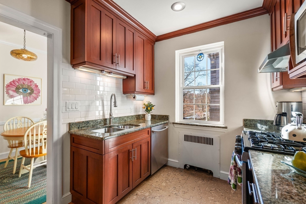 Welcome to 1500 Beacon St, Residence #3 - a spacious 2 bedroom condo with parking nestled in the heart of Brookline, perfectly positioned between Coolidge Corner and Washington Sq. This corner home is situated on the elevated side of Beacon and boasts south, east, and west exposures. Upon entering, you're greeted by a gracious foyer with high ceilings, natural light and hardwood floors leading to an impressively large living room. The bright dining room connects to the kitchen, featuring a recently updated backsplash, high-end cherry cabinets, granite countertops, double sink, stainless steel appliances, and gas cooking. The 2 bedrooms are generously sized with ample closet space. The full bathroom is appointed with granite vanity, separate walk-in marble shower and bathtub. 1 Deeded parking space and additional storage included. Recent updates: new energy-efficient windows (2022) and new roof (2023). Heat/Hot water incl. in condo fee. Professionally managed & pet friendly association.