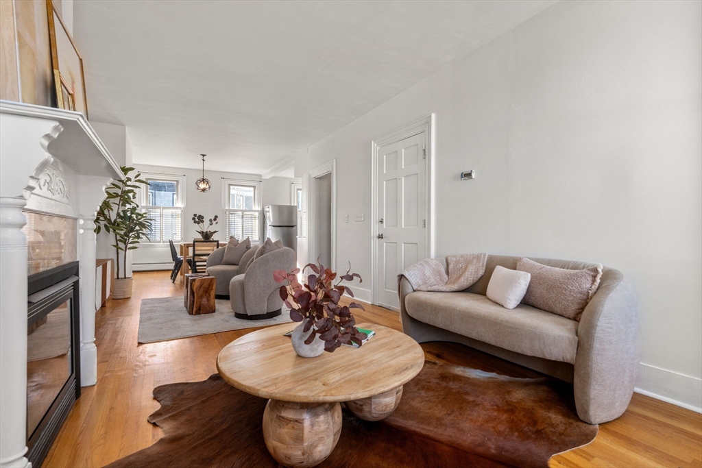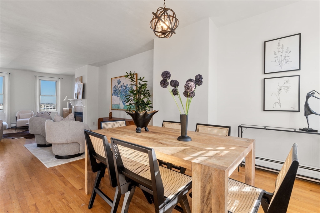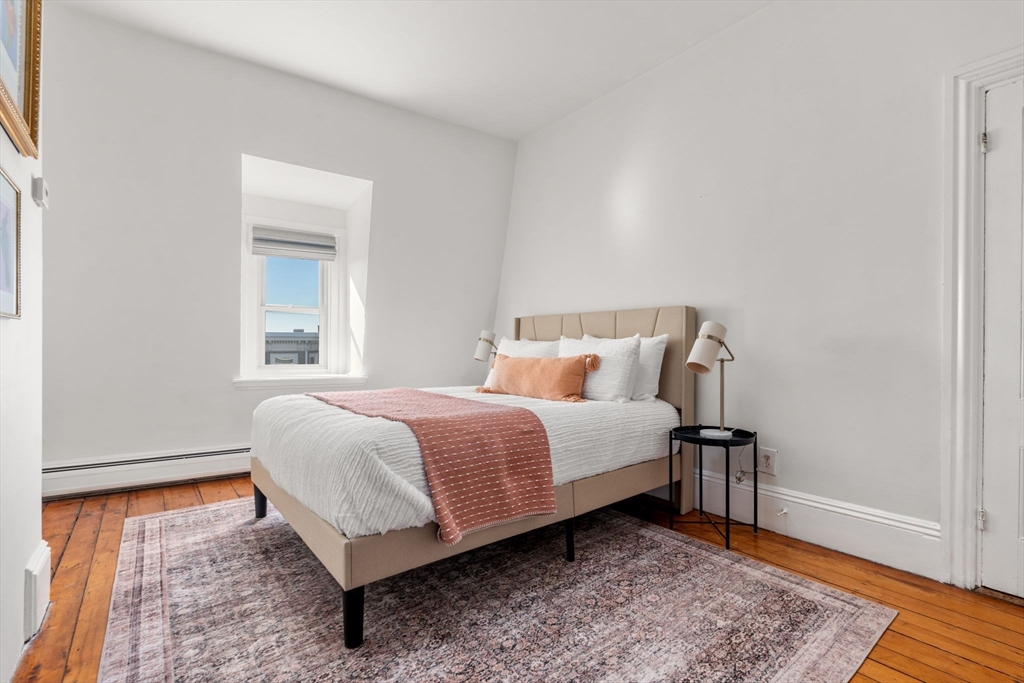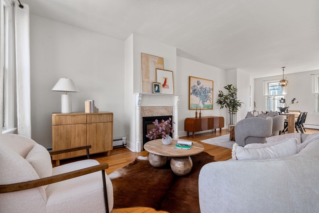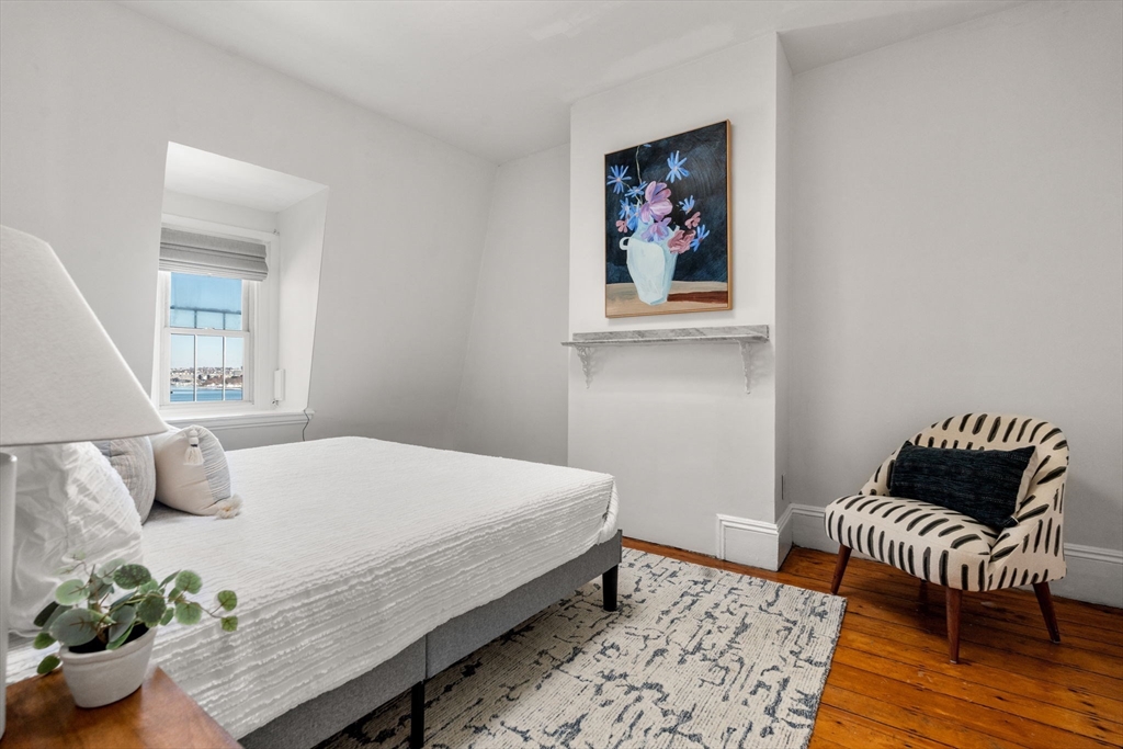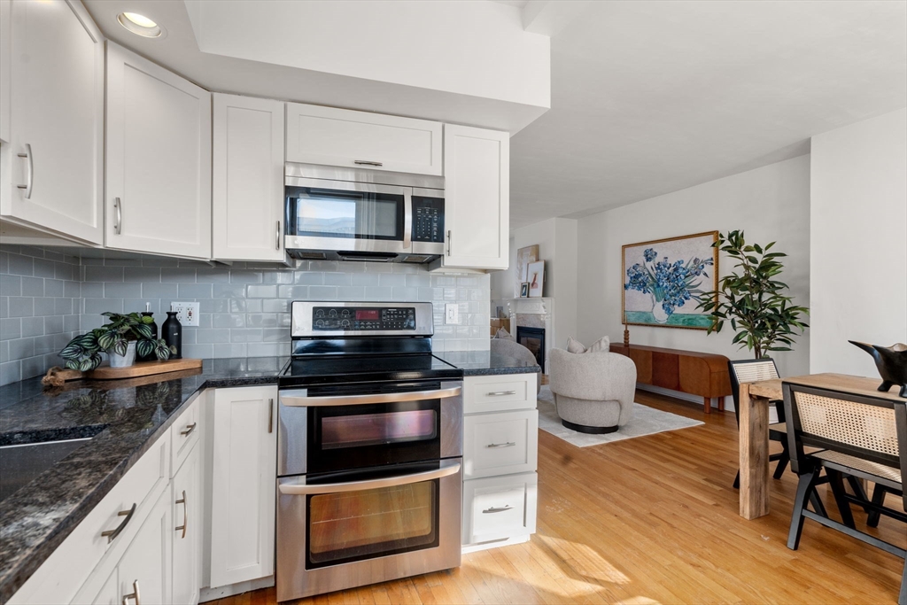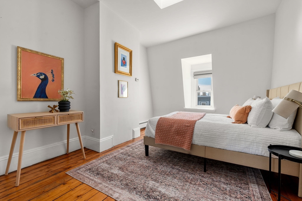 Sunny penthouse duplex in Charlestown! This 2+/3BD, 2BA home, perched atop Bunker Hill Street, offers abundant natural light, hardwood floors and a spacious open layout. The first level features an expansive living and dining area with gas fireplace and windows with northern and southern exposure. The adjacent kitchen boasts white cabinetry, stainless steel appliances and dark granite countertops. A renovated full bath includes stylish gray floor tiles, a walk-in shower with a frameless glass enclosure, marble tile and a Carrera-topped vanity. Upstairs, you'll find another full bath with a tub, two generously sized bedrooms accommodating queen/king beds, and a bonus 11' x 7' room with a window and closet, perfect as an office or nursery. Additional highlights include multiple skylights, ensuite laundry and excellent storage. Just moments to public transportation, parks, restaurants and shops in Historic Charlestown, this sun-filled condo combines light, space and unbeatable convenience