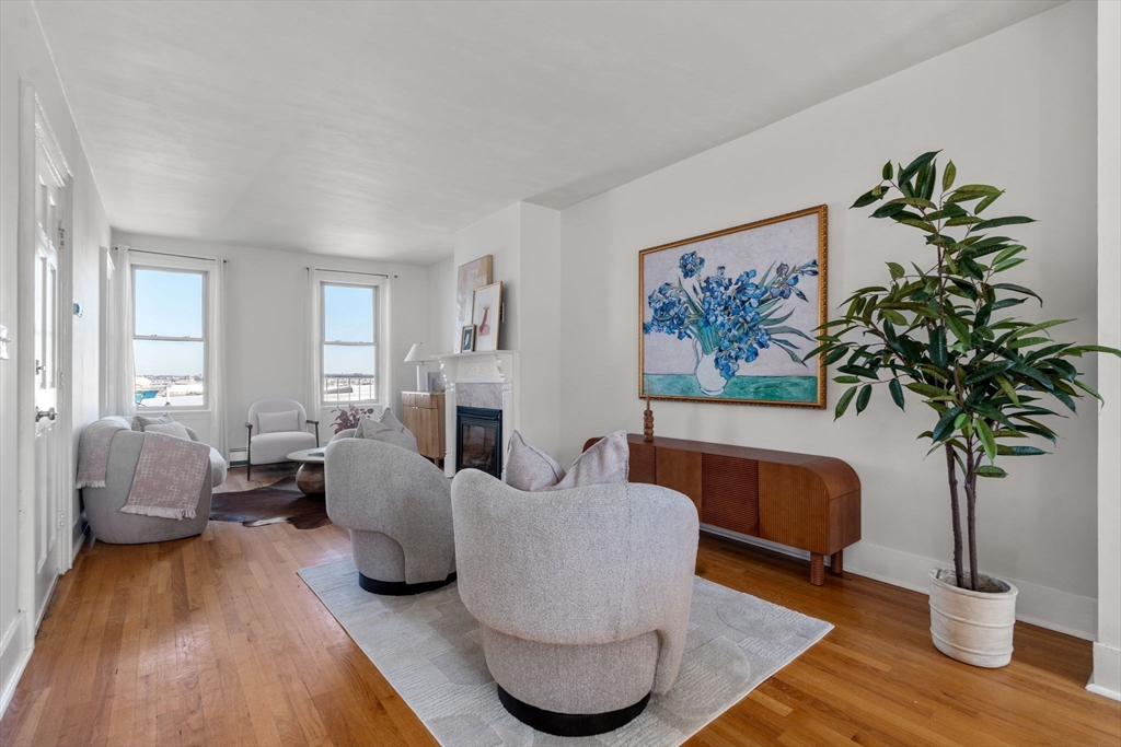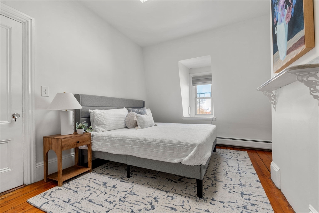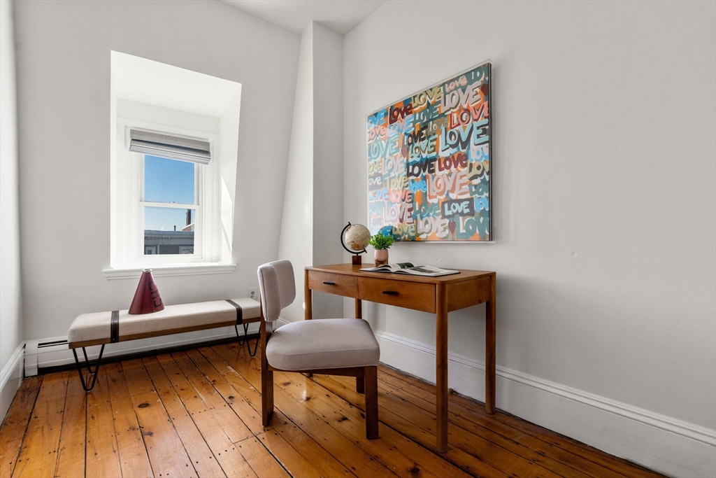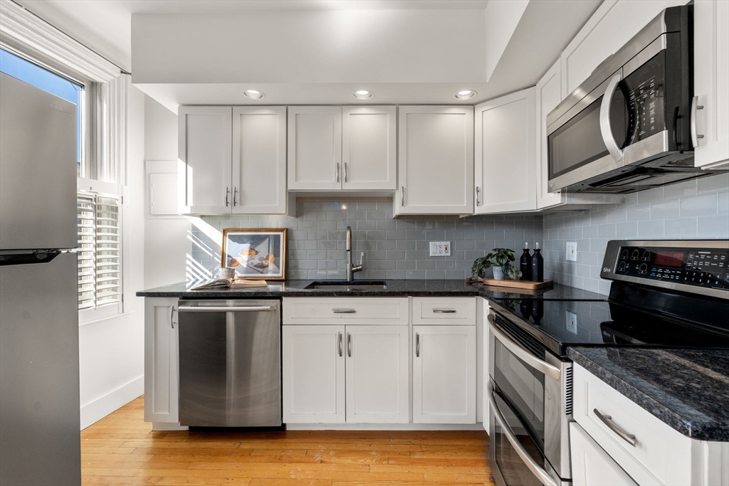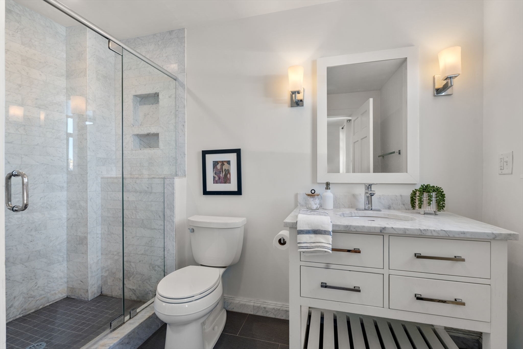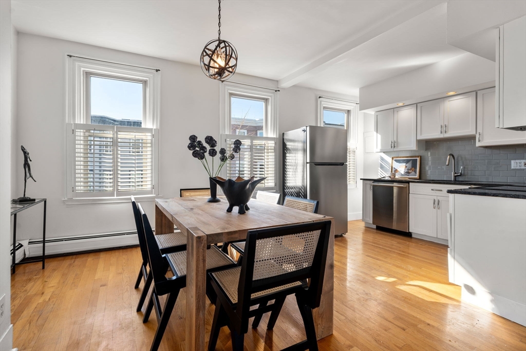 Sunny penthouse duplex in Charlestown! This 2+/3BD, 2BA home, perched atop Bunker Hill Street, offers abundant natural light, hardwood floors and a spacious open layout. The first level features an expansive living and dining area with gas fireplace and windows with northern and southern exposure. The adjacent kitchen boasts white cabinetry, stainless steel appliances and dark granite countertops. A renovated full bath includes stylish gray floor tiles, a walk-in shower with a frameless glass enclosure, marble tile and a Carrera-topped vanity. Upstairs, you'll find another full bath with a tub, two generously sized bedrooms accommodating queen/king beds, and a bonus 11' x 7' room with a window and closet, perfect as an office or nursery. Additional highlights include multiple skylights, ensuite laundry and excellent storage. Just moments to public transportation, parks, restaurants and shops in Historic Charlestown, this sun-filled condo combines light, space and unbeatable convenience