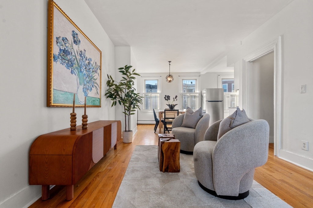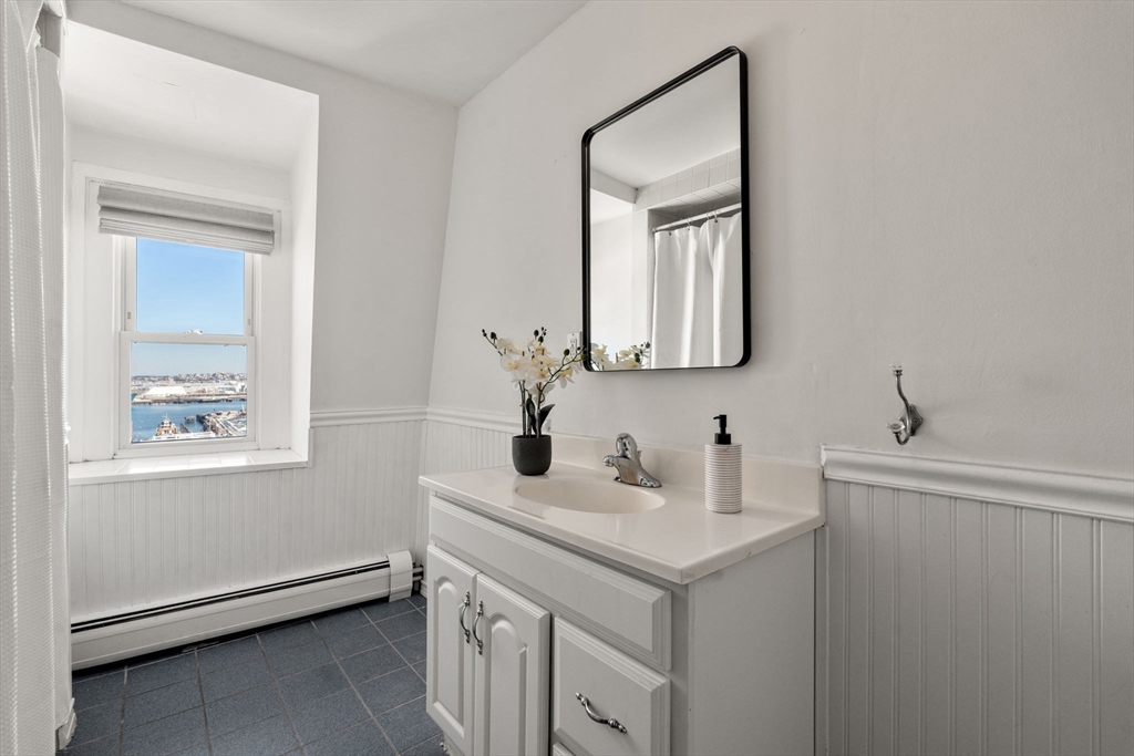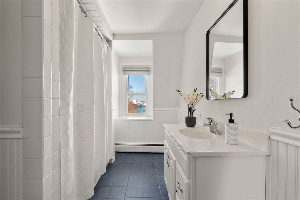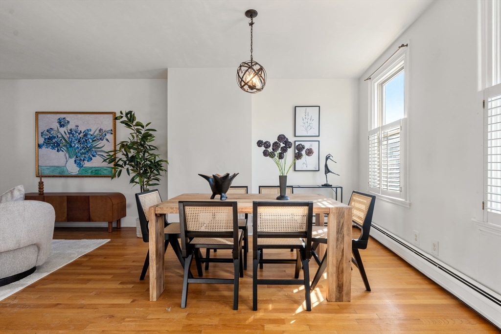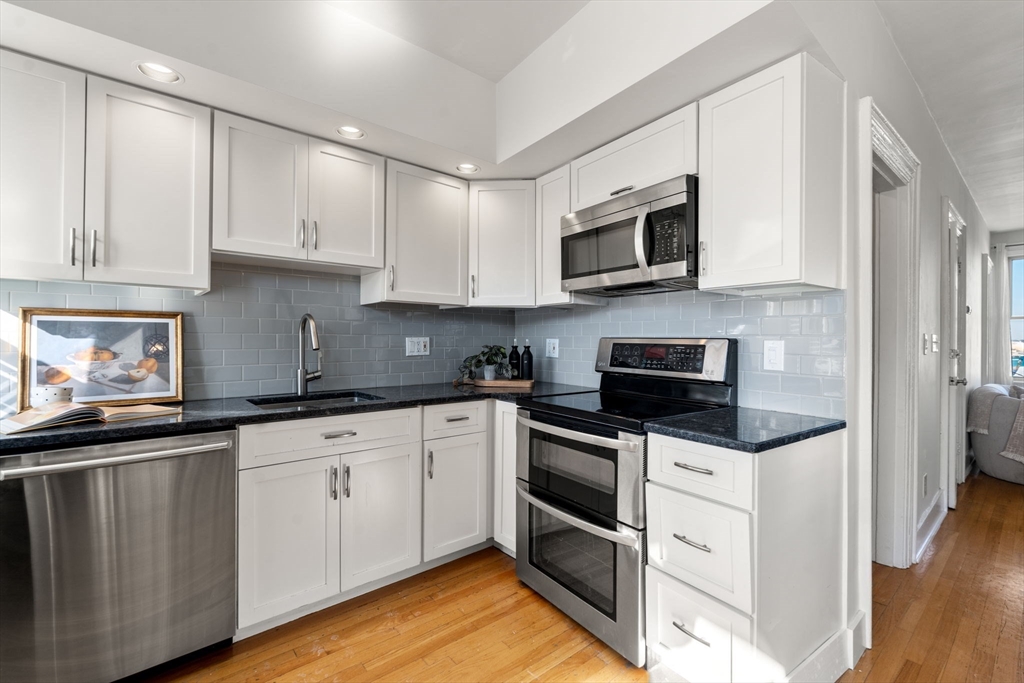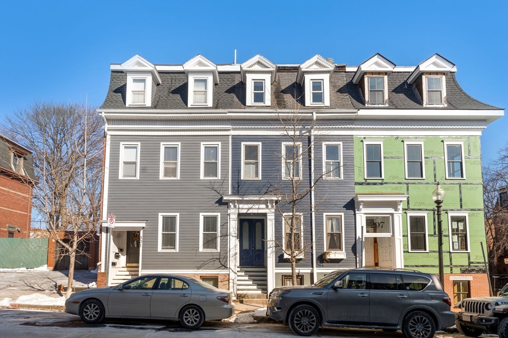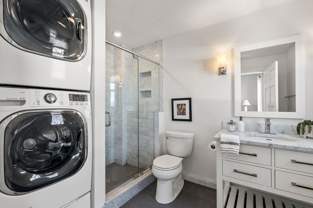 Sunny penthouse duplex in Charlestown! This 2+/3BD, 2BA home, perched atop Bunker Hill Street, offers abundant natural light, hardwood floors and a spacious open layout. The first level features an expansive living and dining area with gas fireplace and windows with northern and southern exposure. The adjacent kitchen boasts white cabinetry, stainless steel appliances and dark granite countertops. A renovated full bath includes stylish gray floor tiles, a walk-in shower with a frameless glass enclosure, marble tile and a Carrera-topped vanity. Upstairs, you'll find another full bath with a tub, two generously sized bedrooms accommodating queen/king beds, and a bonus 11' x 7' room with a window and closet, perfect as an office or nursery. Additional highlights include multiple skylights, ensuite laundry and excellent storage. Just moments to public transportation, parks, restaurants and shops in Historic Charlestown, this sun-filled condo combines light, space and unbeatable convenience