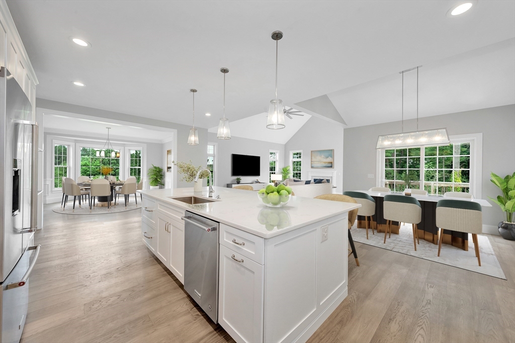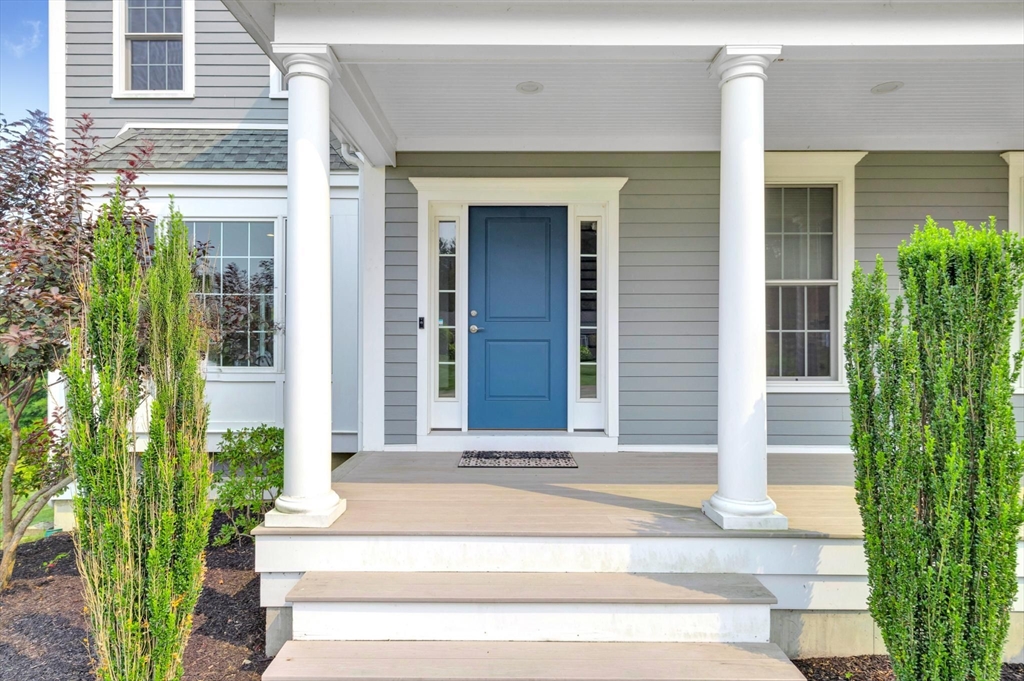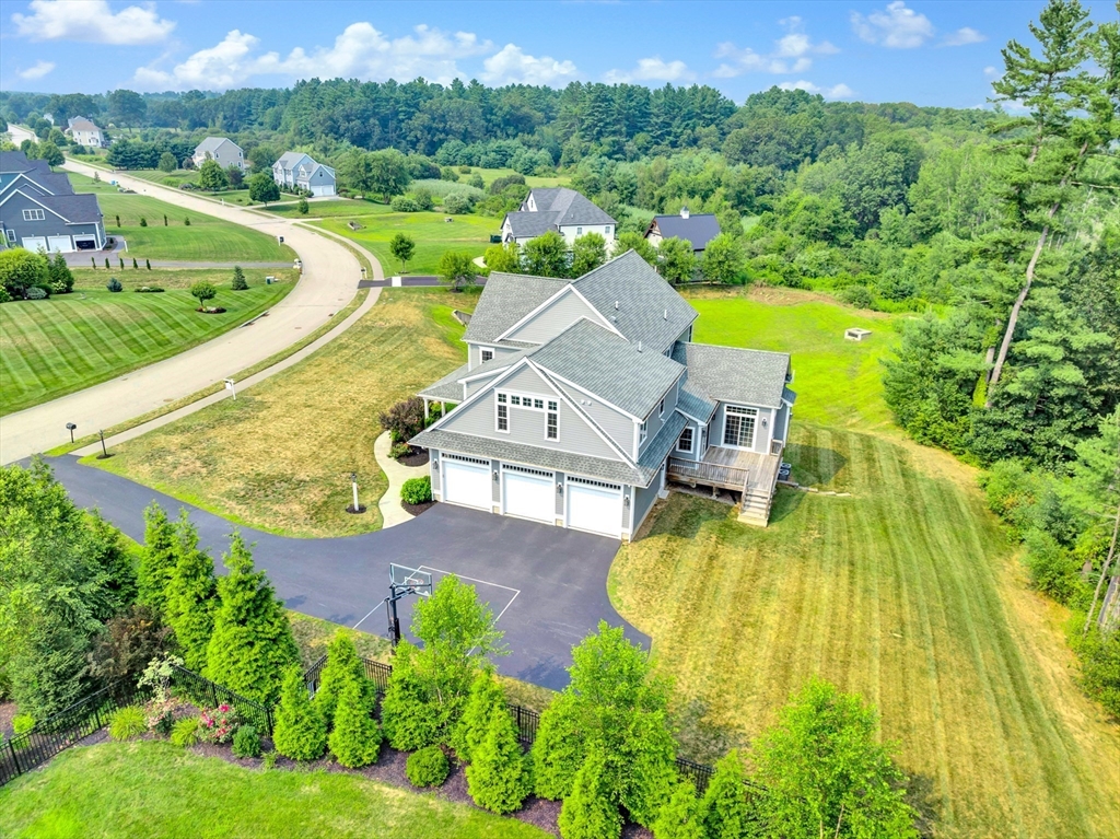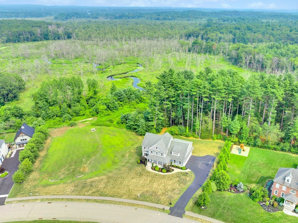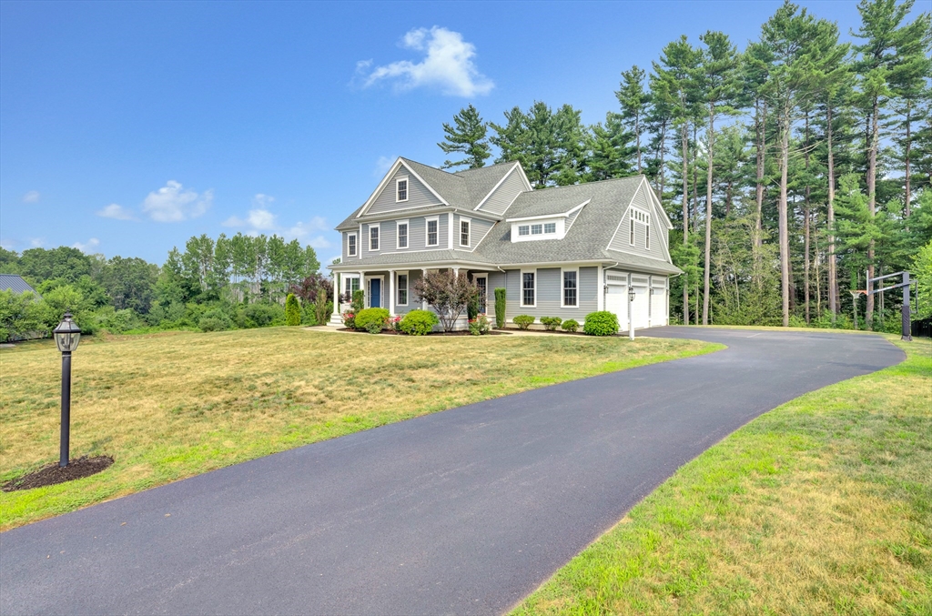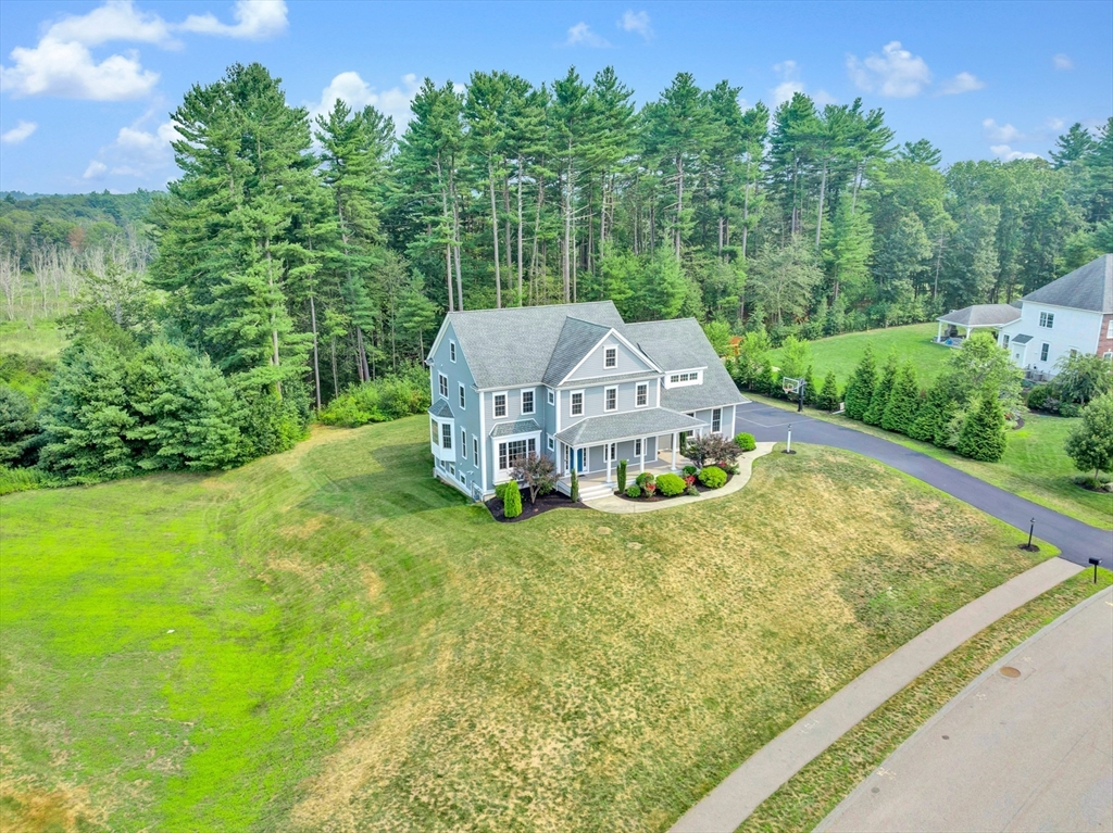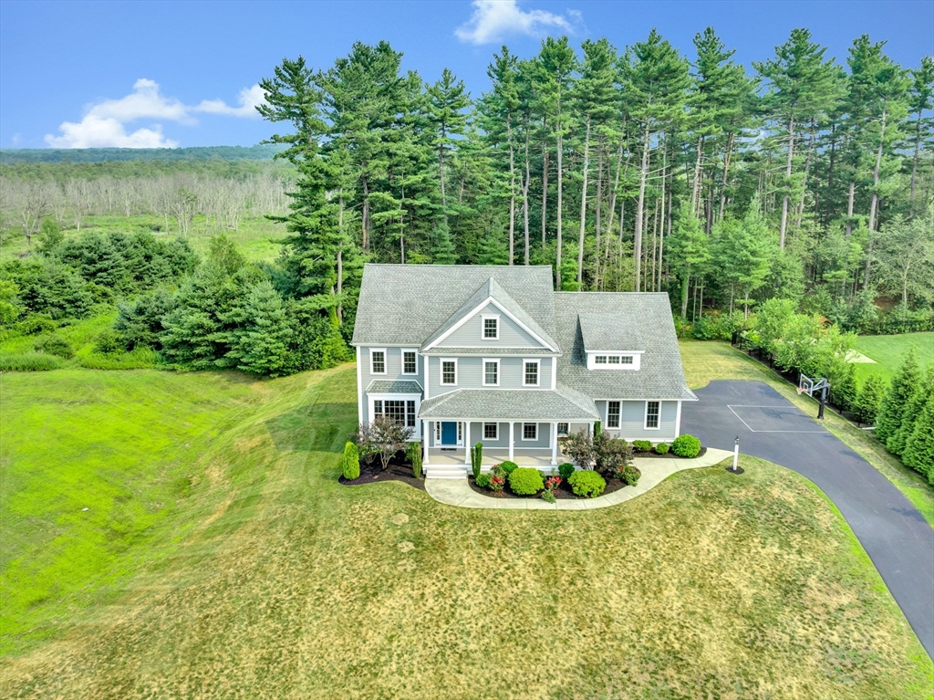 Welcome home to this stylish, young custom home located in a premier neighborhood & sited on a majestic 2.5-acre lot w/amazing views & direct access to conservation land & a canoe launch! An expansive porch ushers you to an airy foyer w/split staircase & private office. Both living & dining rooms are well appointed w/moldings & many windows providing great light & scenic views. Enjoy the modern, open concept kitchen w/white cabinets, endless counter space, crisp lines & sleek fixtures. The focal point is a massive center island w/Quartz counters & ample space for cooking & gathering. Plus, the dining area & family room w/cathedral ceiling & fireplace - each w/access to the deck from sliders. Mudroom w/cubbies & closets leads to side entry & 3-car gar. 2nd floor features an impressive primary suite w/high ceilings, windows & spa-like bath w/double vanities & make up table plus huge closet. Three add'l bedrooms, one w/2nd full bath. Bonus area, 3rd full bath & laundry. Stunning!