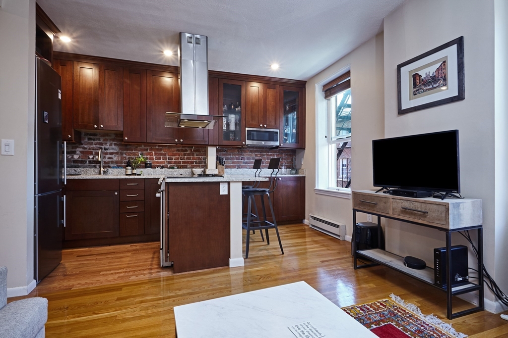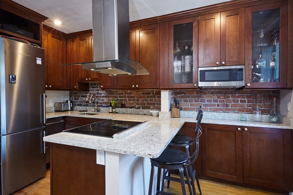 Now is your chance to own an updated, spacious one bedroom condo located on highly desirable Fleet Street ,ideally located between the North End and Waterfront. This open concept unit has a new kitchen with top of the line appliances inc. Bosch dishwasher/stove & Liebherr refrigerator, range hood, recessed lighting, brick backsplash and custom cabinetry. A granite breakfast bar with seating for two is conveniently incorporated into the chef's kitchen. A corner bar with cabinetry allows for easy entertaining. This cozy apartment boasts wood floors and has ample sunlight pouring in from multiple windows. Master carpeted bedroom has large his/her closets extending the length of the room. In unit stackable washer/dryer. Professionally managed building. Private basement storage (approx. 4 X 6). Enjoy grilling from the rear common patio during the summer. Easy walk to public transportation, financial district and the many beloved restaurants of the North End and Waterfront.