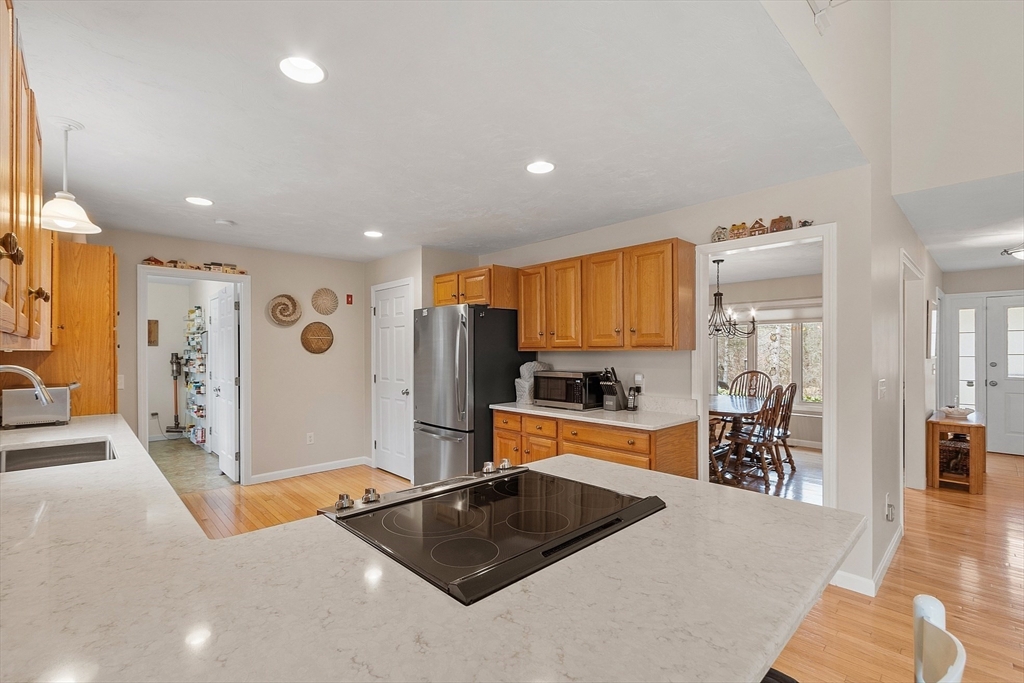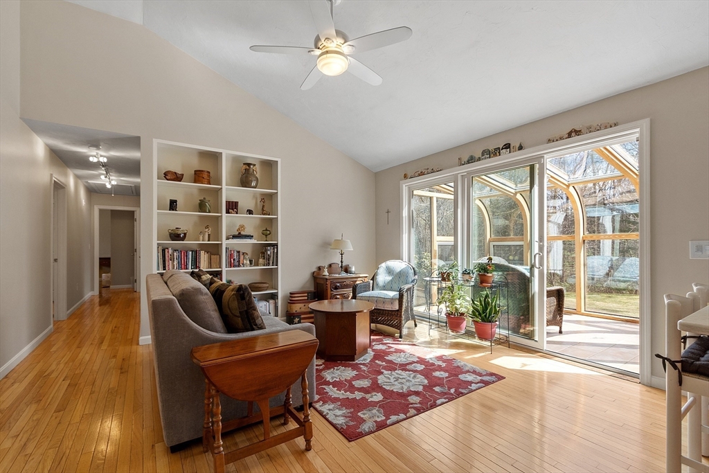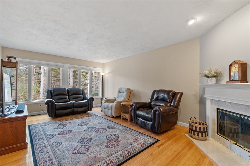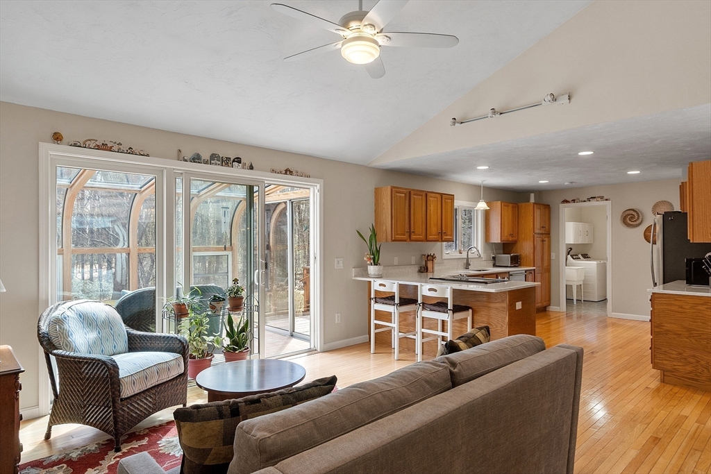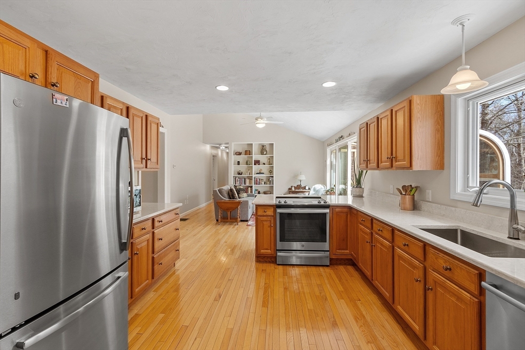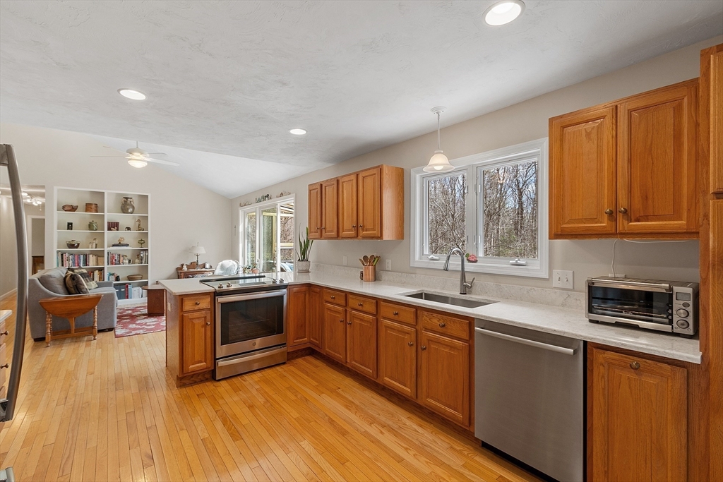 Welcome to this open floor plan three bedroom, 2 bath ranch with large living room w/fireplace; open cathedral ceiling family room adjacent to stainless steel applianced kitchen with quartz counter, Blanco sink with touch faucet, Brady Sun addition off family room overlooking beautiful backyard with privacy. The new master full bath is gorgeous and the hardwood floors sparkle! This oversized ranch also has a 2024 roof, is vynal sided for easy maintenance and has State woods across the street for extra peace and quiet. This one won't laste!