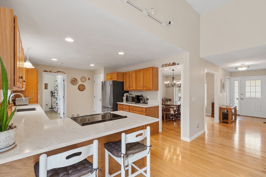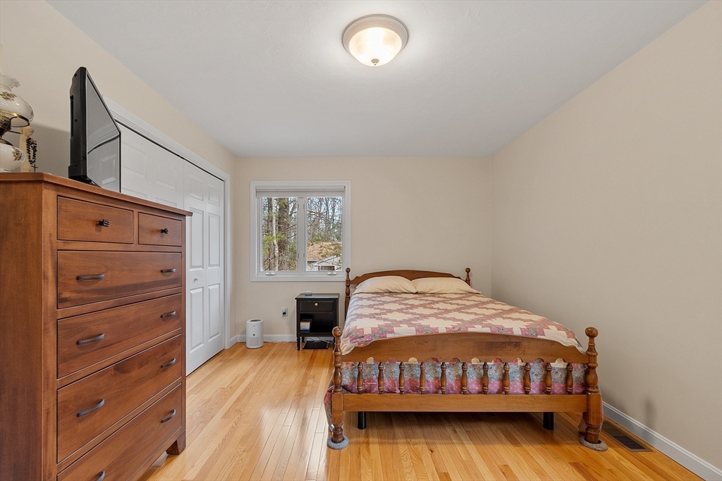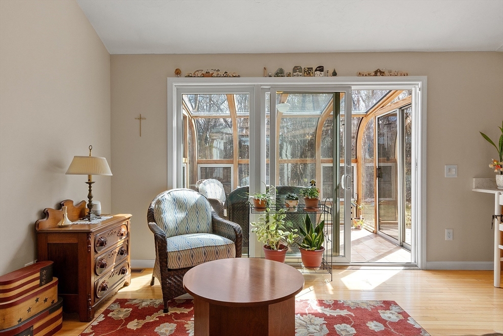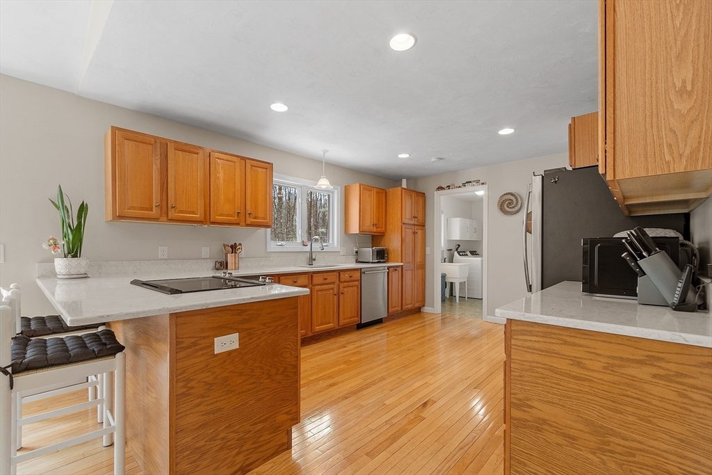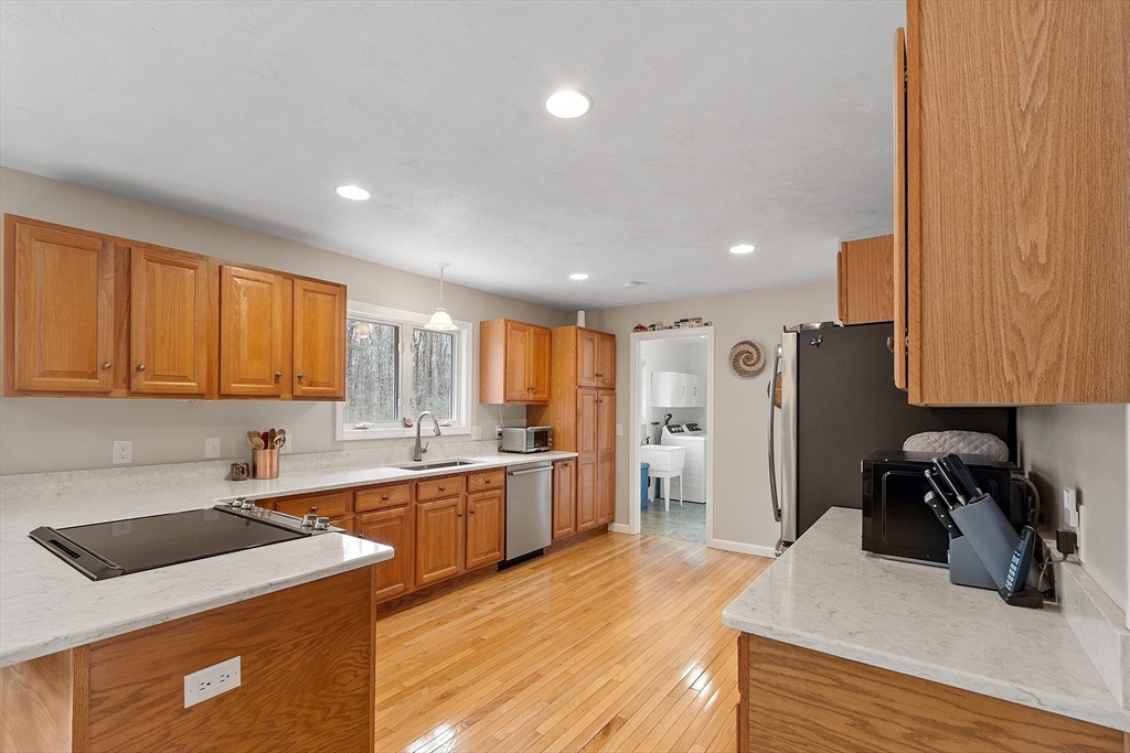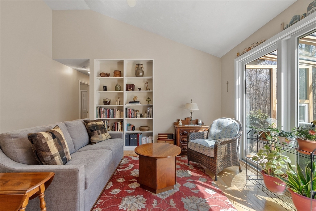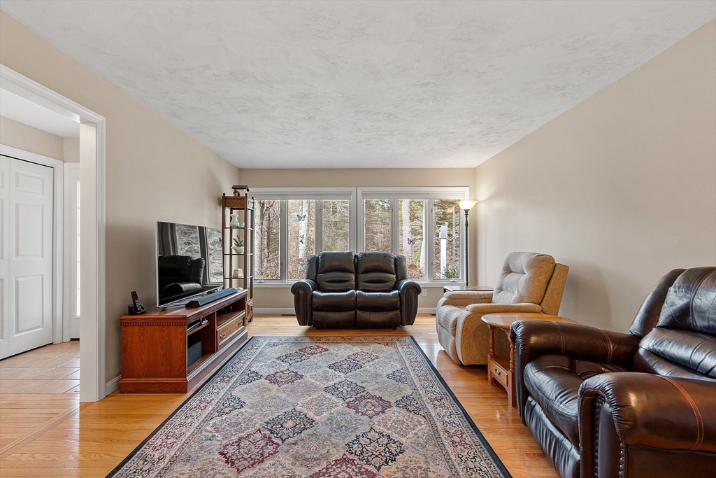 Welcome to this open floor plan three bedroom, 2 bath ranch with large living room w/fireplace; open cathedral ceiling family room adjacent to stainless steel applianced kitchen with quartz counter, Blanco sink with touch faucet, Brady Sun addition off family room overlooking beautiful backyard with privacy. The new master full bath is gorgeous and the hardwood floors sparkle! This oversized ranch also has a 2024 roof, is vynal sided for easy maintenance and has State woods across the street for extra peace and quiet. This one won't laste!
