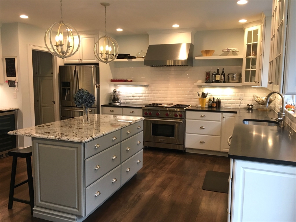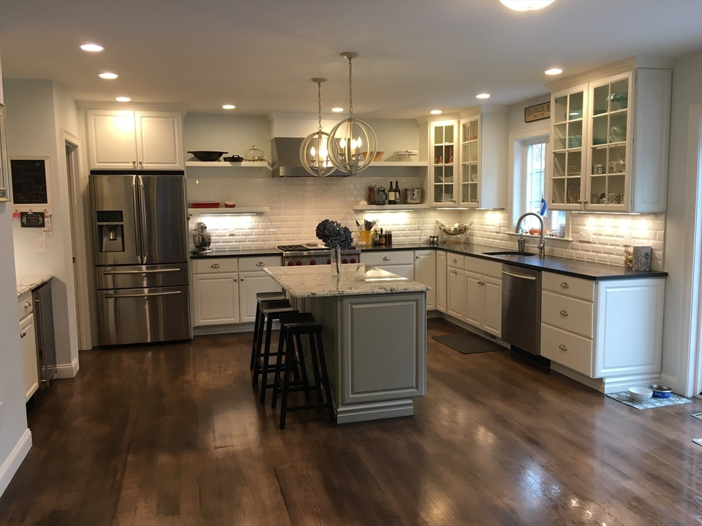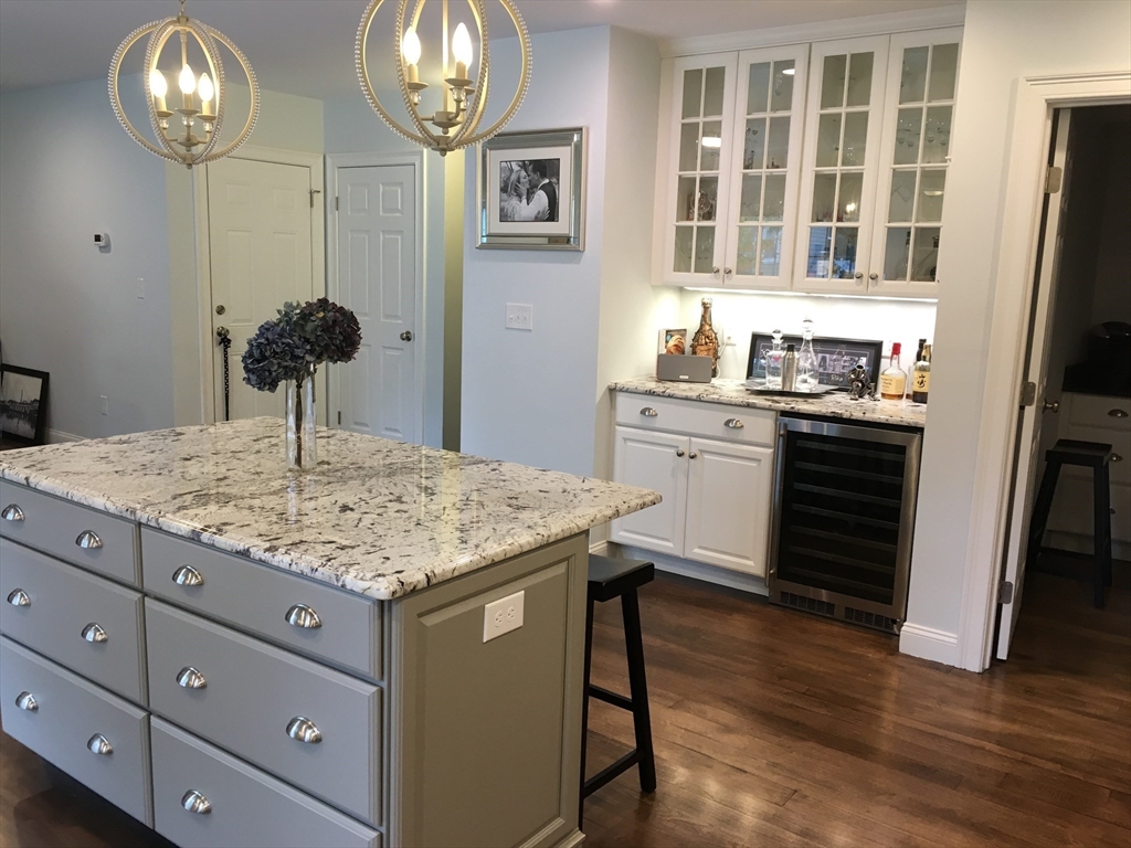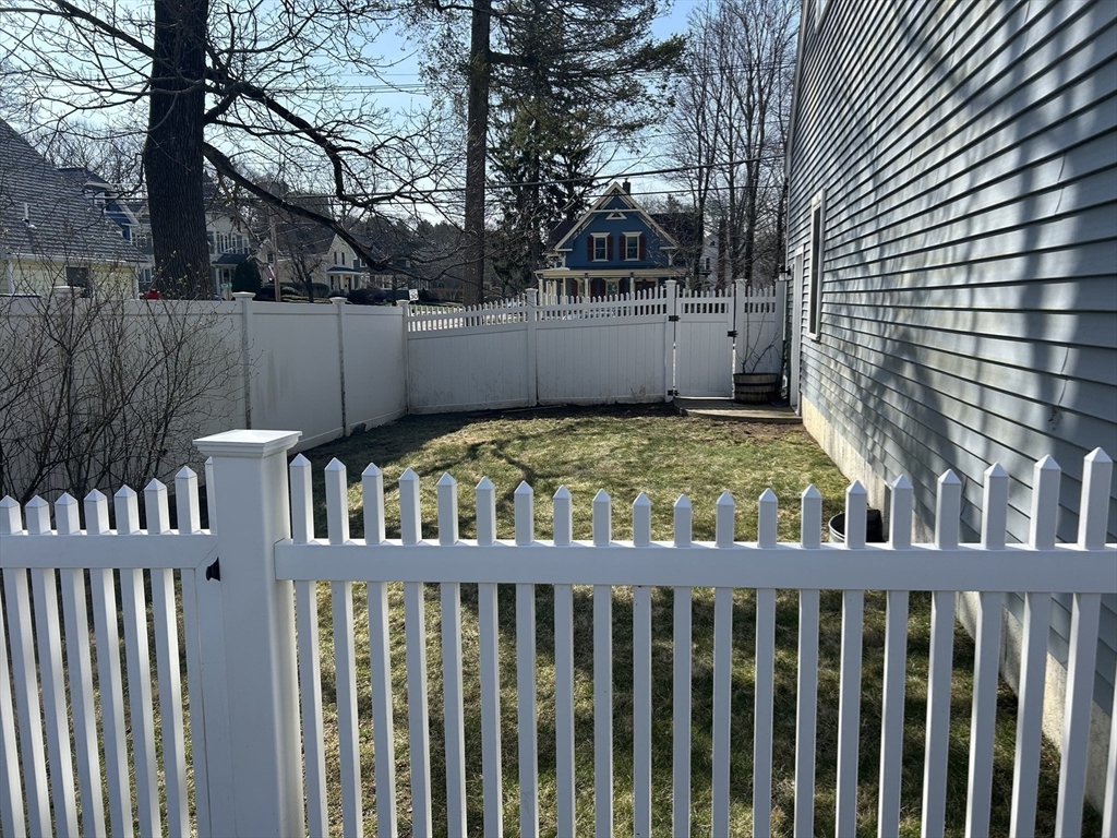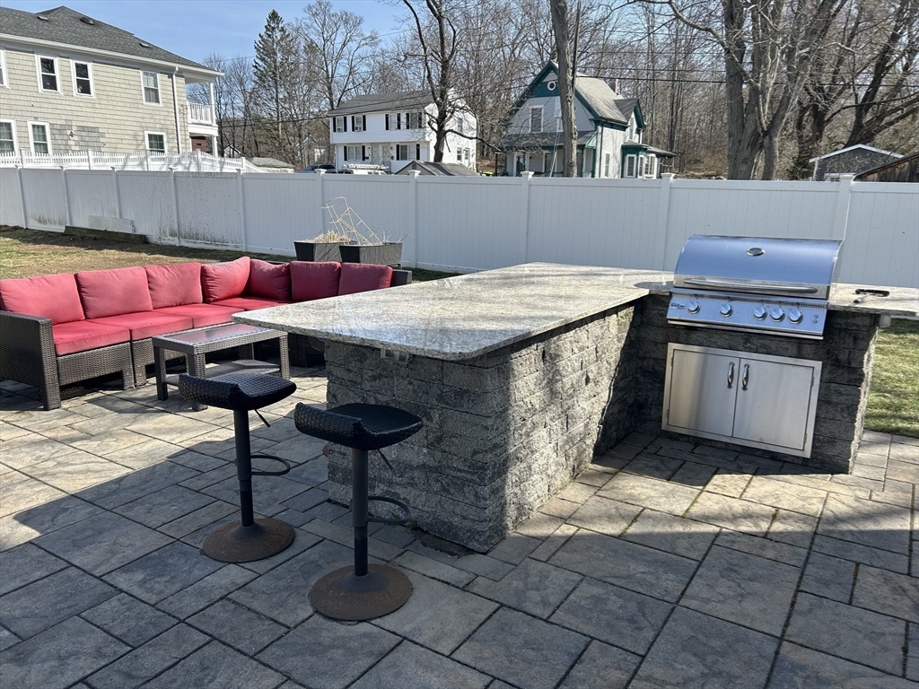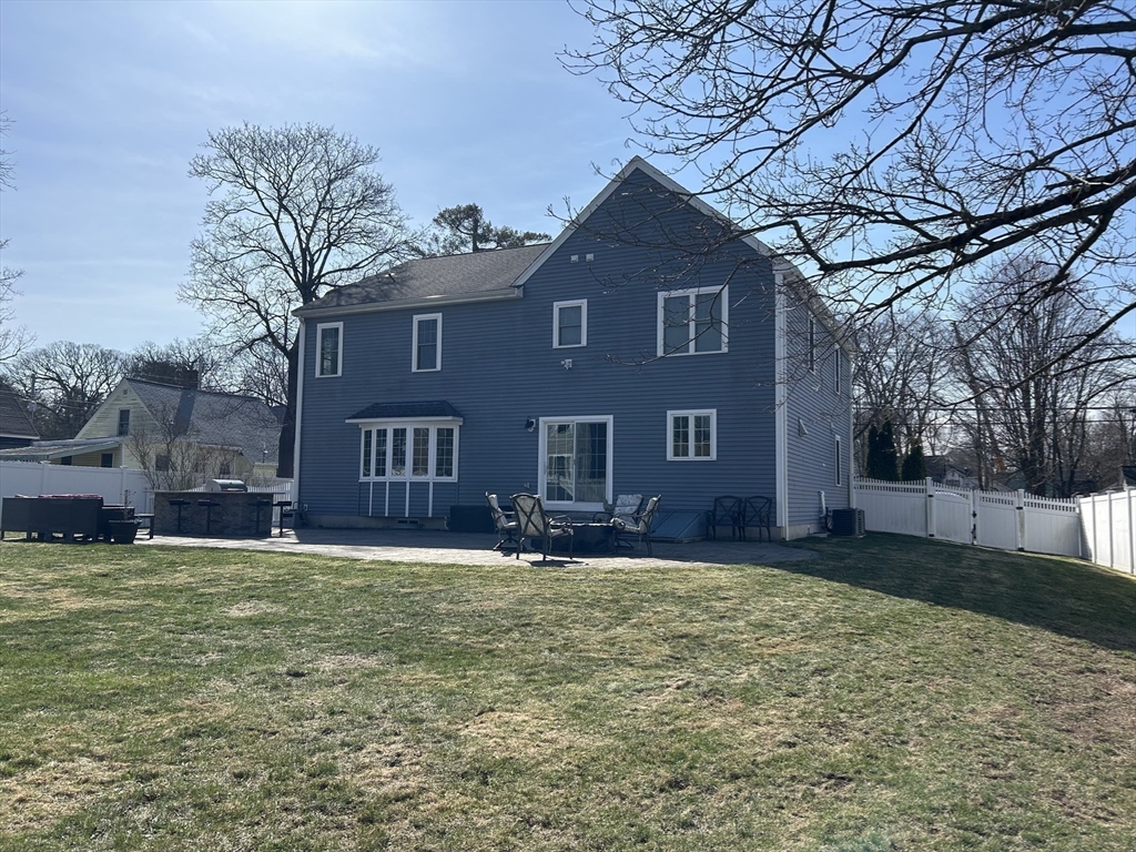 Welcome to a masterpiece of quality, contemporary flare. This 4 bedroom, 2-1/2 bath with a chef's kitchen and hardwood floors makes for a bright, gleaming family life with entertaining space. The attached two car garage offers a convenient entry with plenty of storage. Just down the hall is a bright office or sitting room. Walk out onto the patio with a fenced-in yard. Find a stone, natural gas fire pit and a beauty of an outside kitchen featuring a gas grill with granite countertops. This is perfect for a relaxing evening under the stars or an afternoon grilling! Upstairs we have 3 good sized bedrooms, a full bath, and a primary bedroom with its own tiled bathroom with both a bathtub and shower stall. Easy access to major highways and T station. Every convience you need in your new home.
