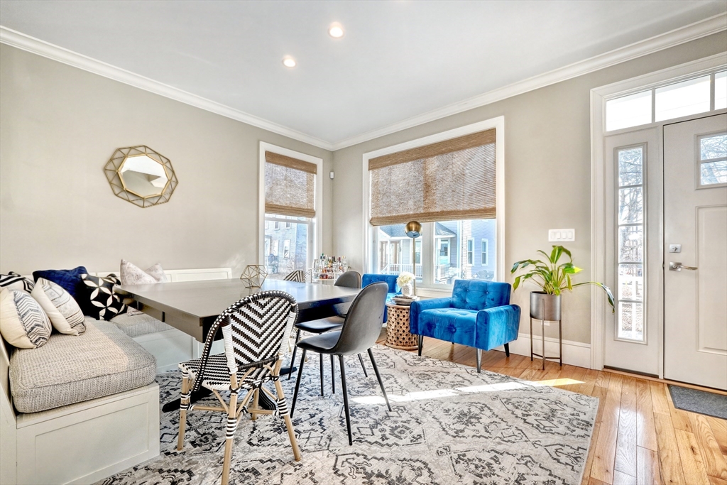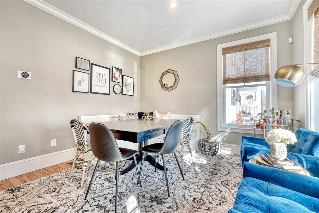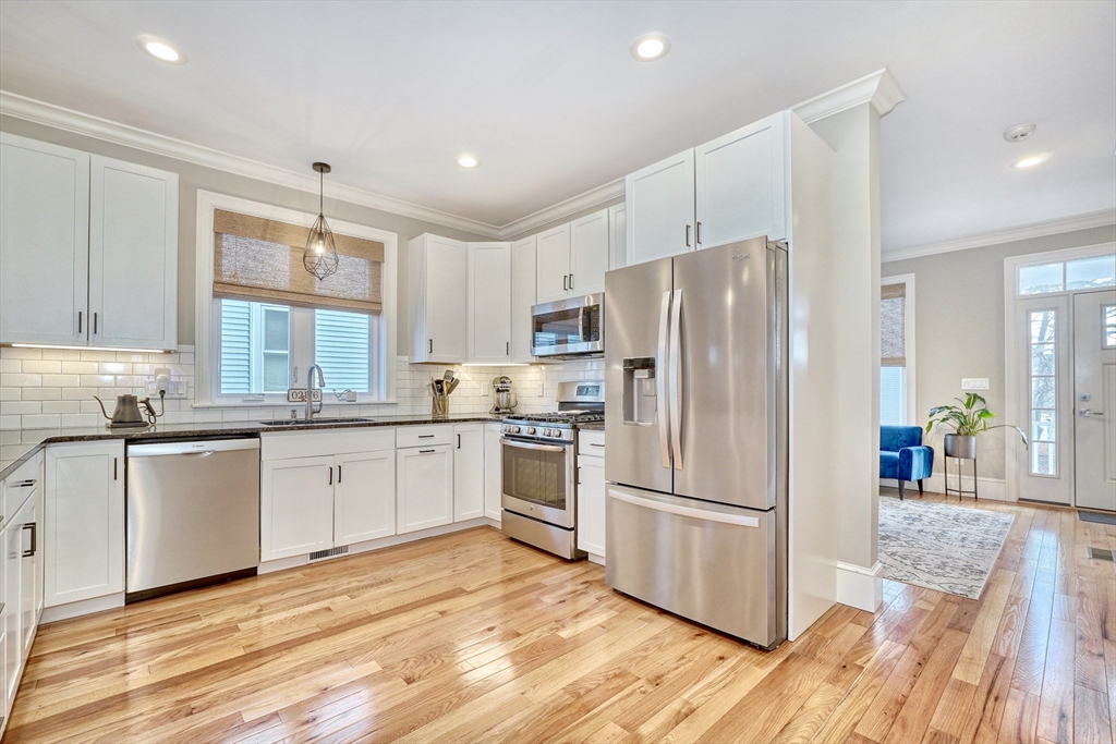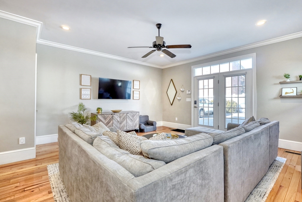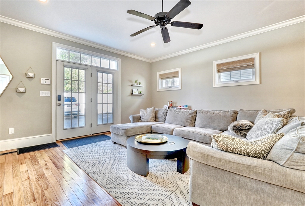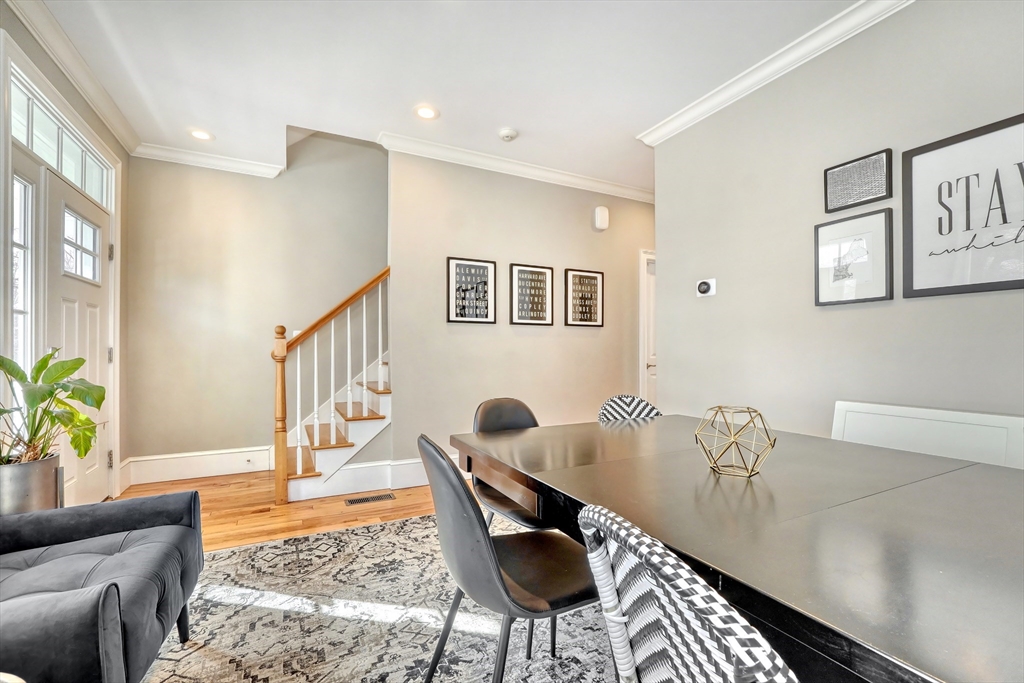 Location, location, location! This luxury downtown townhome offers unbeatable convenience just steps to Main Street, new library, post office, grocery store, commuter rail, and bus line. Featuring 10 rooms, 3 bedrooms, and 3.5 baths, this home combines space and style with soaring ceilings and an open-concept layout. The white kitchen with granite counters and stainless appliances flows into a spacious living room with access to a private patio and two parking spots. A flexible front room functions as a dining area, office, or playroom. The second floor includes two bedrooms with en-suite baths, including a primary suite with walk-in closet and laundry room. The third floor offers a large bedroom with full bath and walk-in closet—perfect for guests or extended family. Finished lower level includes a family room and two additional storage rooms. A rare find in an ideal downtown location!