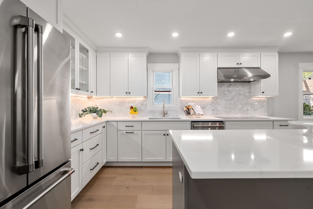 New Price! Terrific opportunity! This stunning first-floor condo has been newly renovated for modern living with energy-efficient electric heat pumps for heating and cooling, and an induction cooktop for fast, clean, and efficient cooking. The open-concept layout features sleek recessed lighting, wide-plank flooring, and a show-stopping designer kitchen with stainless steel appliances, quartz countertops, and a large island that flows seamlessly into the dining and living areas—perfect for entertaining or relaxing at home. The main level offers a tranquil primary suite with a custom closet and a luxurious en-suite bath, plus a second bedroom and another full bath—both with heated floors. A stylish custom mudroom adds function and flair. The finished lower level provides incredible flexibility with a spacious family room, third bedroom, and full bath. With two off-street parking spots and a prime location, this thoughtfully updated home checks every box.