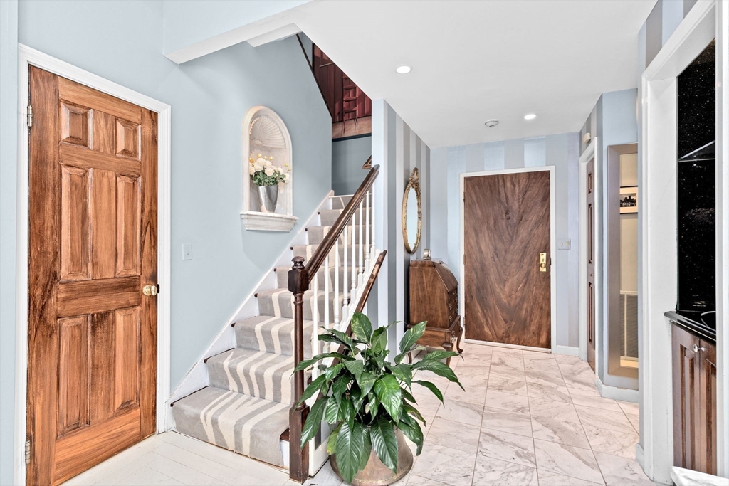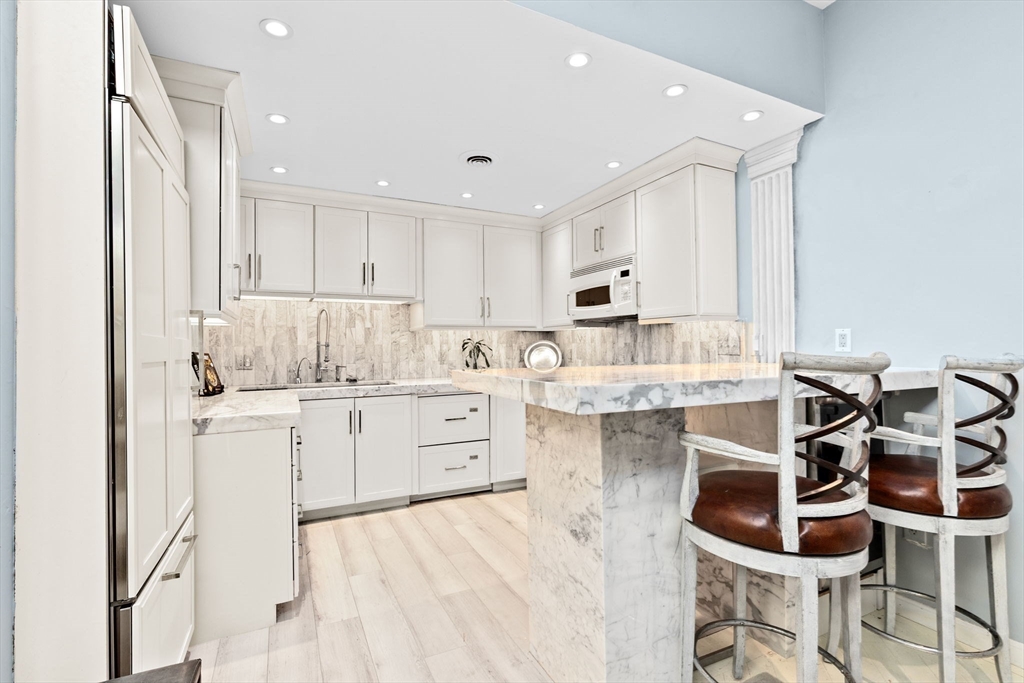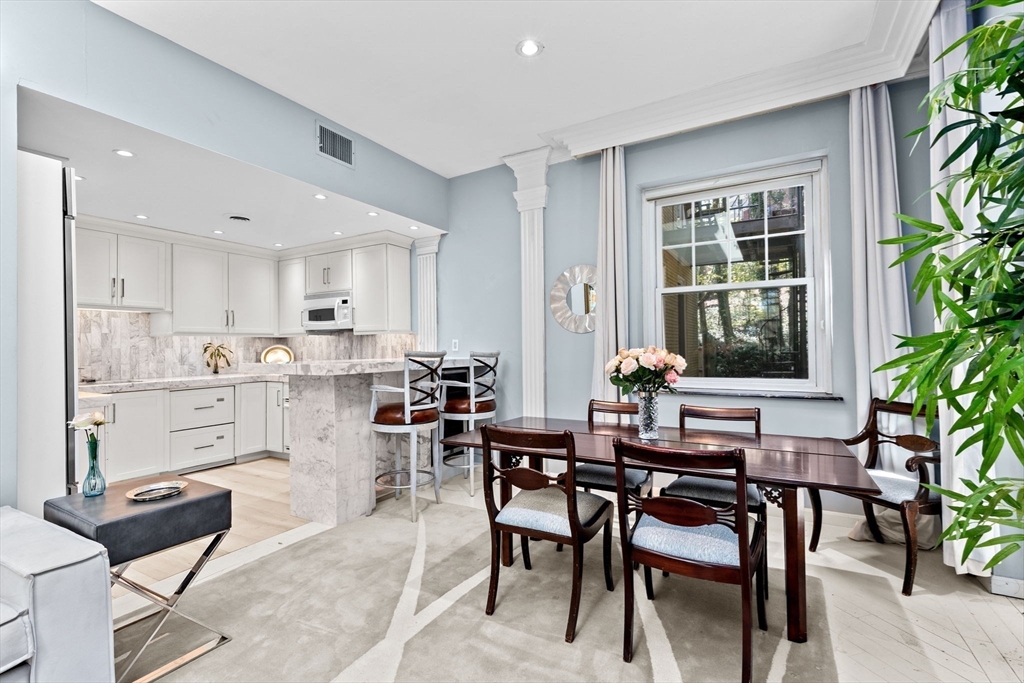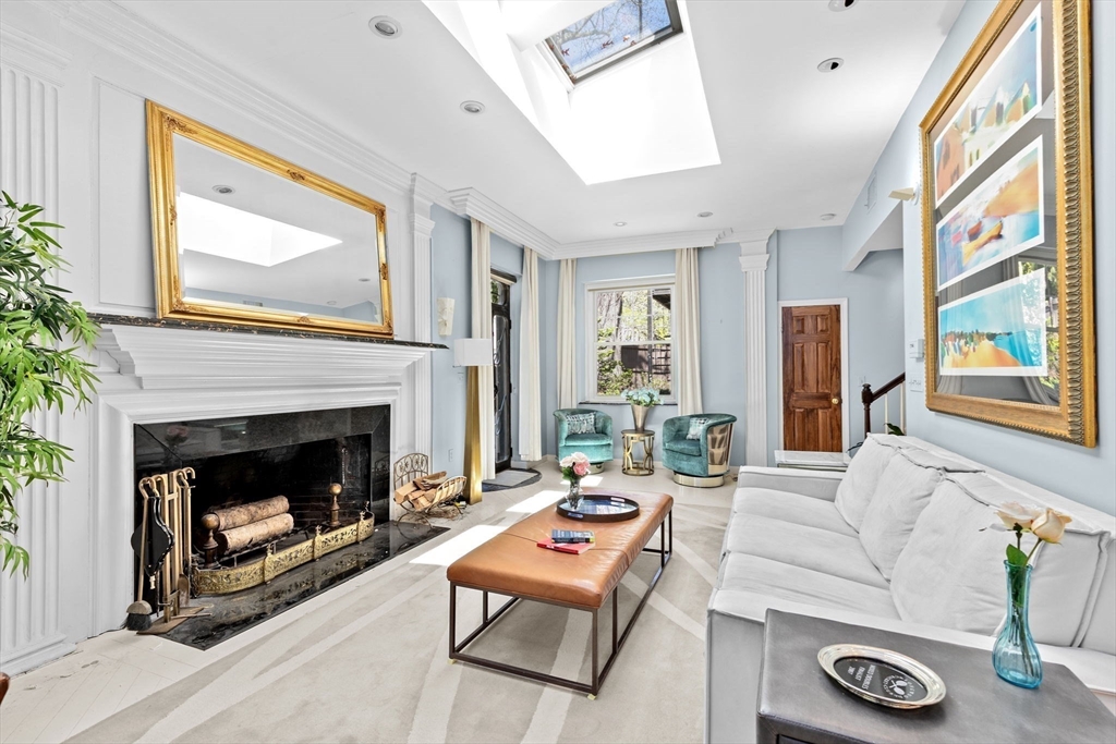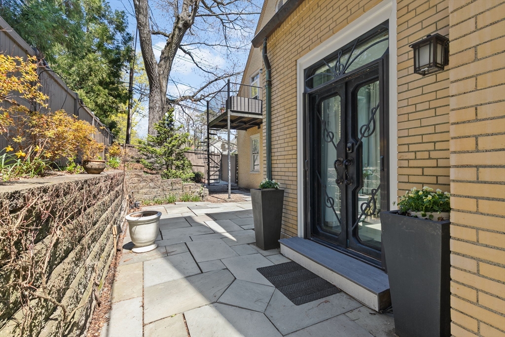 Welcome to the quintessence of sophistication at Olmstead Park. This exquisite 1-bedroom, 1.5-bathroom unit is a haven of elegance, spanning 991 sq ft. Step into the inviting living room, where high ceilings & a sky light & fp illuminate the space, seamlessly flowing into a serene bluestone patio - perfect for unwinding or entertaining. The open dining area complements a pristine white kitchen, featuring a granite peninsula ideal for culinary creations. Convenience meets luxury with a 1/2 bath & a versatile closet space that accommodates a cozy desk setup. Ascend to the 2nd floor to discover a peaceful bedroom retreat, complete with ample closet space & an opulent renovated bathroom adorned with granite counters, including a washer & dryer for ultimate ease. Central a/c, add'l storage & an assigned parking space ensure comfort & convenience. The property offers lofty windows, an exercise room, & a superintendant service. Located minutes from Longwood Medical Area, shops & more!