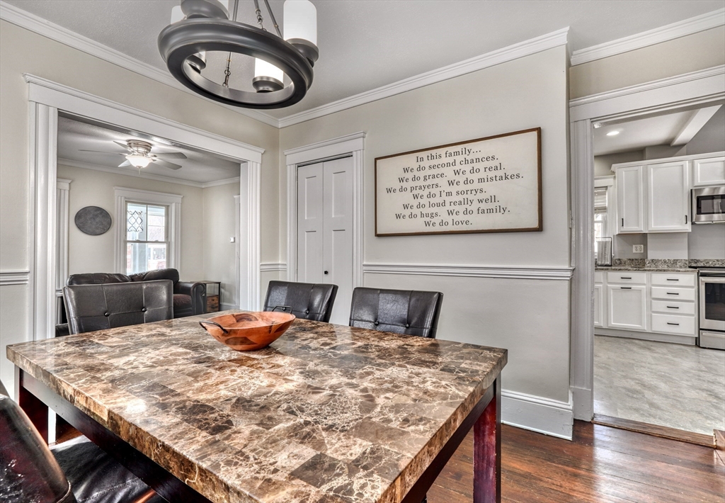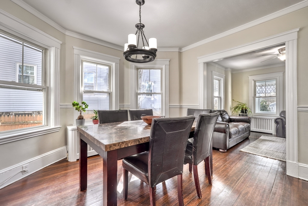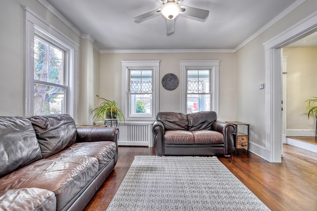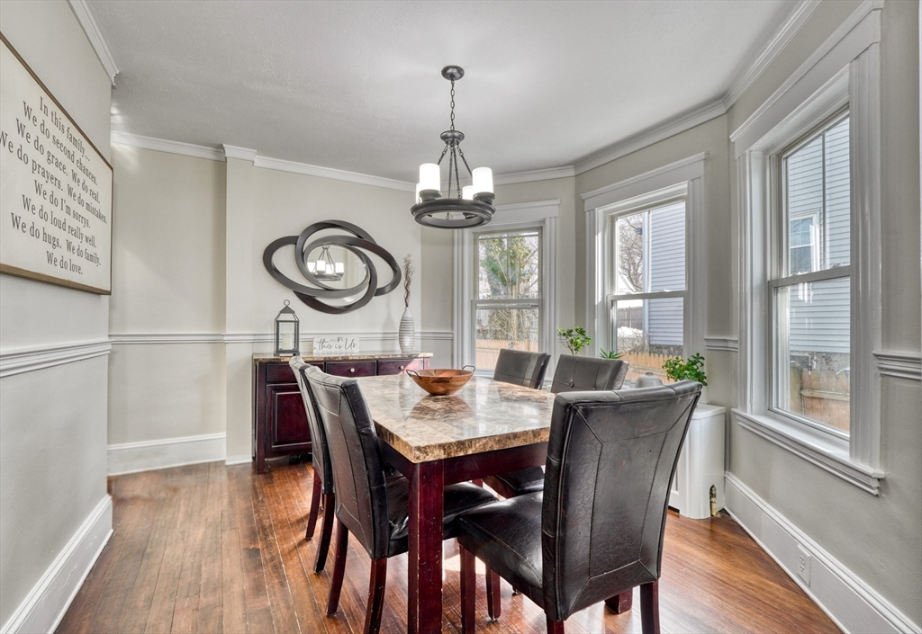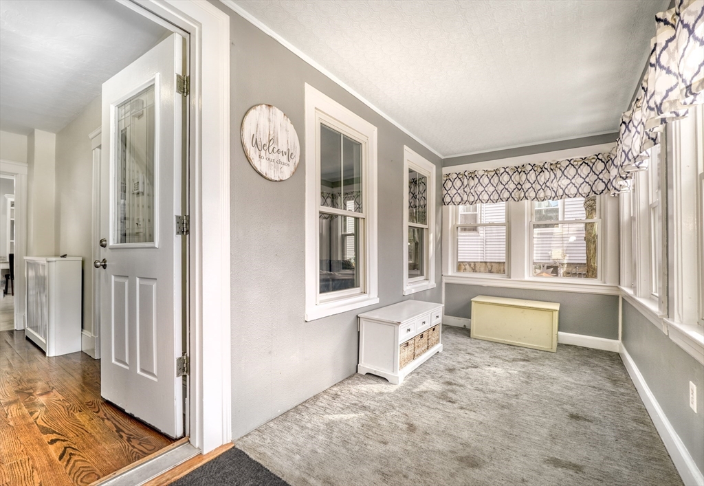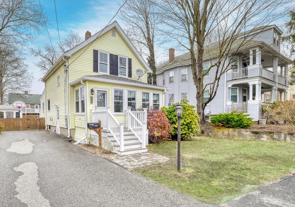Clean cut and move in ready 3 Bed 1.5 bath with many updates in desirable Dedham. Finished versatile front porch entry, hardwoods throughout main rooms, classic trim mouldings, huge updated kitchen with tons of cabinet space, 1st floor bath and a 1st floor bedroom option round out the 1st level. Upstairs you will find two more bedrooms and a full bath. Bonus room in lower level as well as large storage and utility area. Low maintenance vinyl and fiber cement siding. Young windows, roof and Hot Water. Newer decks and shed. Fenced in backyard. Natural Gas. Location offers convenient access to Boston, Legacy place, Dedham Center, shopping, and restaurants.