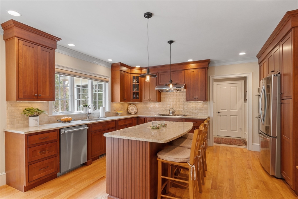 Welcome to 27 Maxwell Rd in Bedford’s most desirable neighborhood! This stunning Colonial offers 4 bedrooms, 4.5 baths, and high-end finishes throughout. A grand 2-story foyer greets you, with custom millwork and hardwood floors. The kitchen impresses with beaded cherry cabinets, Crema Astoria granite, Thermador appliances, and opens to a cozy family room with gas fireplace. A private office sits at the front, while the sunroom addition with fireplace overlooks a beautifully landscaped yard. Upstairs includes a private primary suite with walk-in closet and spa-like bath, plus an en-suite bedroom. The finished lower level features a full bath—ideal for guests or a playroom. Enjoy a private backyard with patio, a welcoming front porch, gas heat, central AC, and vibrant neighborhood with block parties and easy access to the town center. Style, comfort, and location—it’s all here!