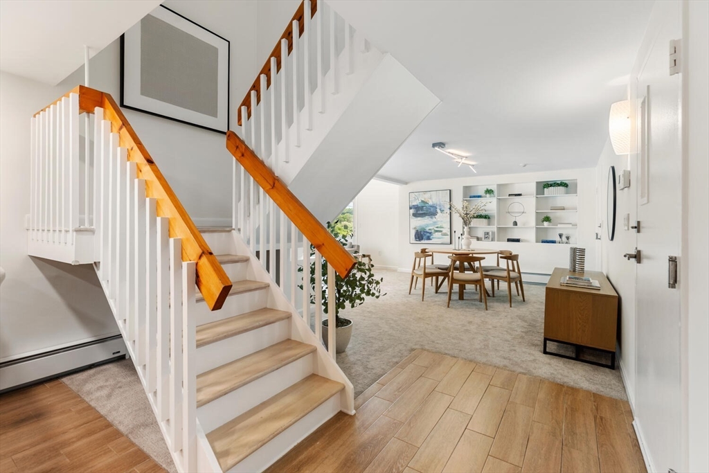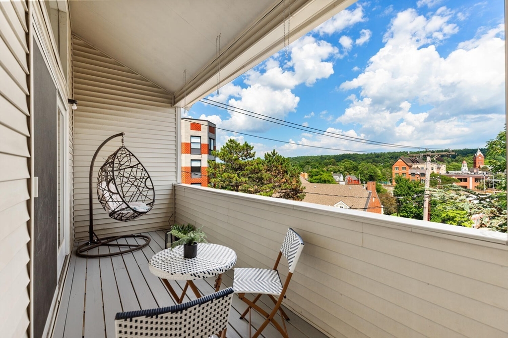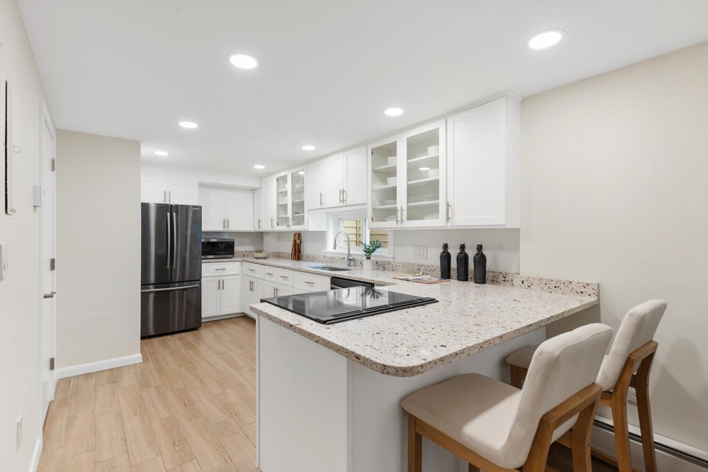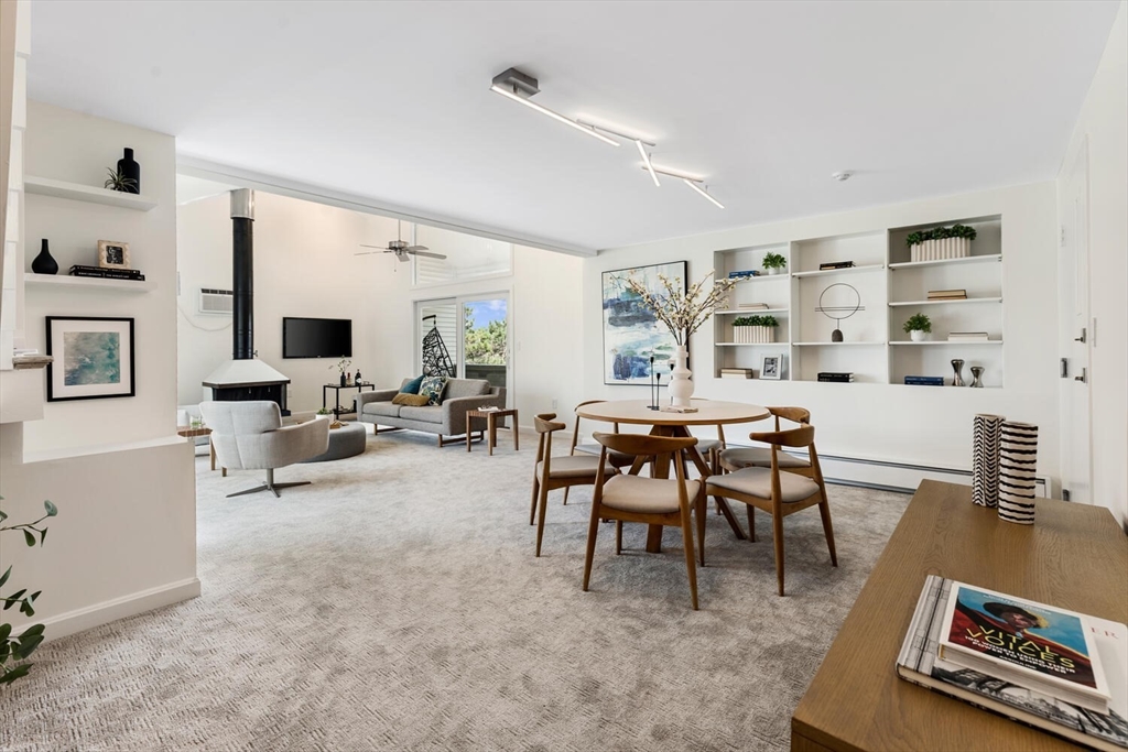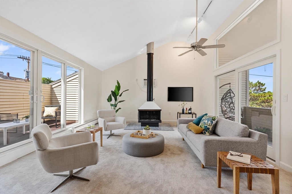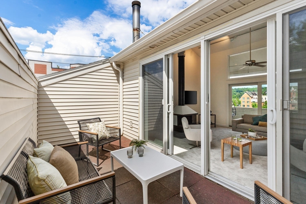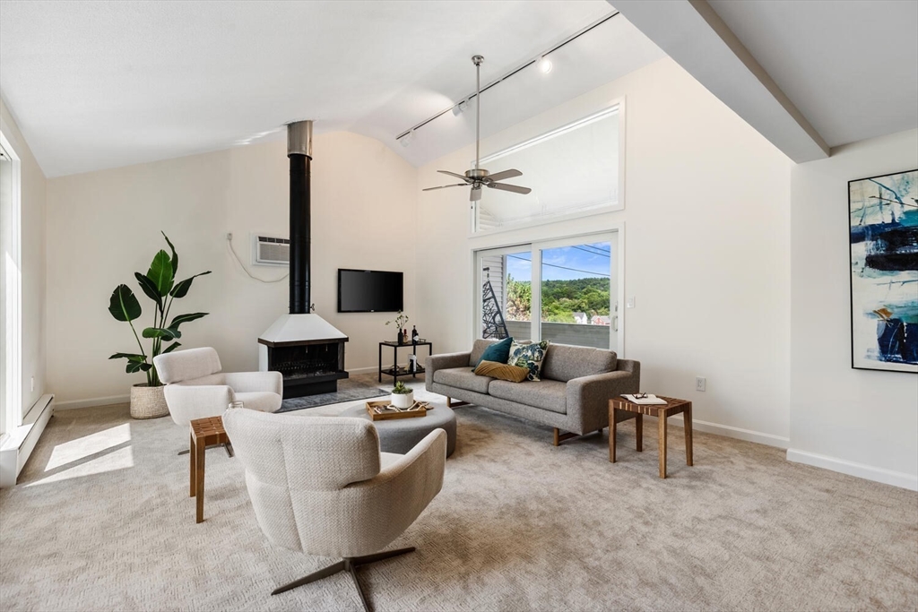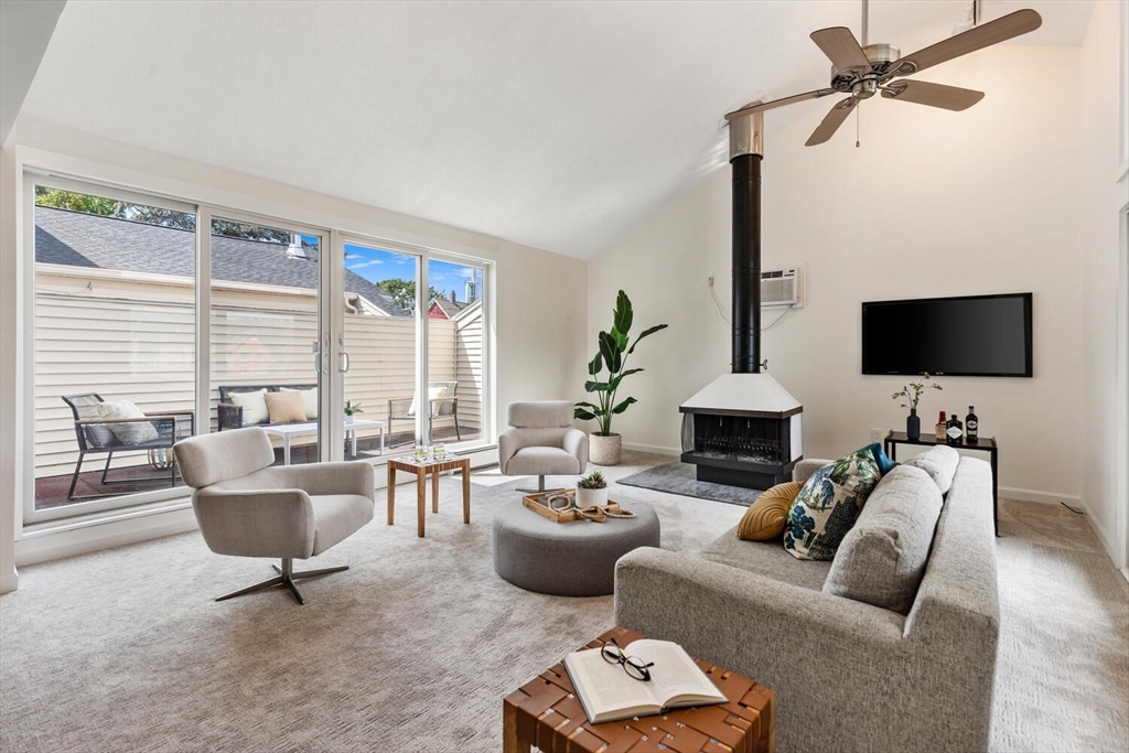 Immerse yourself in the vibrant heart of Winchester Center with this exquisite 2-bedroom, 1.5-bathroom condominium! Step into the open-concept living and dining area, where a modern touch meets downtown flair. A rare freestanding wood-burning fireplace accentuates the space, offering warmth and a touch of classic charm. Delight in the recently renovated kitchen, designed for both style and utility. The unit boasts two expansive rooftop patios, offering boundless possibilities. Whether you envision a tranquil retreat under the stars or a sophisticated dining area overlooking the vibrant town center, these outdoor spaces are sure to inspire. Practical features include abundant storage, in-unit laundry, ensuring convenience, and one off-street parking space. This prime location allows you to walk to the BRAND NEW commuter rail, grocery store, restaurants, shops, and everything our idyllic town center has to offer—enhancing the ease of daily life!