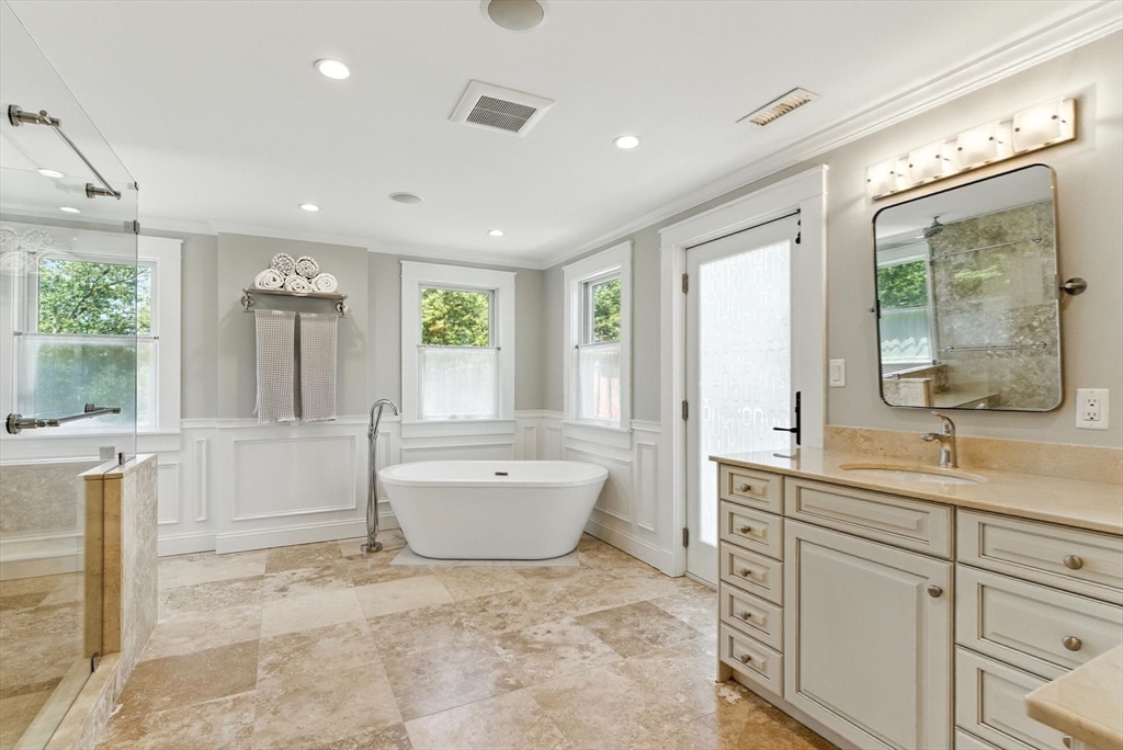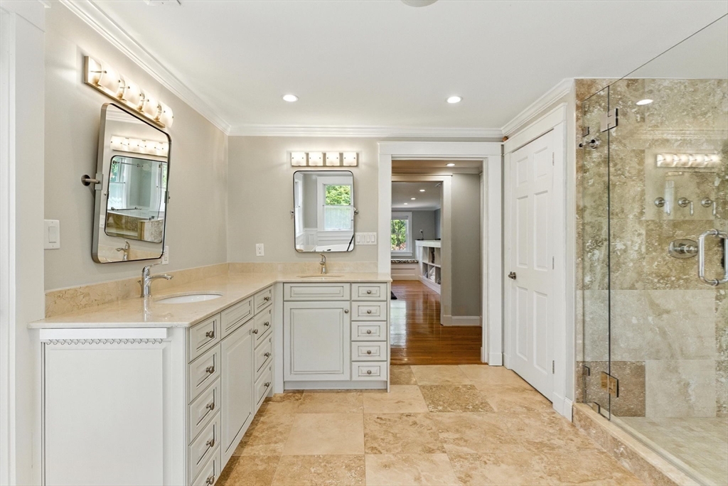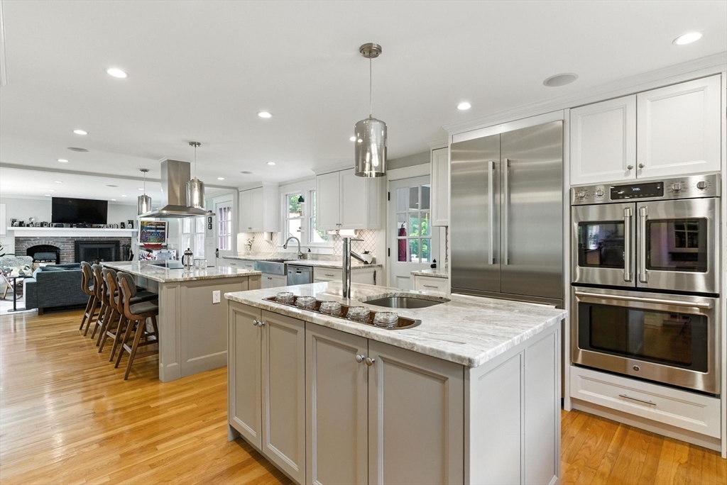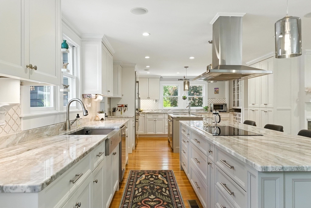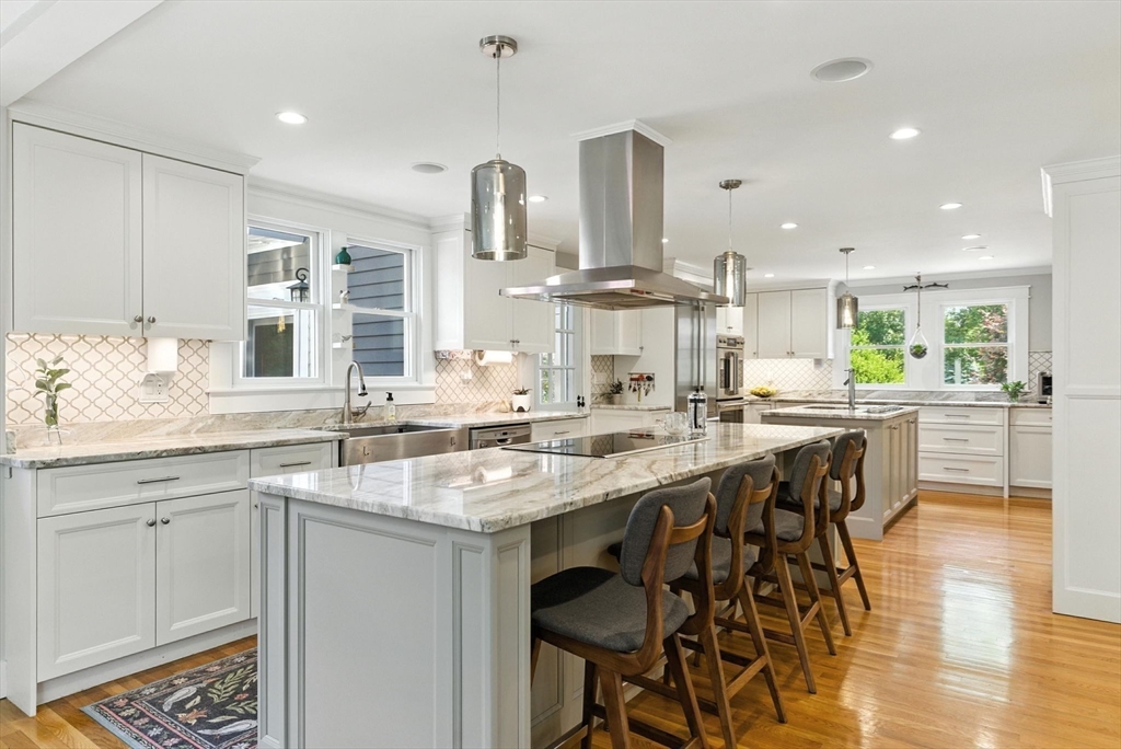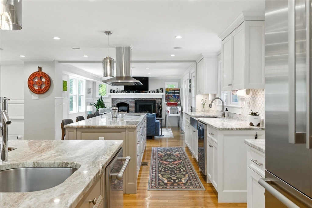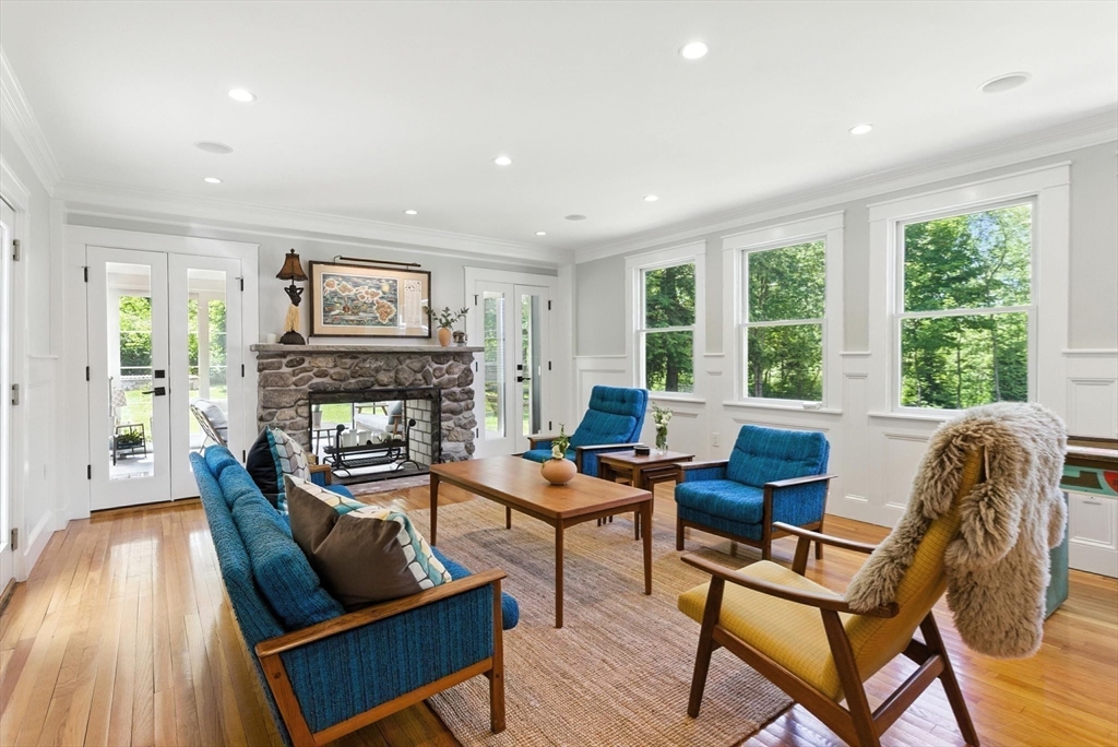Discover an extraordinary residence nestled on one of Westwood's most prestigious streets, offering unparalleled luxury and privacy just 20 miles from the heart of Boston. This elegant sanctuary provides the perfect blend of relaxation and entertainment with its expansive living spaces, many of which open to the outdoors. The main level features four exquisite fireplaces, including a unique dual-sided fireplace that enhances both indoor and outdoor gatherings. The gourmet chef's kitchen stands as the heart of the home, featuring dual islands that provide both functionality and style. The kitchen seamlessly flows into a grand dining room that comfortably accommodates 14 guests.With five bedrooms and five lavish bathrooms, the primary suite is a haven of tranquility, boasting an expansive walk-in closet and a spa-like en-suite bathroom. Enjoy the screened-in porch, a refreshing heated plunge pool, an inviting roof deck, 2000 sq foot custom barn, expansive finished basement!