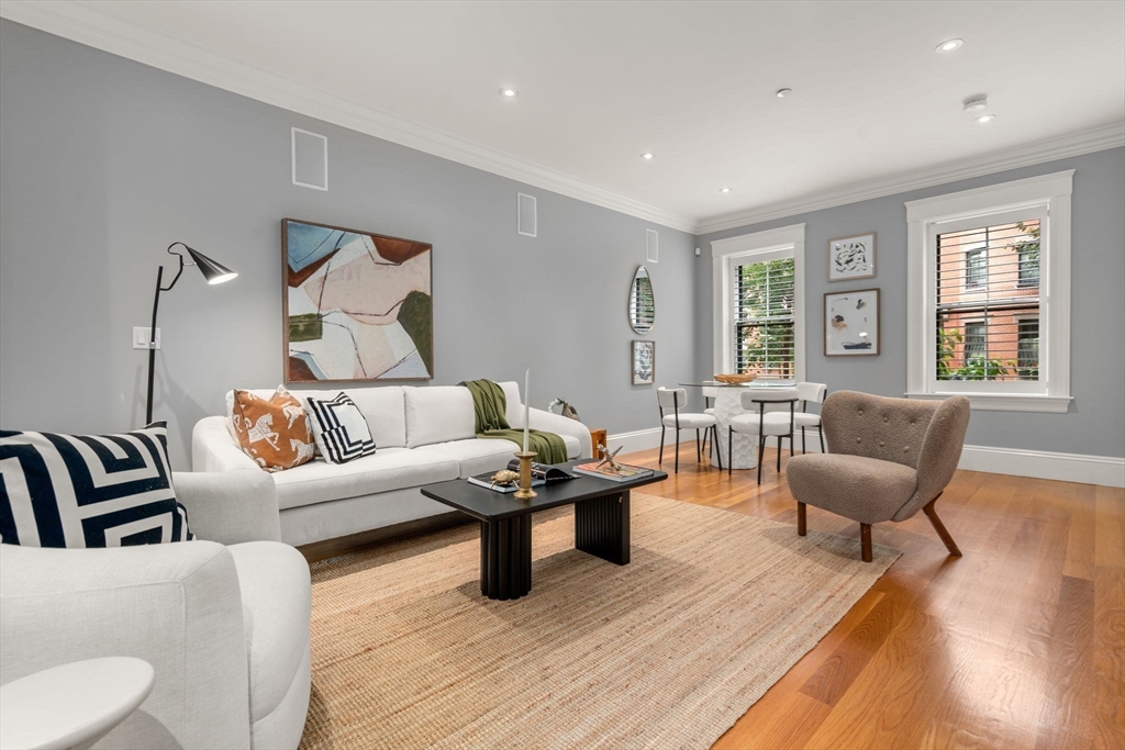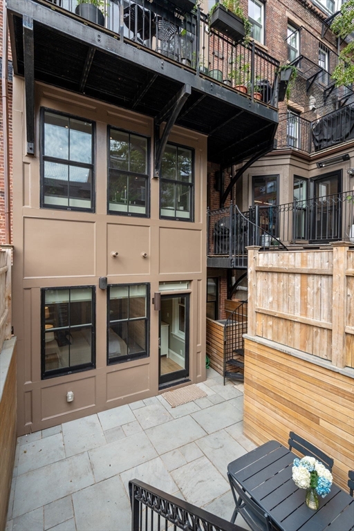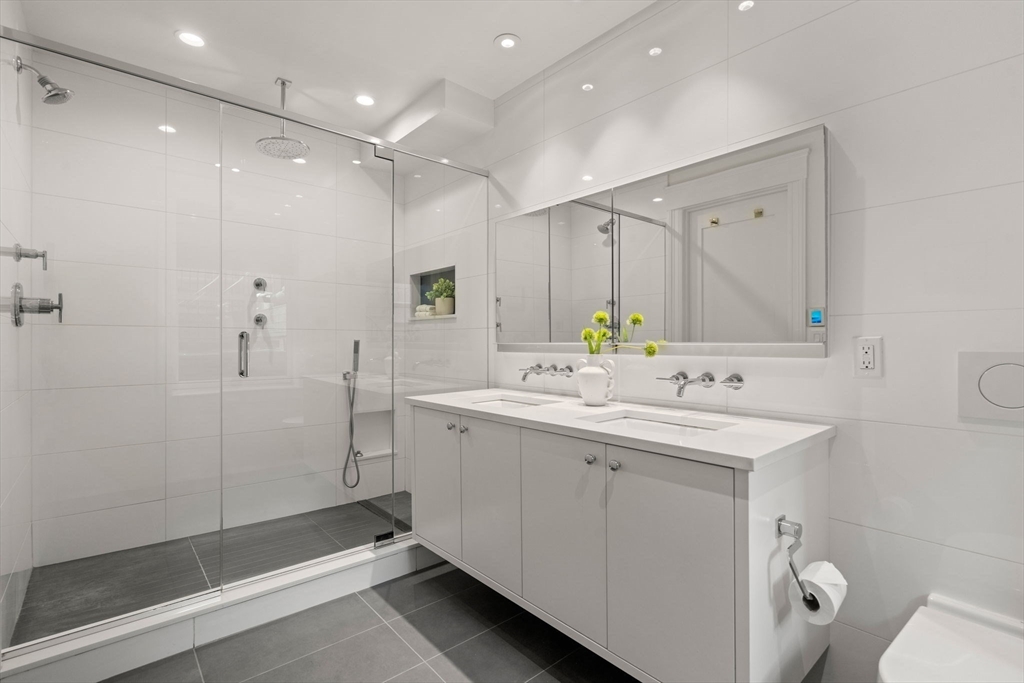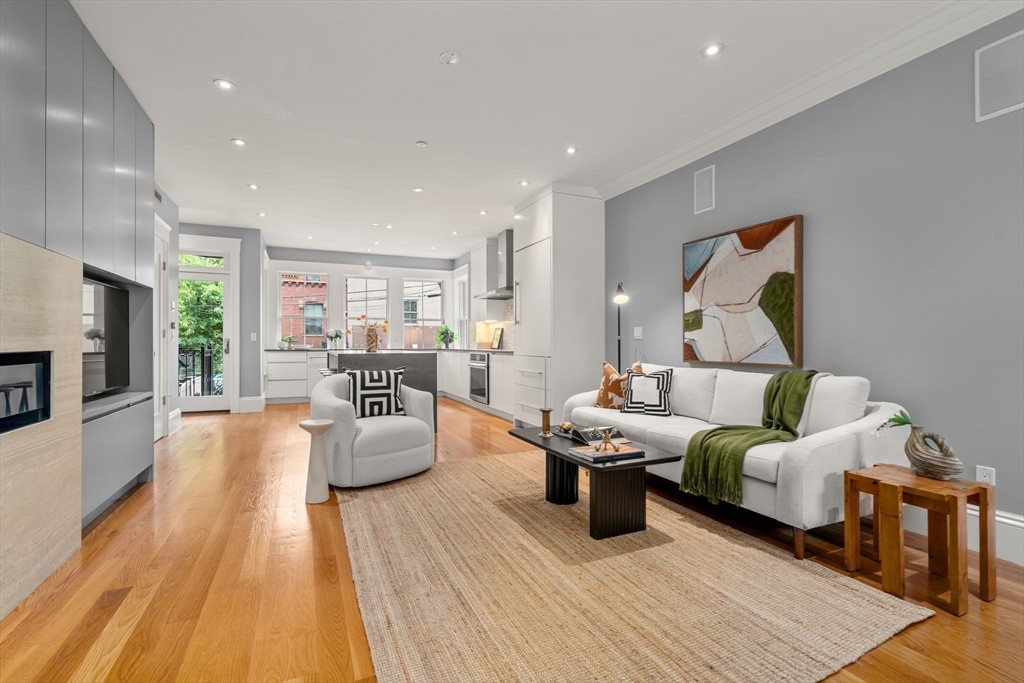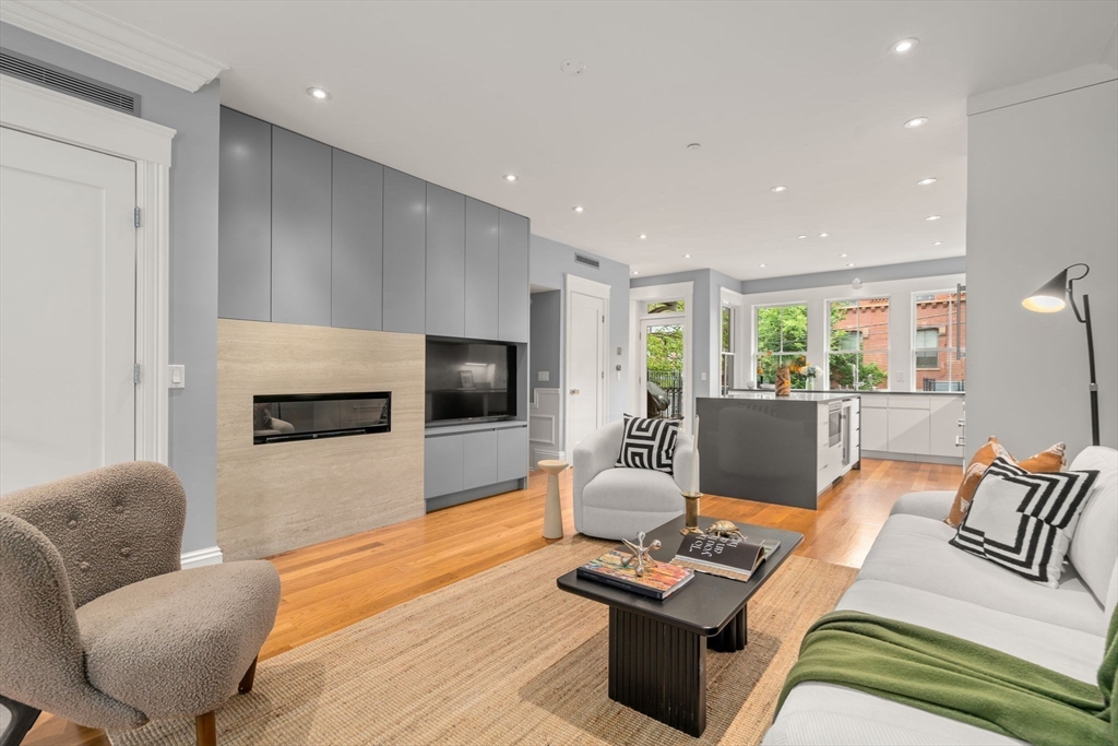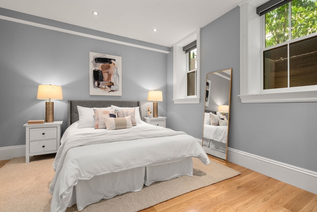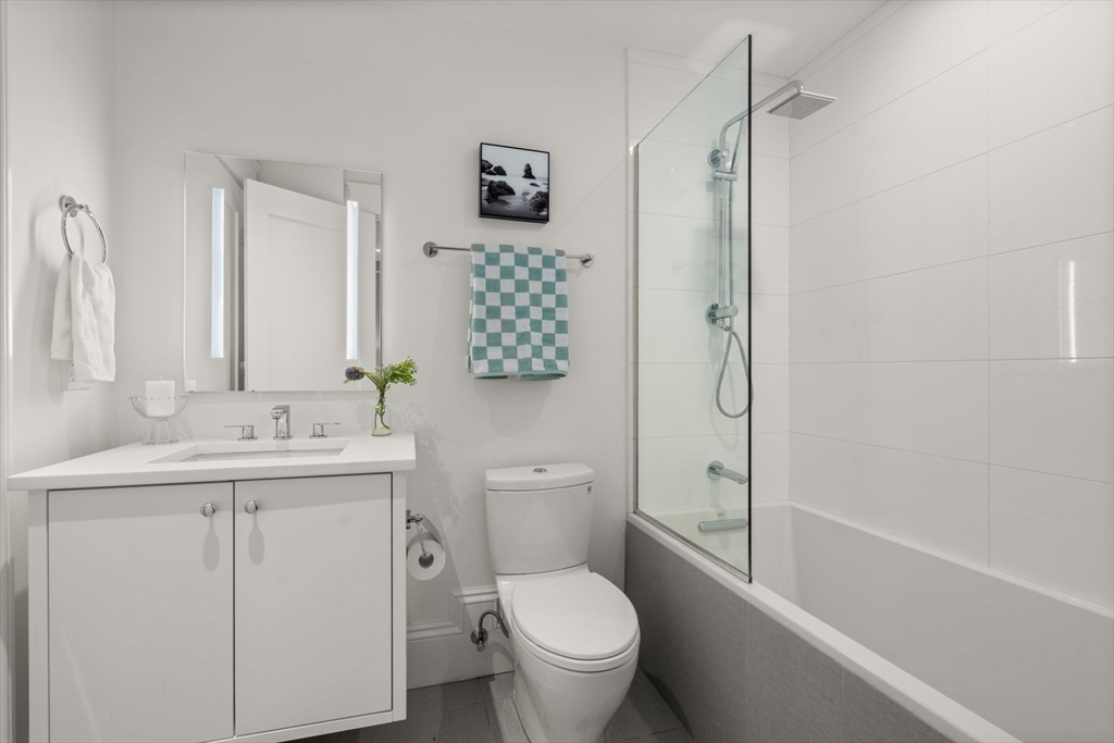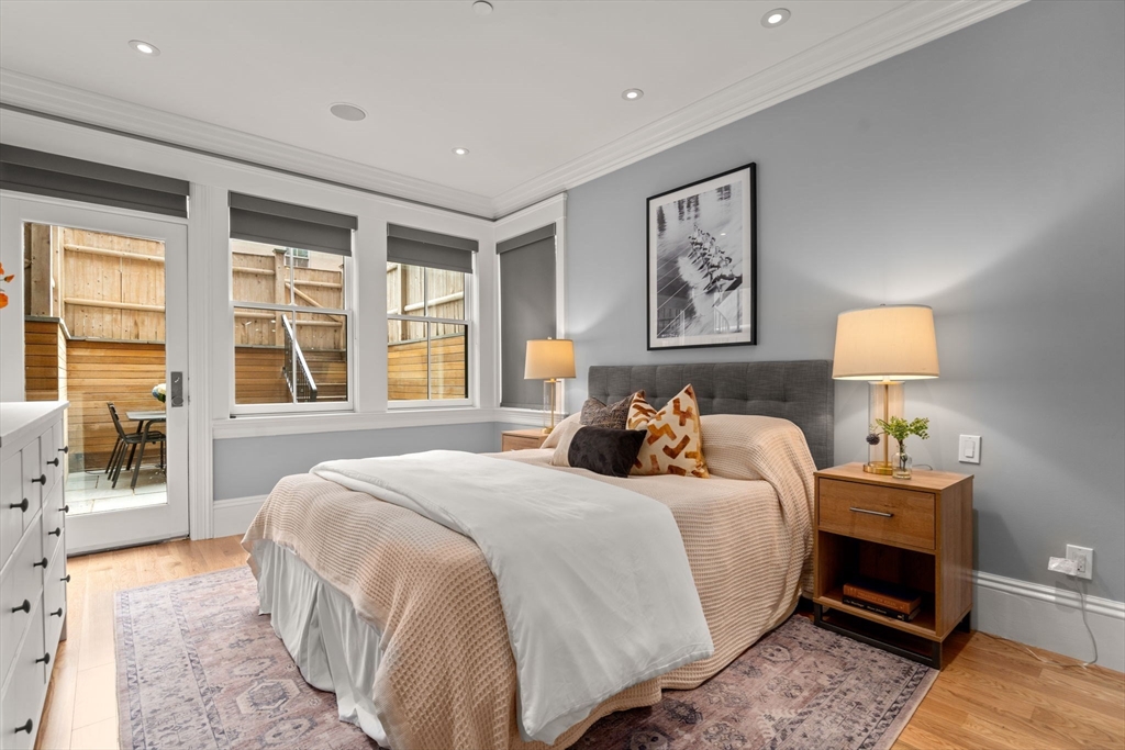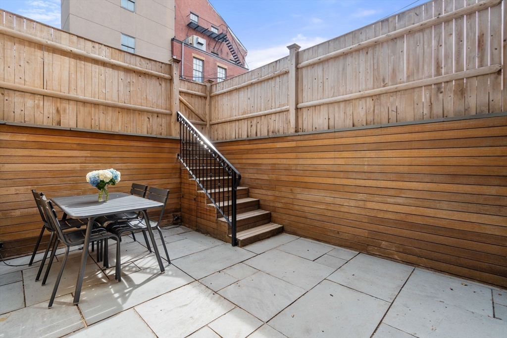 Walk right into this completely renovated Parlor duplex with all of the bells and whistles. Up only a few steps from the building's lovely front garden, a completely open living / kitchen / dining space stretches out with large windows and great ceiling height. The kitchen is impressive with an oversized island that features a paneled wine fridge, microwave drawer and so much storage. The rear wall of the kitchen is completely wrapped in windows making this feel different from other historic brownstones. There is a grill deck just off the kitchen which also leads down to the spacious patio and full, direct-access parking space below. Both bedrooms are spacious with their own large en-suite bathrooms. The primary bed features a light and bright double vanity, step-in, glass shower and Robern medicine cabinets. The walk-in closet is amazing and the room allows for access out to the private patio too. Enjoy easy and practical living in this beautiful South End home.
