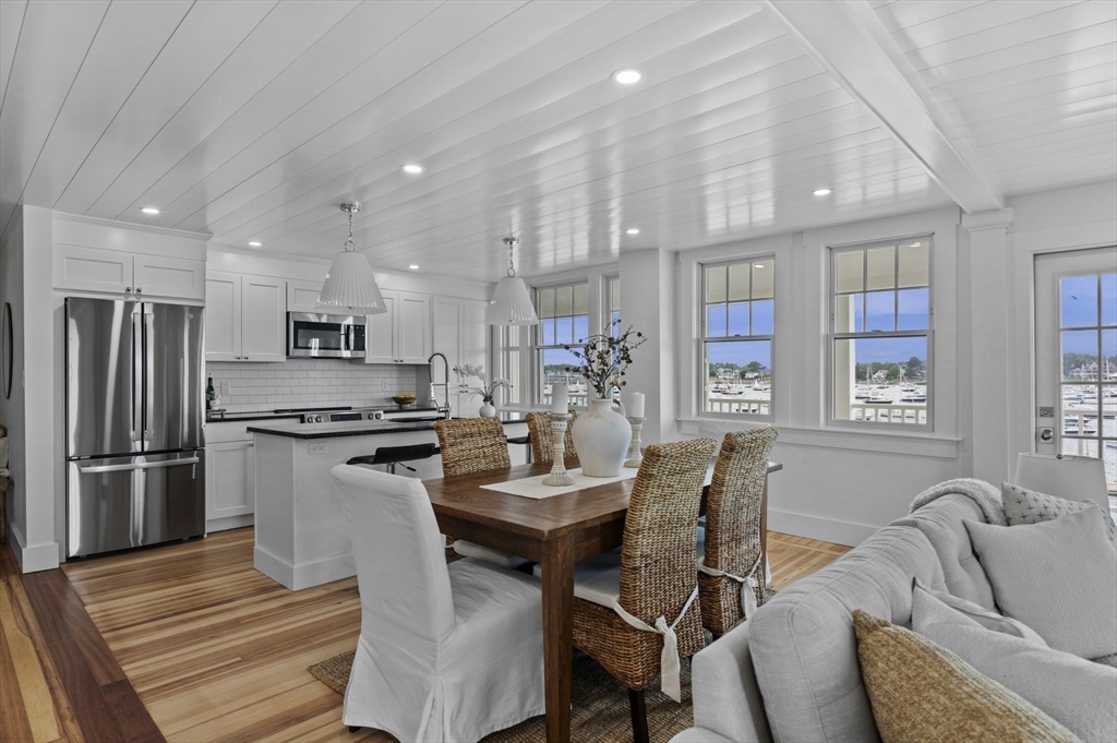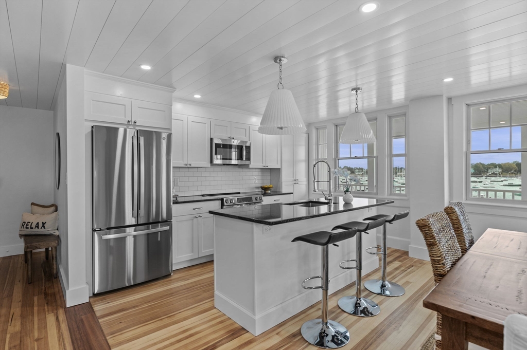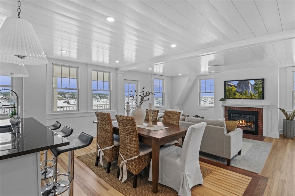Unmatched harbor views and the best of Old Town Marblehead just outside your door. This beautifully renovated 2-bedroom condo in a 7-unit, owner-occupied building offers sweeping views of Marblehead Harbor, the lighthouse, and the Atlantic. The open-concept living, dining, and kitchen area features hardwood floors, a gas fireplace, and a center island—perfect for entertaining. A wall of glass doors leads to a fabulous private deck overlooking the harbor. The white kitchen shines with custom cabinetry and stunning shiplap and wood-beamed ceilings that add warmth and character. The primary bedroom enjoys water views, while the second bedroom is bright and spacious. A beautifully tiled bath with walk-in shower, in-unit laundry, and deeded parking complete the package. Just moments from Crocker Park, Fort Sewall, and all that Old Town offers—this is luxury coastal living in one of Marblehead’s most iconic locations.