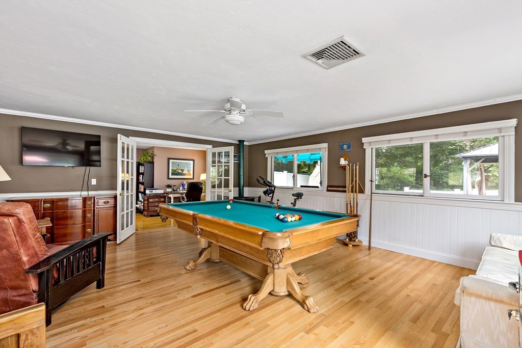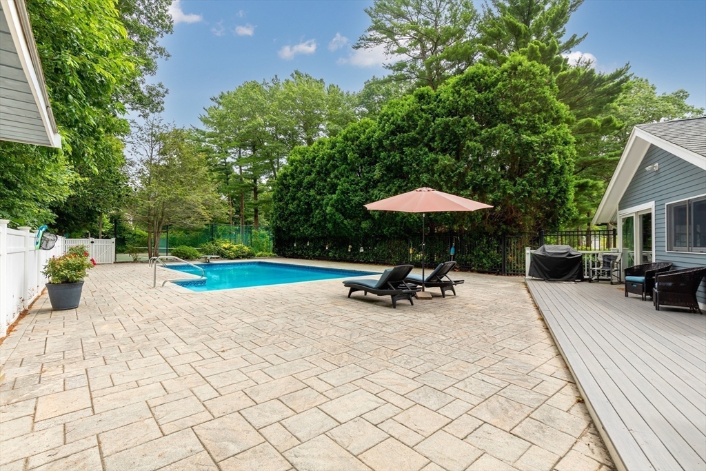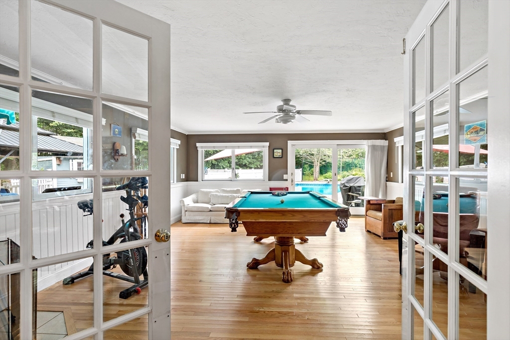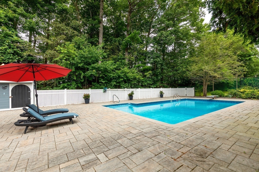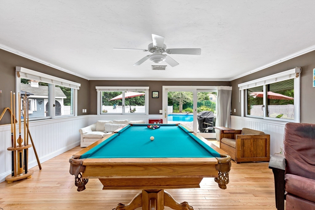 Great opportunity to own this oversized Ranch in desirable North Marshfield at a great price! The bright, open layout features hardwood floors and skylights, with a sun-filled eat-in kitchen w/ quartz countertops, island and breakfast nook, perfect for gatherings. The home offers three spacious bedrooms, two full baths, a cozy fireplace in the living room, along with a gas stove in the bonus room, ideal for family gatherings. Step outside to your private backyard oasis with a heated in-ground pool, built-in stone hearth pizza oven, ample space to grill and relax, and a tennis court easily converted to pickleball. With central air conditioning and just minutes from beaches, restaurants, and highway access, this inviting home offers exceptional amenities & location on a private lot!