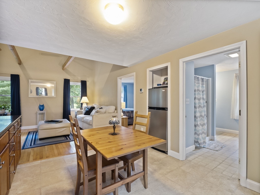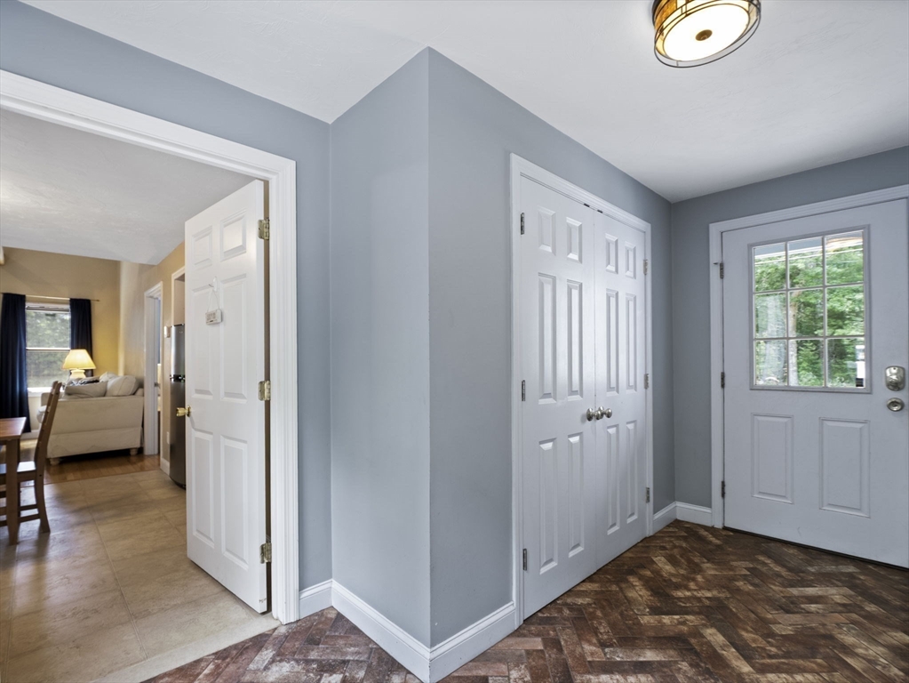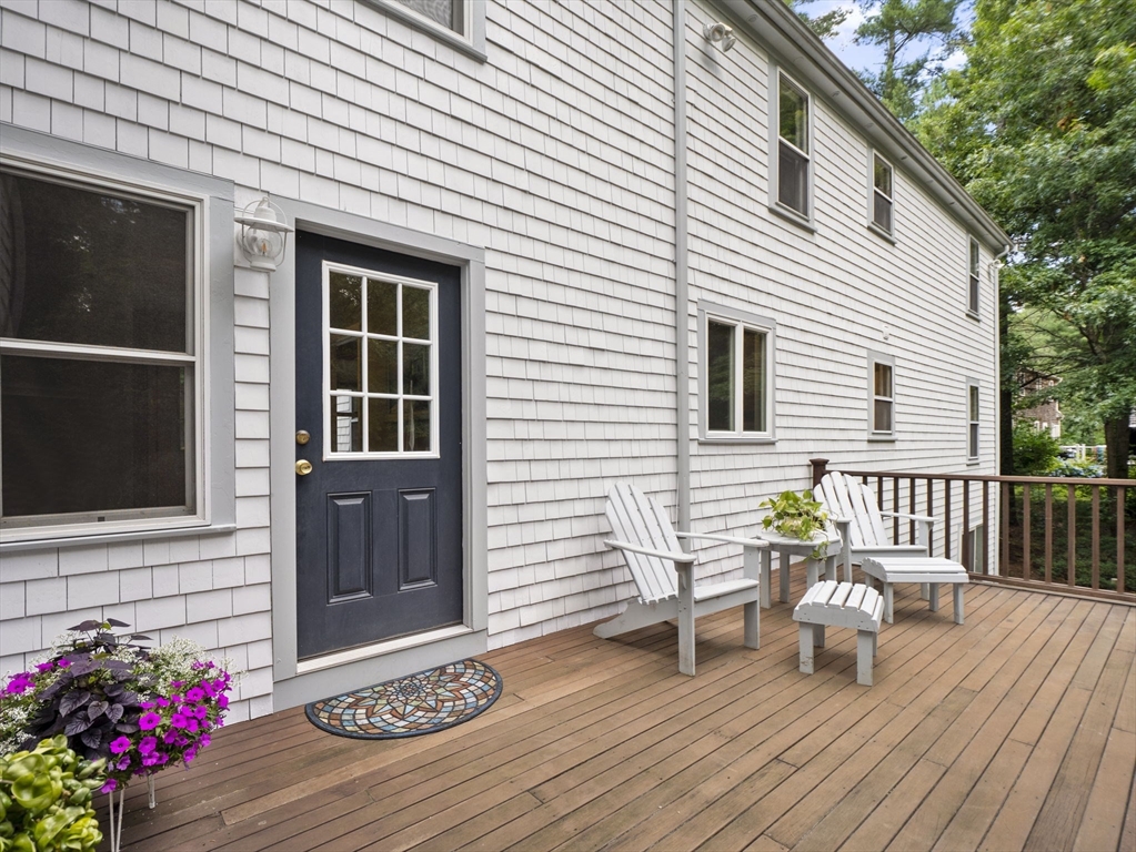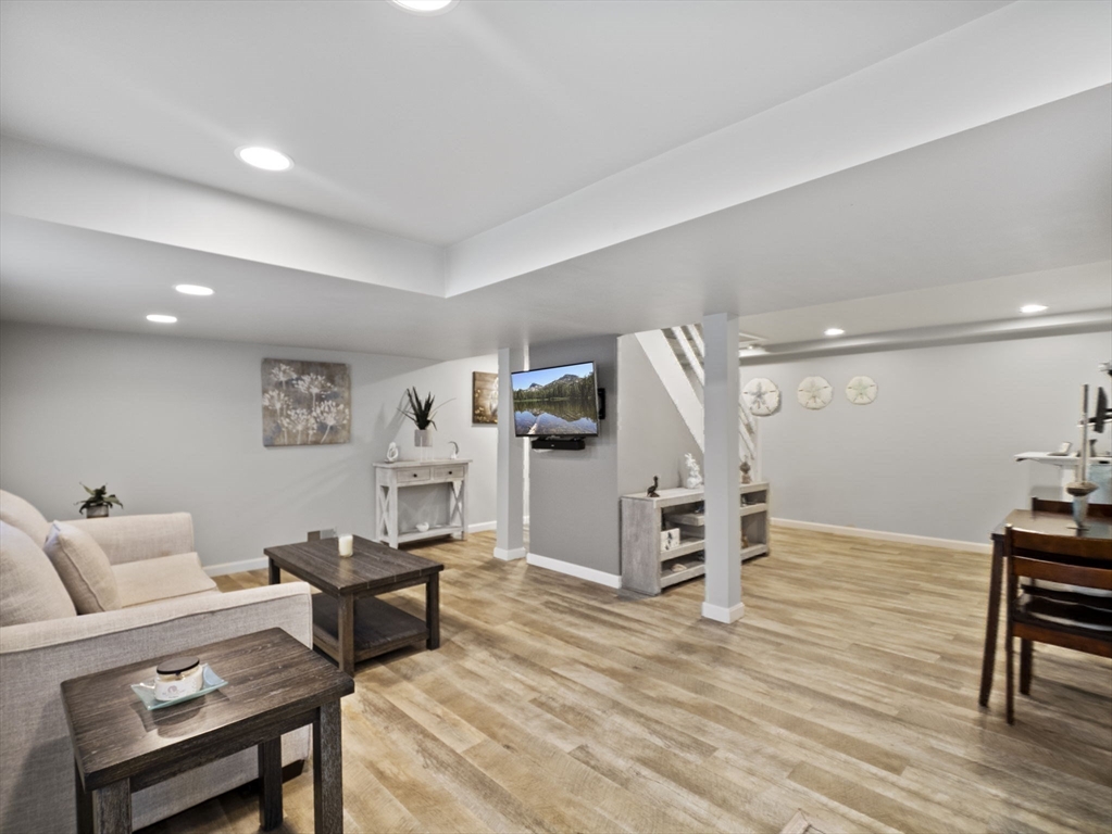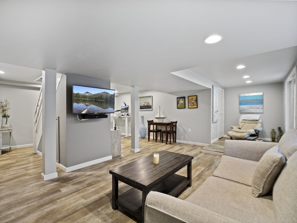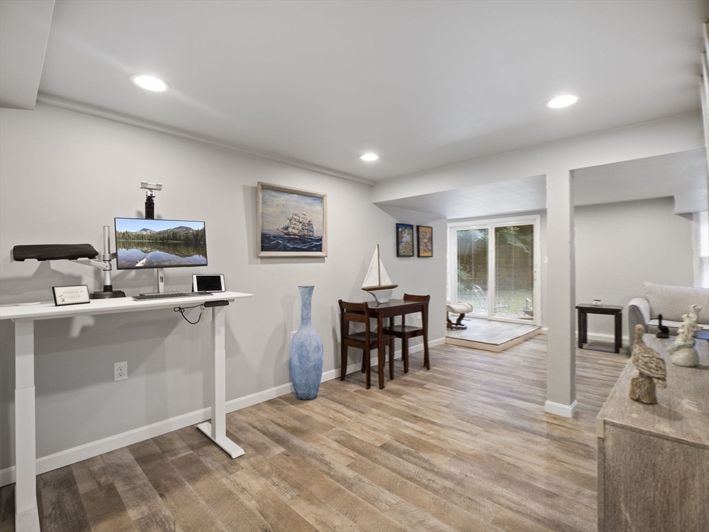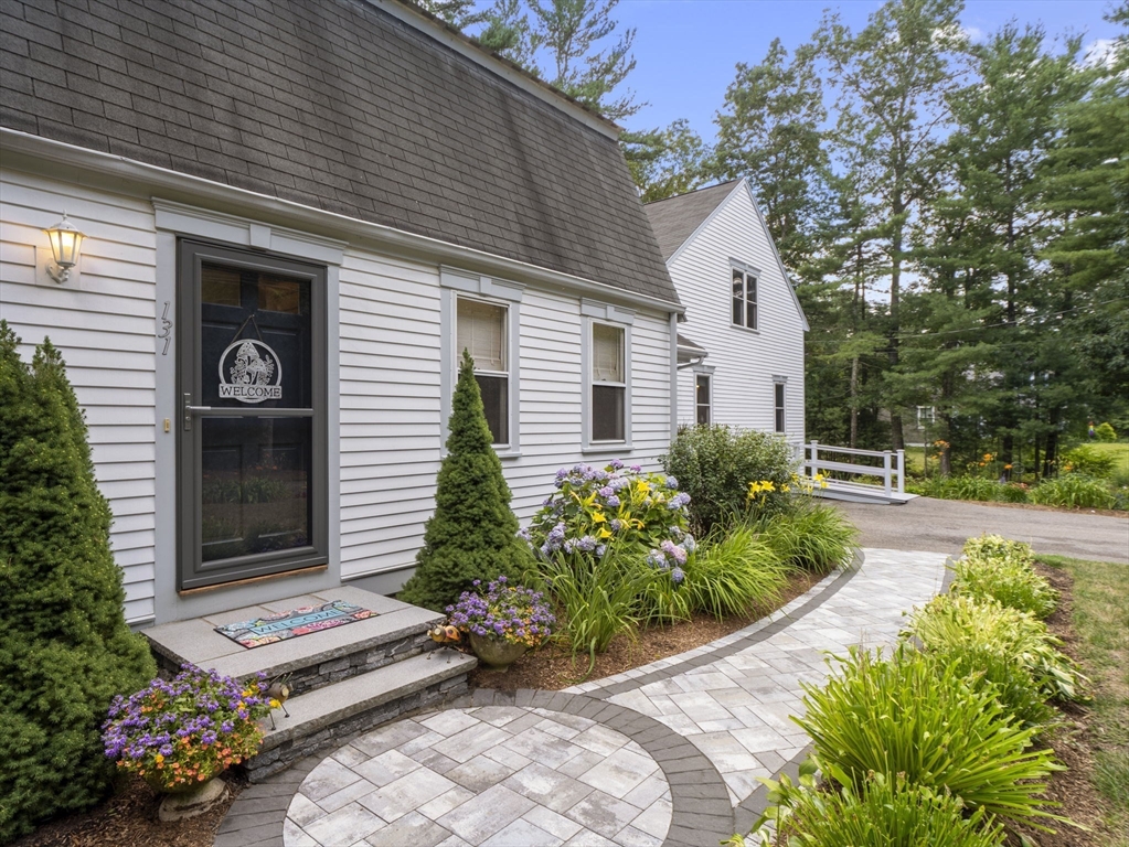 Meticulously maintained with numerous recent upgrades, this distinctive home offers exceptional flexibility - ideal for multi-generational living, extended guests or a potential ADU. A charming, covered porch with an accessible ramp welcomes you into a spacious herringbone-tiled mudroom that separates the main home from a versatile two-level addition. Wide doorways offer wheelchair accessibility. Enjoy hardwood floors, heated tile kitchen & upgraded baths. The primary BR features a custom walk-in closet w/ an artist-crafted sliding barn door. The coastal-inspired finished walk-out lower-level w/sliders to a patio allows for seamless indoor-outdoor living. Step outside to an expansive rear deck, a large backyard with ample space to add a pool, and a professionally landscaped garden framed by dual driveways. Additional highlights include a new paver walkway & granite/stone porch - all set on a property encircled by nature & just minutes to Rt. 3, beaches and scenic trails.