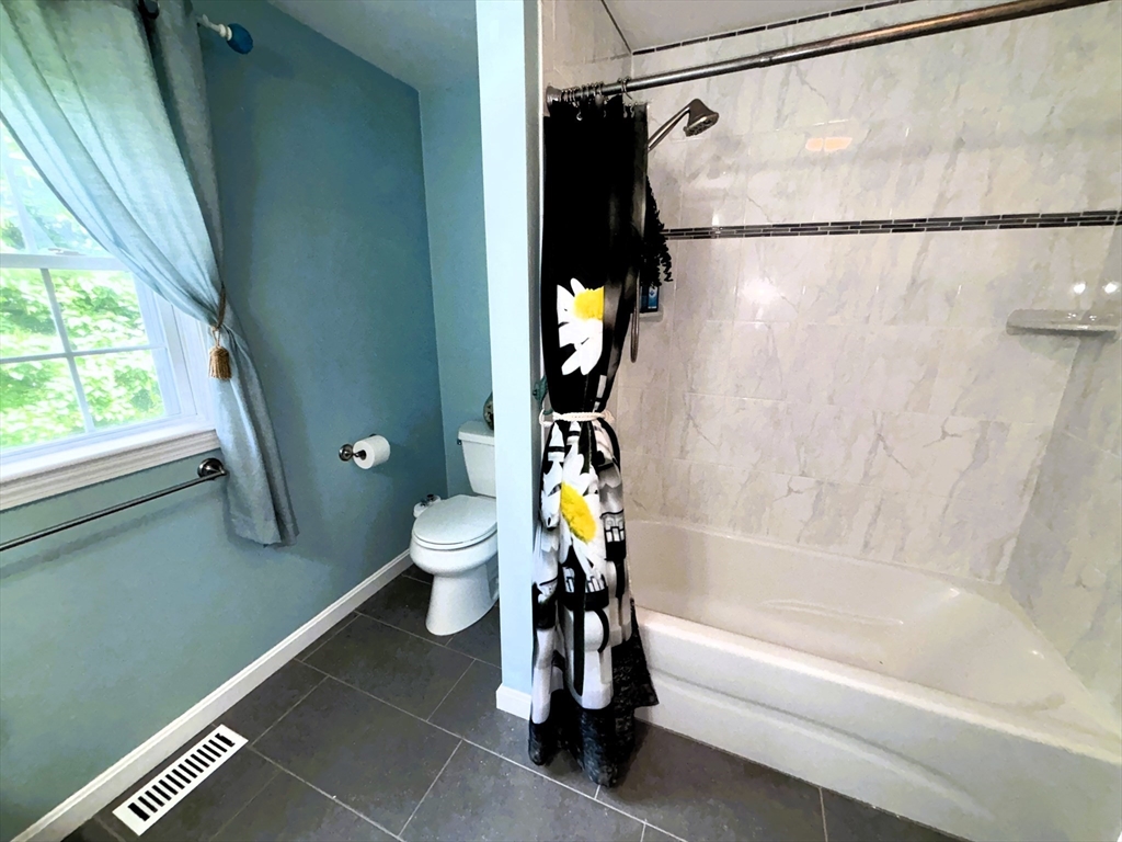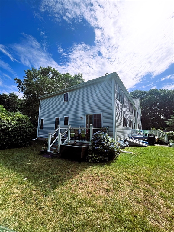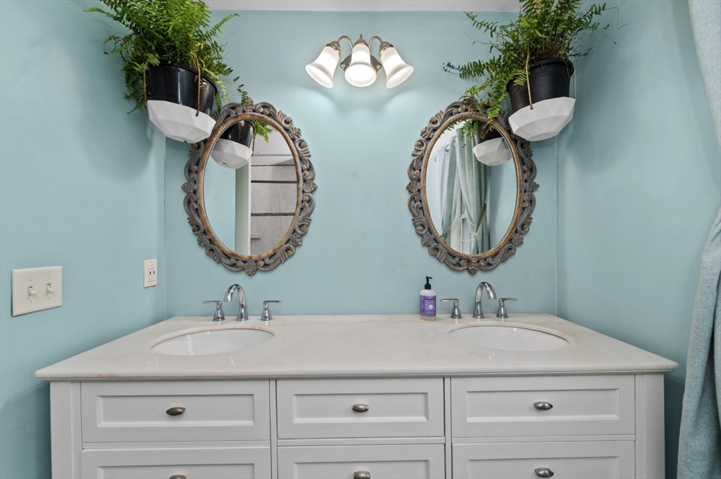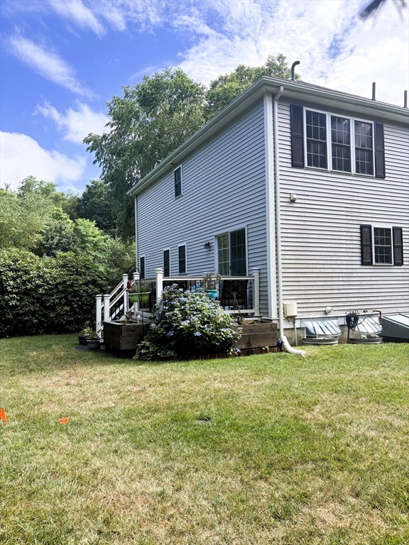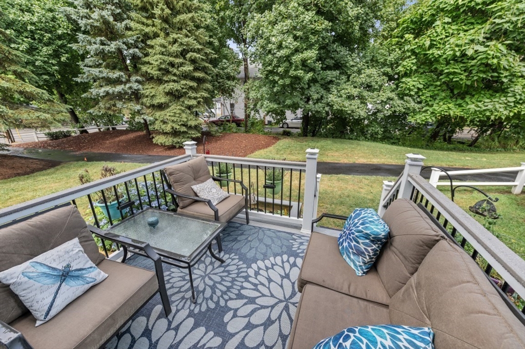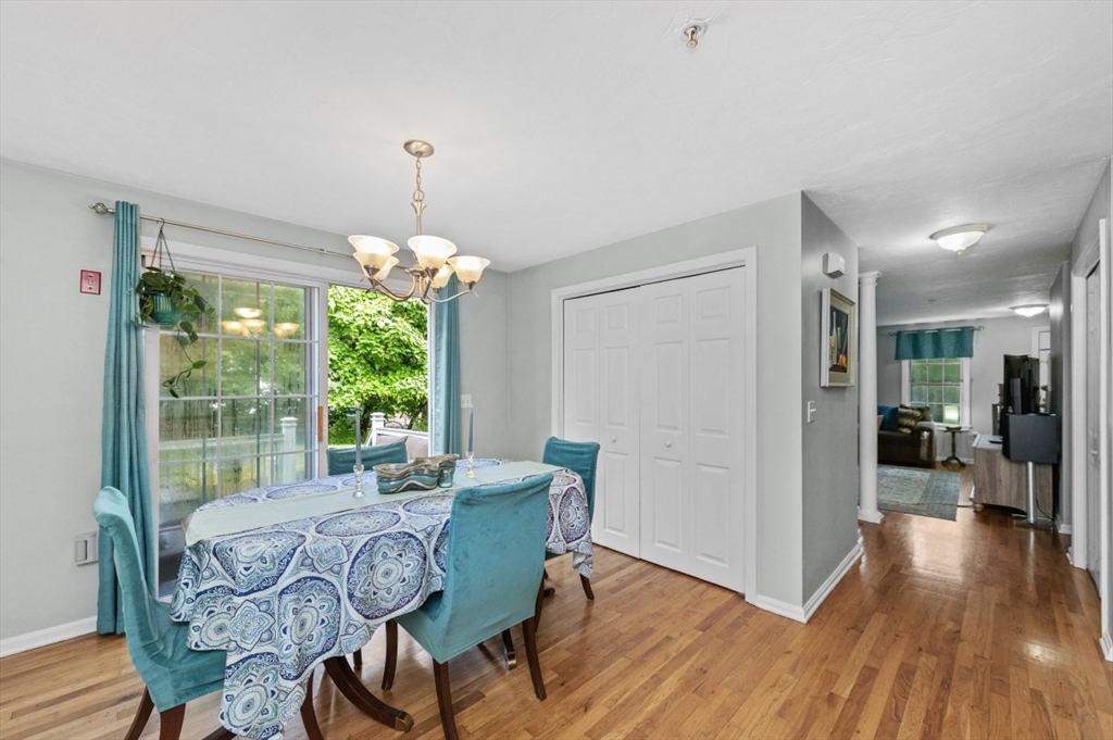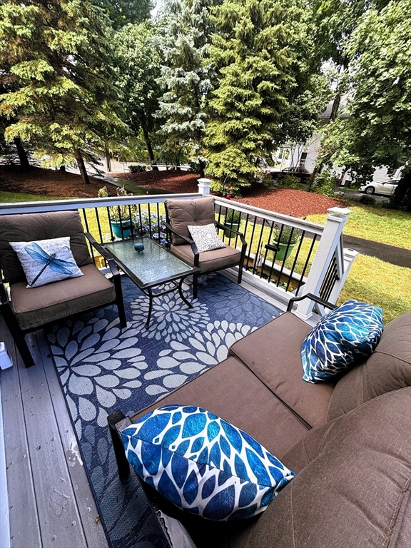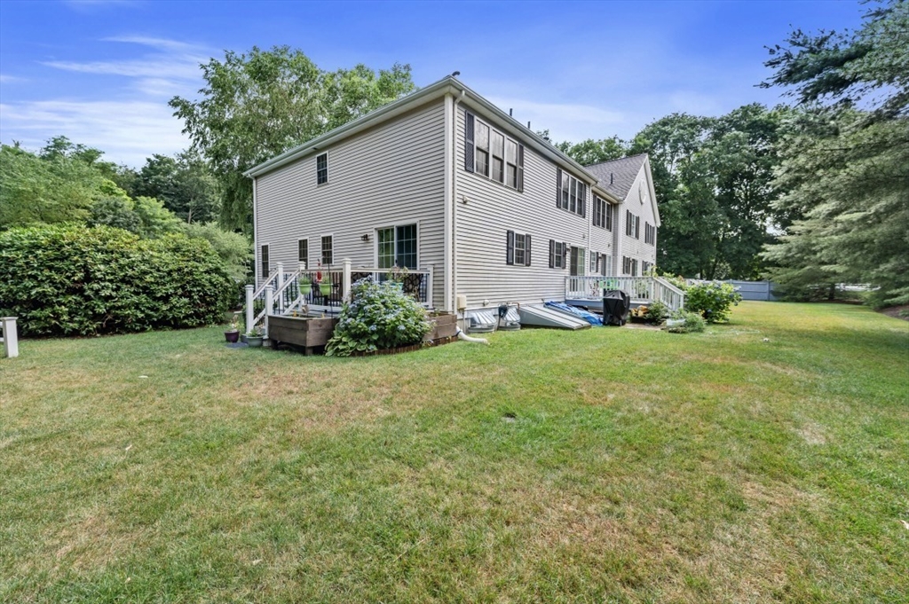 Welcome to this spacious end-unit townhome at Abington Square, offering 3 levels of finished living space & a private wooded backyard. The bright living room flows into an updated 1/2 bath with newer countertops, sink & toilet. The kitchen features granite countertops, stainless steel appliances, garbage disposal & a large pantry, opening to a dining area with direct access to a brand new Timbertech deck (2025) — ideal for entertaining. A serene wooded common yard, used exclusively by this unit, adds rare outdoor privacy. Upstairs, the main bedroom boasts cathedral ceilings & double closets, joined by a 2nd bedroom & an updated full bath with double marble sinks. The finished lower level offers flexible space for a home office or 3rd bedroom, plus generous storage. With a new hot water tank (2024), central AC, in-unit laundry, & 3 deeded parking spaces, this move-in ready home delivers comfort, space & unbeatable convenience near shops, dining, commuter rail & Island Grove Park.