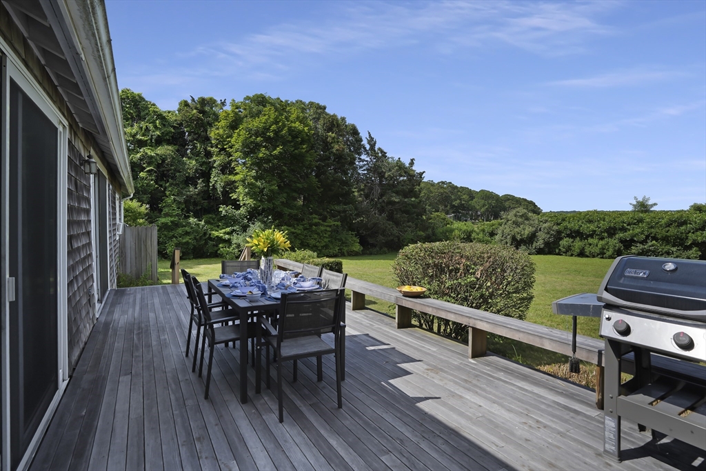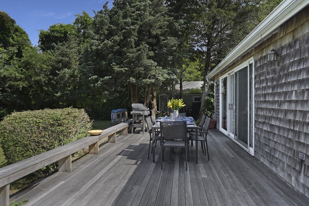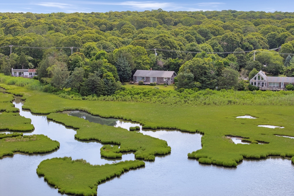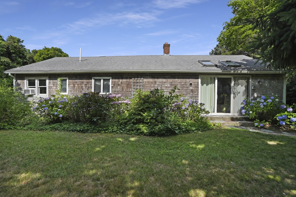 Welcome to an inviting single-story ranch nestled in the heart of Oak Bluffs. This cozy and charming home offers a comfortable living space and is set on a generous, water view landscaped lot with mature trees and natural privacy. Inside, the home features a functional layout with a mix of wood and carpet flooring, a cozy wood-burning fireplace, and abundant natural light throughout. The classic ranch design includes a seamless flow between living, dining, and kitchen spaces—ideal for both everyday living and seasonal retreats. Enjoy the outdoors from the wood deck or rinse off in the outdoor shower after a day at the beach. A detached garage provides added storage and parking convenience. With electric baseboard heat, wood shingle siding, and a gable roof, the home reflects timeless Vineyard style and solid craftsmanship. Located minutes from downtown Oak Bluffs, local beaches, and ferry access, this home presents an ideal opportunity for seasonal or year-round residents.