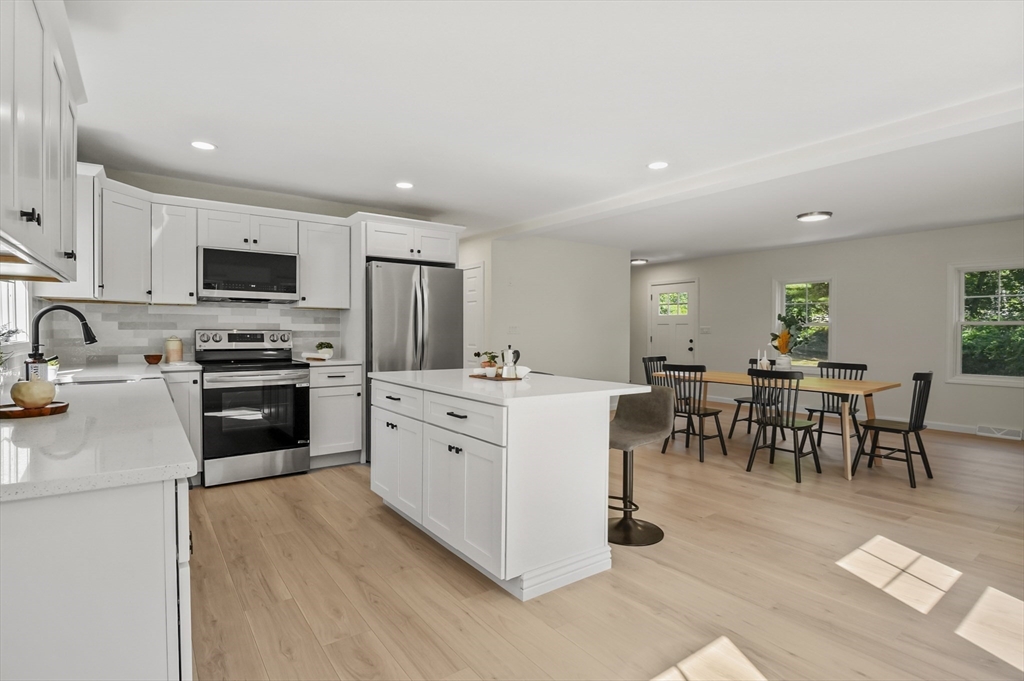 Fully renovated in 2025, this stunning 5-bedroom Cape-style home sits on a scenic 5-acre lot. The inviting living room offers a closet and easy access to the driveway. Enjoy cozy evenings by the fireplace in the dining area. The kitchen features an island breakfast bar, stainless steel appliances, tile backsplash, and recessed lighting. A spacious first-floor laundry room with washer/dryer hookups and a linen closet adds convenience. The main bath includes tile flooring, tub, shower, and storage. A bright sunroom with sliders to the deck, separate entry, and extra storage adds charm. Upstairs offers four generous bedrooms—two with walk-in closets—and a full bath with tile flooring and a tub/shower combo. The fully finished basement includes a bonus room and half bath. A large paved driveway wraps around the home, leading to a generous deck and expansive yard—perfect for enjoying privacy, nature, and peaceful surroundings.