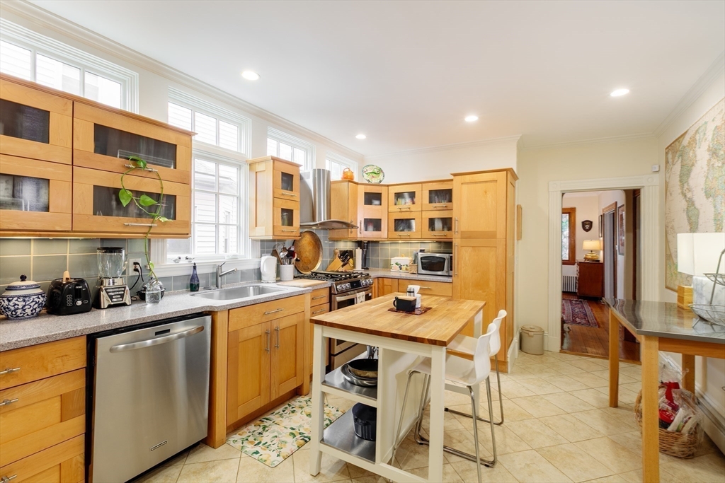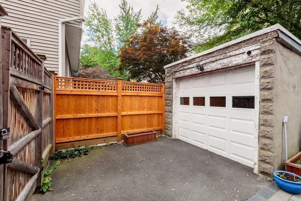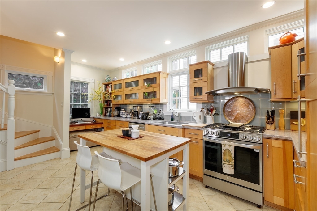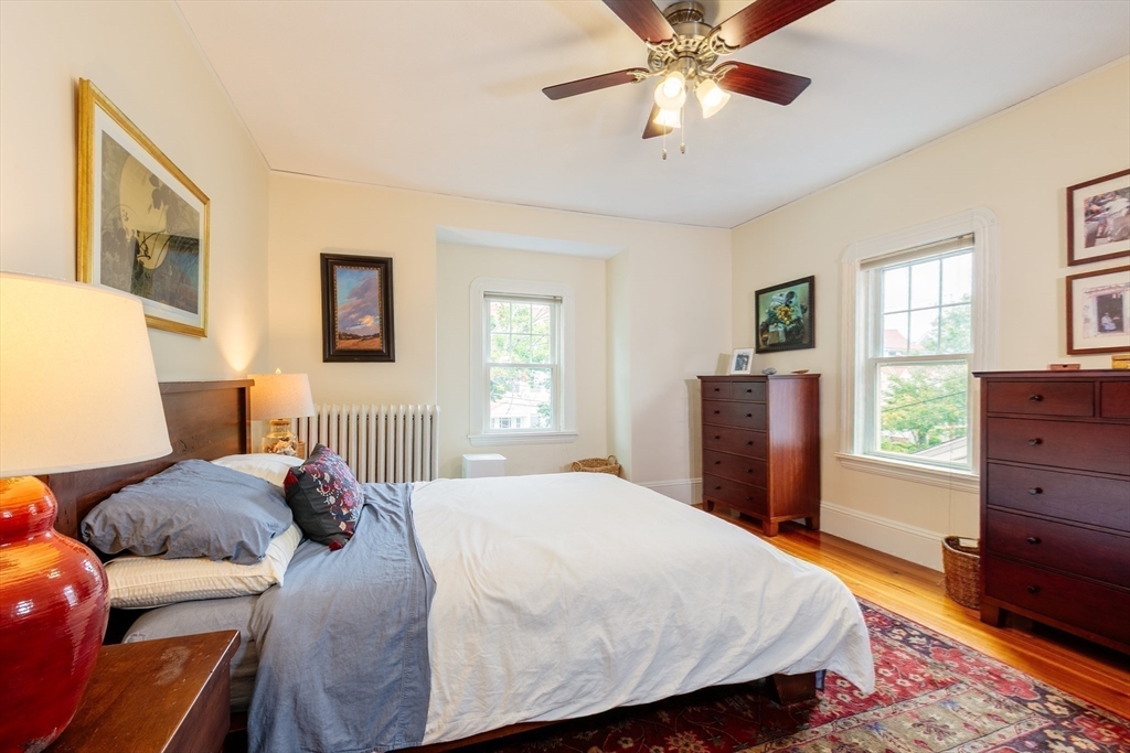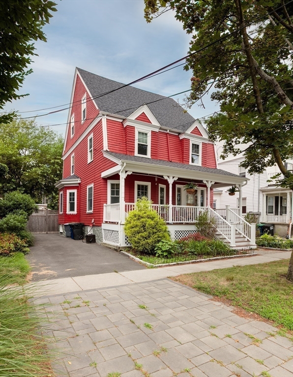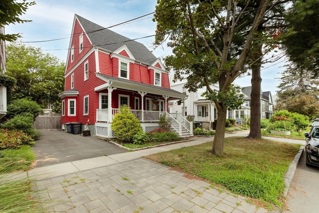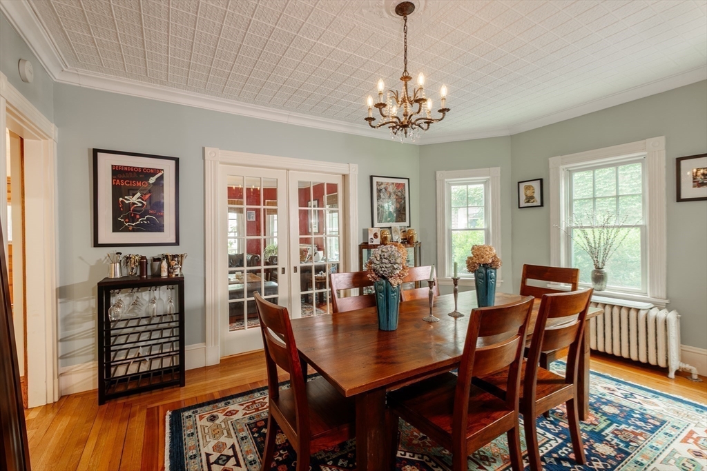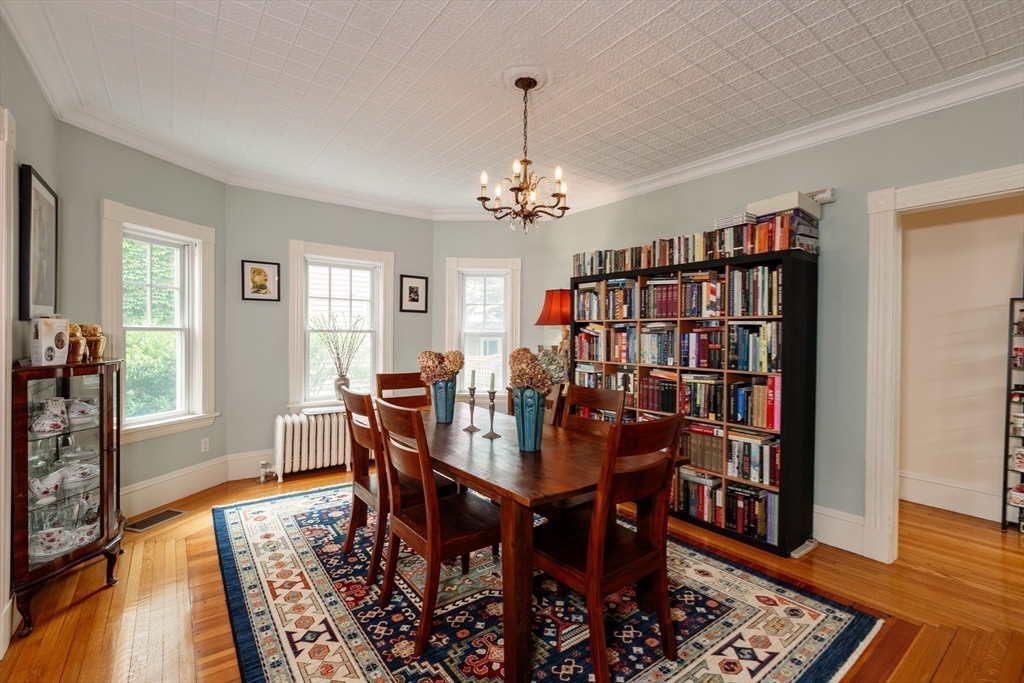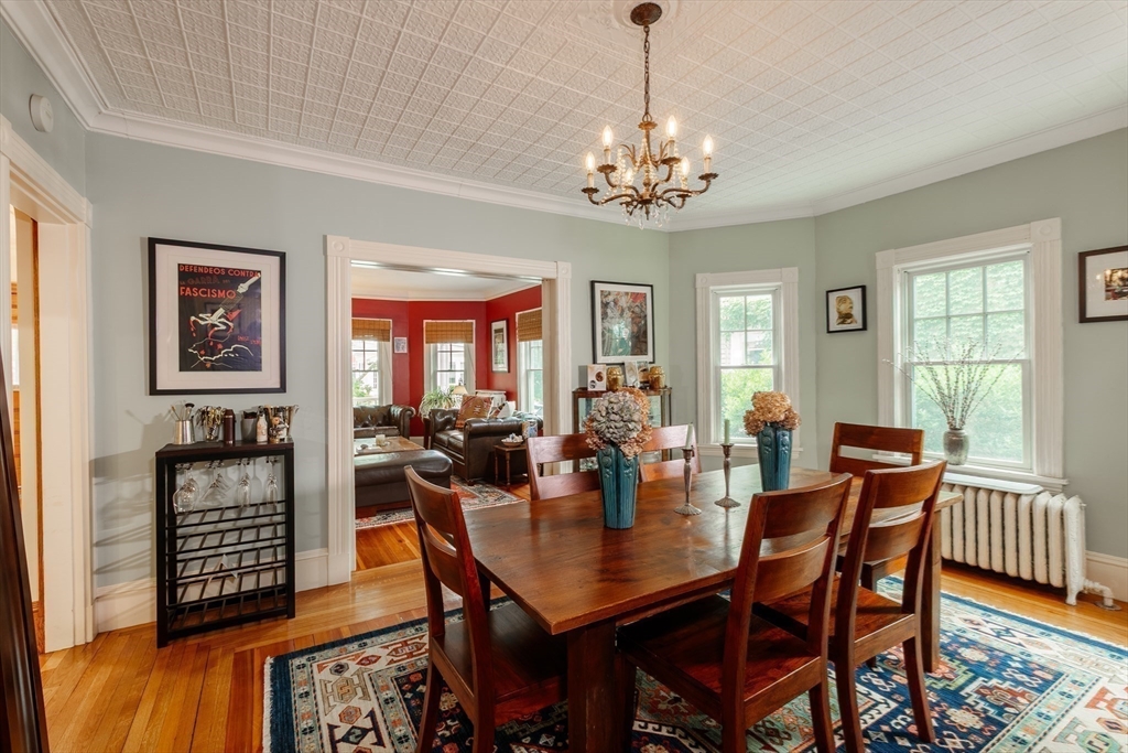 Highland Rd is known and loved for its wide median strip of grass and lg Col. Revival style homes. From the roomy front porch, original oak door w/stnd glass sidelights opens to beautiful foyer w/tin ceiling, bay windows w/stnd glass, hall closet, wd fl. LR features cove ceiling w/ctr medallion and French pocket doors to DR w/ tin ceiling. Spacious kitchen has tiled floor, ample light wd cabinets, ss appliances, multi windows, solid surface cntrs, tile bksplash, built-in desk, and backstair. Hall off kitchen leads to 1/2 bath and door to yd + bsmt. Front stair leads to 3 bdrms, linen clst, and full spa bath w/separate tub and walk-in shower. The entire top fl is a stunning flex space (bdrm/family room/studio) w/cathedral ceiling, electronic skylights, and ceiling fans. Cntrl air. Fenced yd has lg patio, curved retaining wall, perennials, garage, and tall gate to long driveway. W/d in bsmt. Walk to 2 RedLine + 2 GLX stops, bike path, Lex. Park, shops, eateries, theaters, universities.