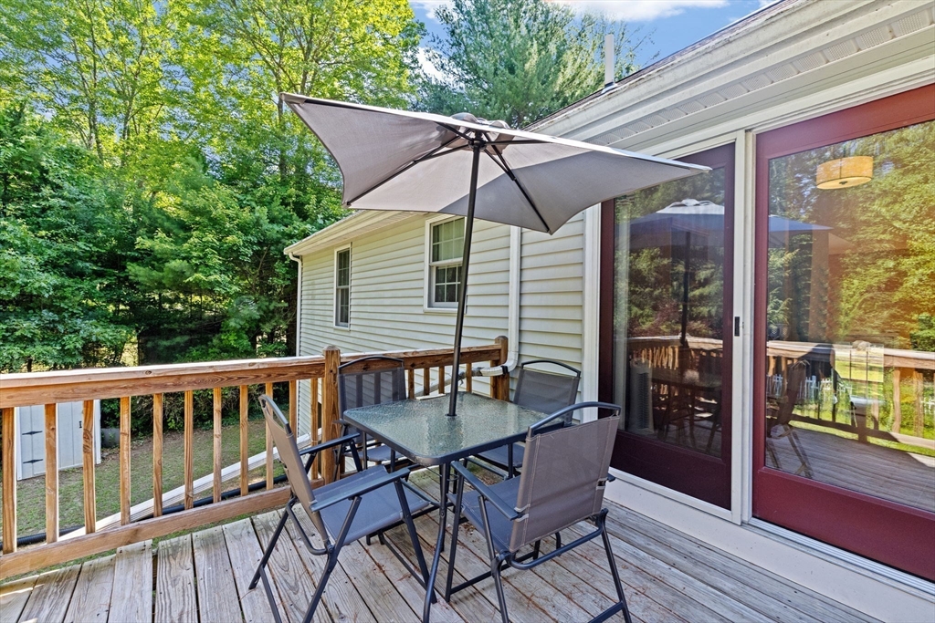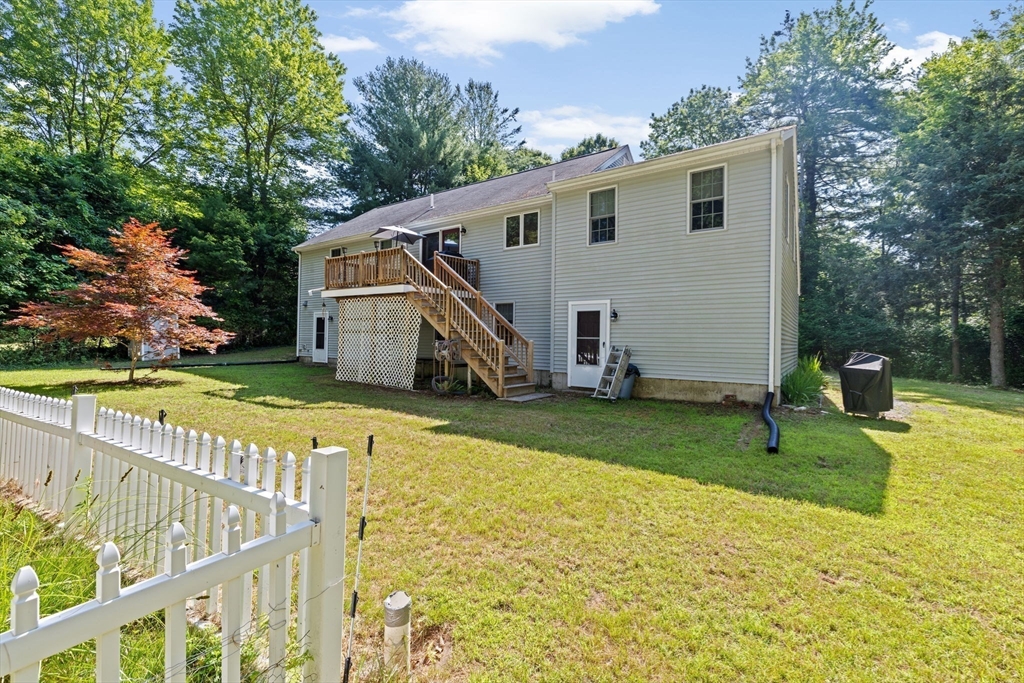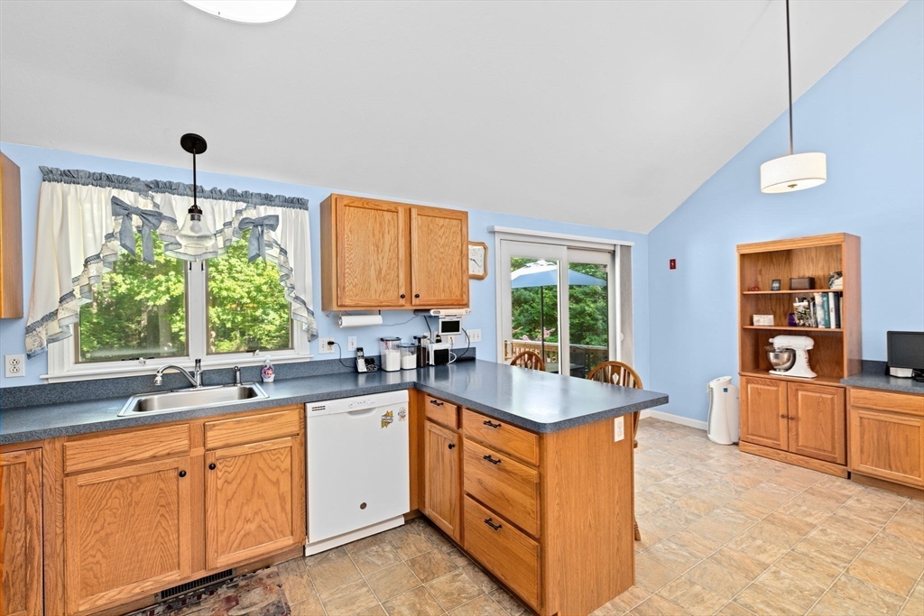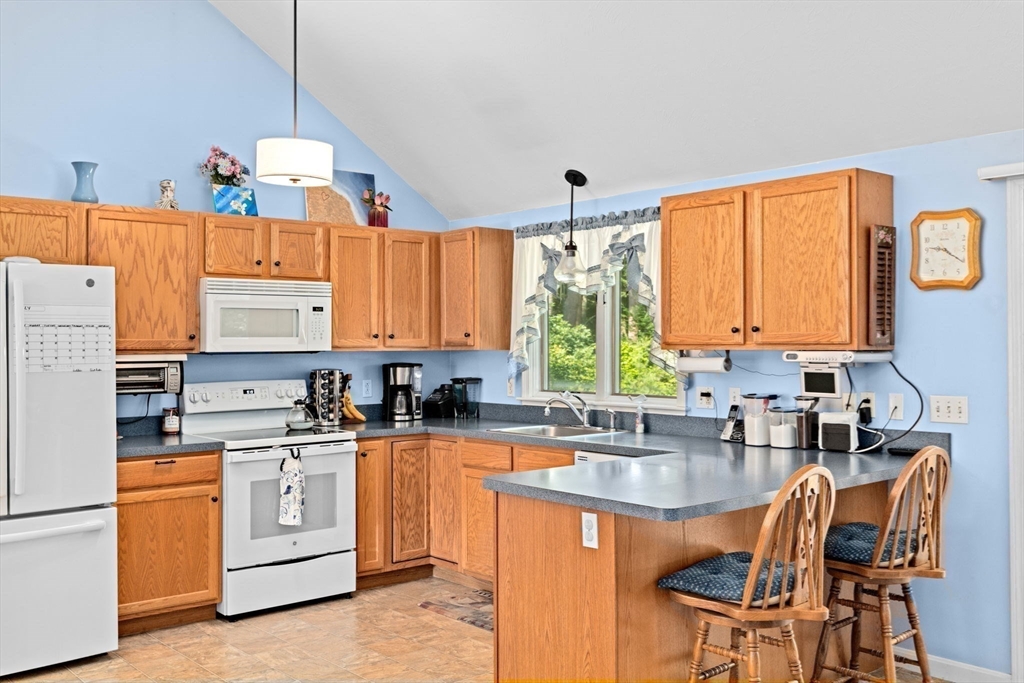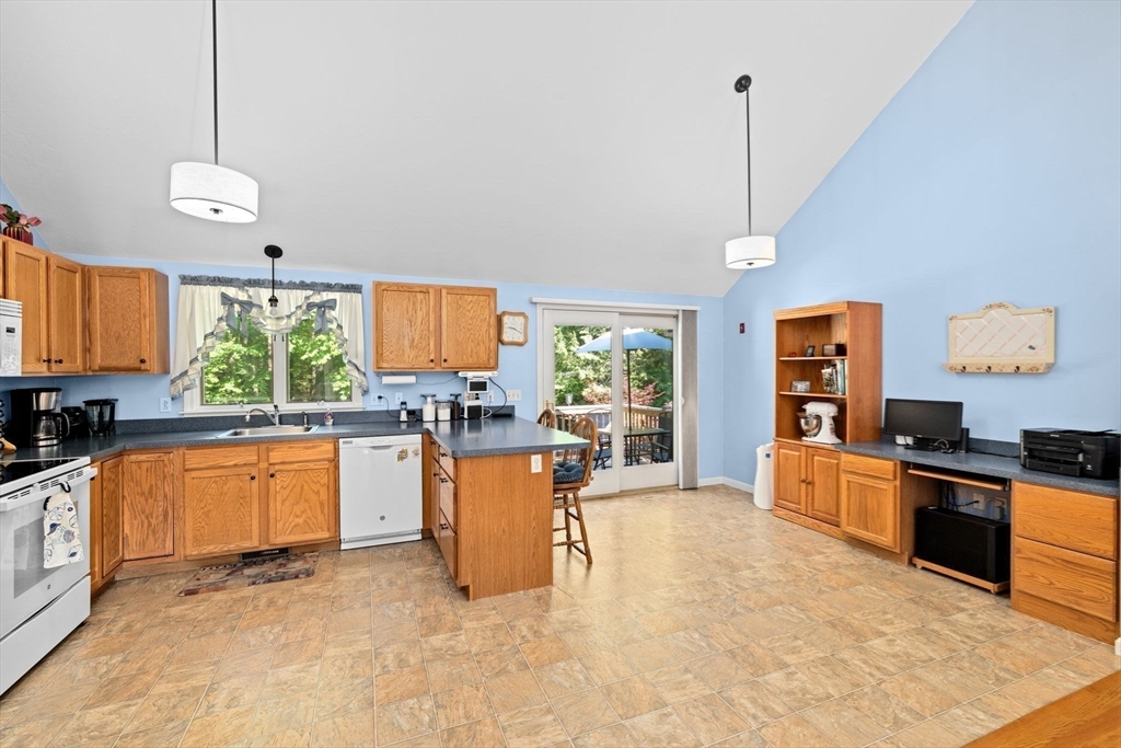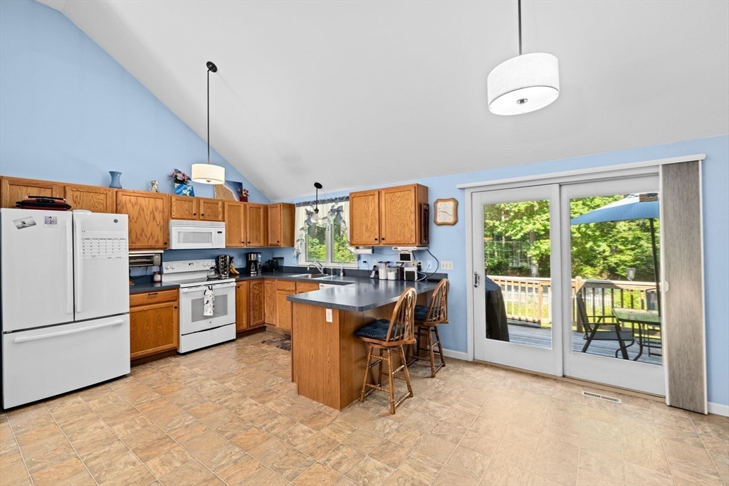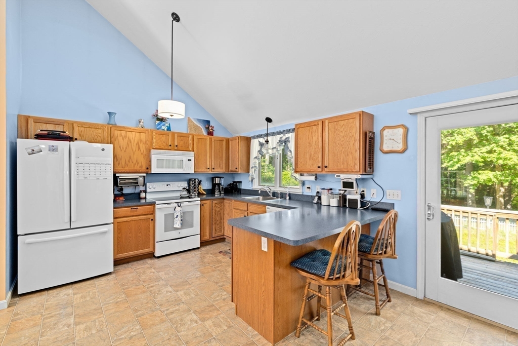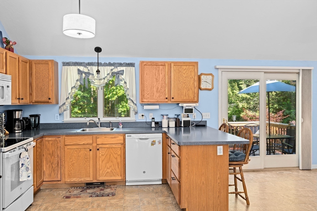 Impeccable, well-maintained, bright home featuring an open layout with cathedral ceilings. Set far back from the road on a beautiful level lot spanning over one acre, the main level of the home features three bedrooms, a full bathroom, a living room with vaulted ceiling, and an open kitchen/dining room with cathedral ceilings. The spacious kitchen has a peninsula for additional counterspace, and a sliding door that leads to the lovely deck overlooking the private, expansive backyard. The lower level has an expansive in-law suite with an oversized full bathroom and complete kitchen, family room, and a bonus room that can be used as a 4th bedroom, home office or playroom. The expansive level yard includes a large, fenced garden perfect for home-grown vegetables. Additional special features include a large one-car attached garage, whole house water filter, central AC, spacious outdoor shed, and generator hookup. A bright, airy home in a beautiful, tranquil, private setting.