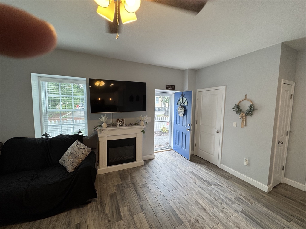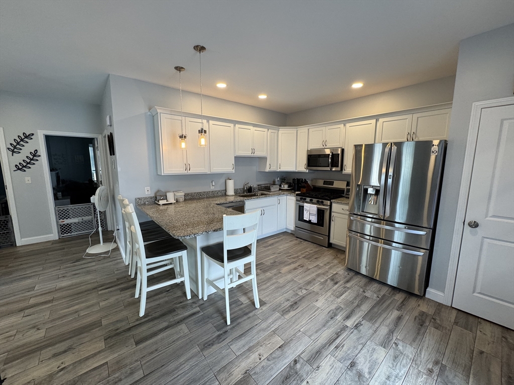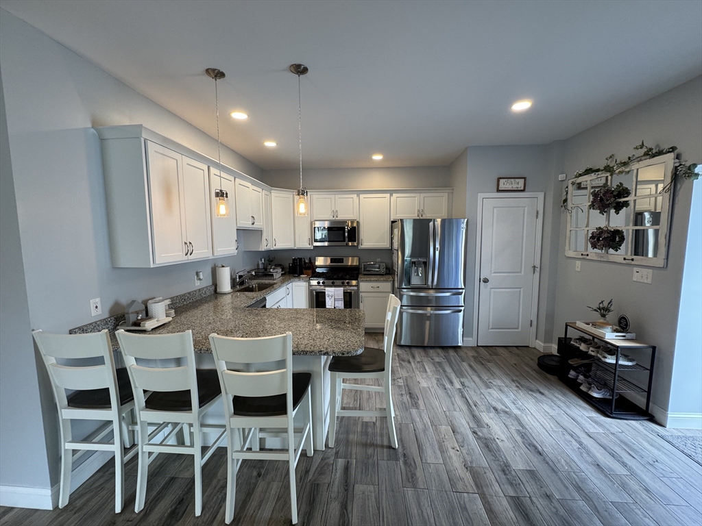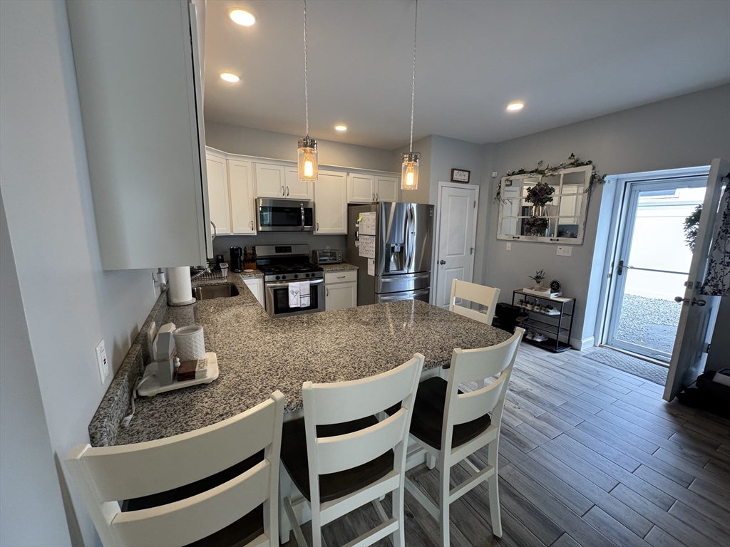 NO CONDO FEES! Single-Level Living with Style & Convenience! Welcome to this beautifully renovated condex offering zero stairs to entry, extra-wide doors, and 9-foot ceilings throughout! Ideal for pet lovers, this home has your own fully fenced in private area. Exterior has maintenance free vinyl siding, new gutters, vinyl windows. 2-zone radiant heated floors. Custom white kitchen with granite counters with gas range, microwave, dishwasher. Breakfast bar with pendant lighting & recessed lights. Enjoy the open-concept living, combining the kitchen, dining, and living areas for a spacious modern feel. Primary Bedroom has newer carpeting with two double closets . Second Bedroom has newer carpet, large closet. Bathroom has Quartz double vanity with washer/dryer combo. Stay cool in summer with a mini-split AC in Living area. Private 11x10 storage area in the back, two off-street parking spaces. This home has it all, no condo fees, private fenced in outdoor space. Book your showing today.