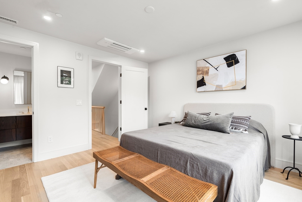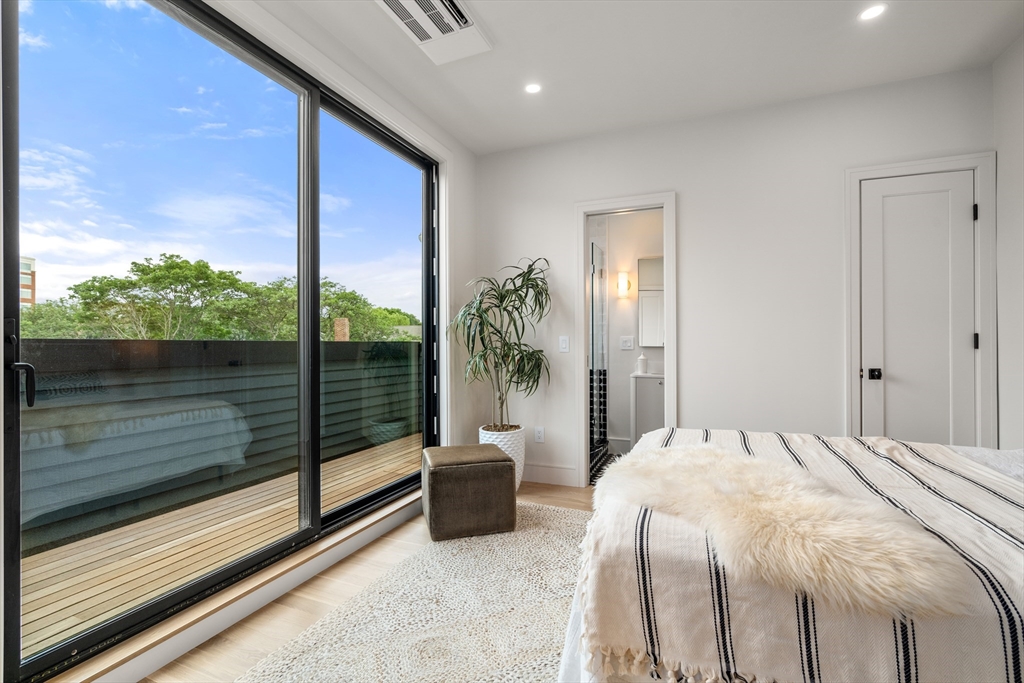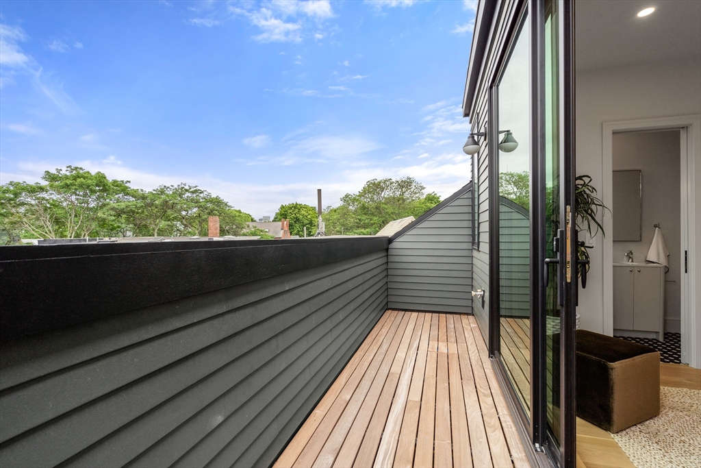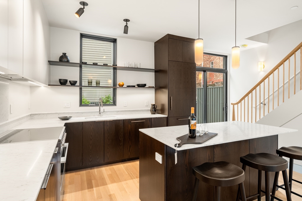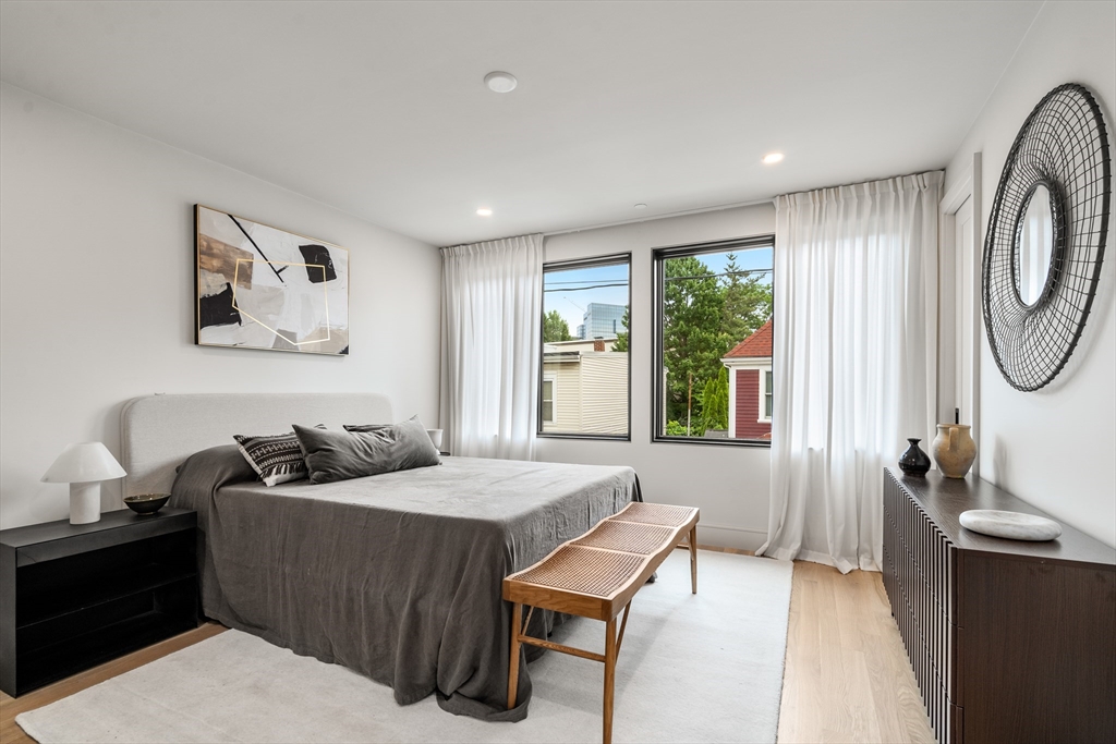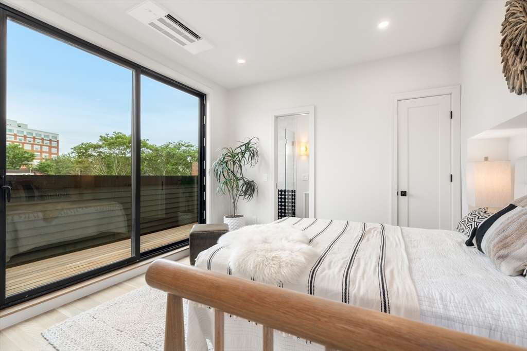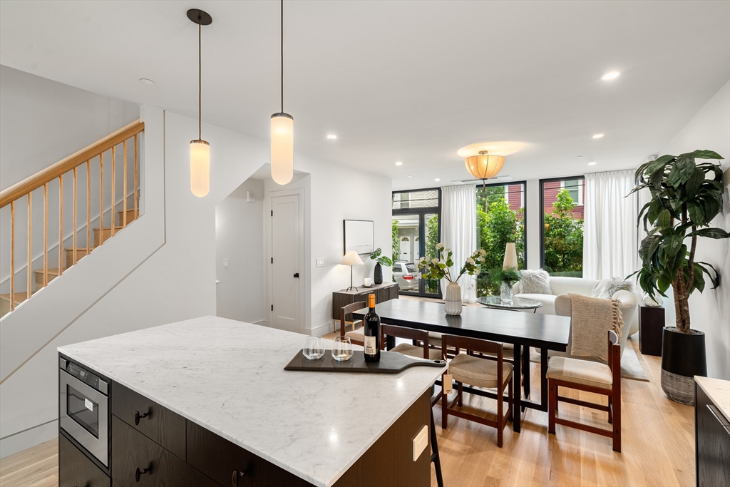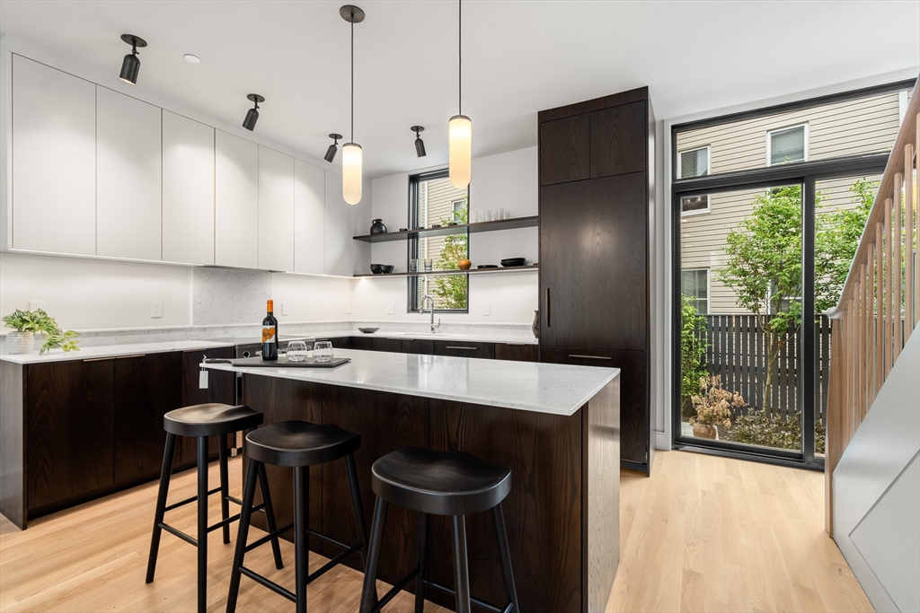 Expertly renovated & thoughtfully reimagined by a respected local builder, this end-unit home offers 4 levels of bespoke design. The main floor features an open-concept living and dining area that flows into a stunning kitchen with custom cabinetry, an induction cooktop, center island, and sliding glass doors to the 21' private patio with a landscaped garden. The second level offers 2 bedrooms: one with dual walk-in closets & access to a stylish four-piece hall bath, and another with a double closet. At the top of a skylit stairway, the serene primary suite is complete with 2 closets, an en-suite bath, and an 18' private porch beyond sliding glass doors. The versatile lower level includes a family room with laundry, full bath, and an office/guest space with a walk-in closet. Other comforts include 4-zones of heat, central air conditioning, a fire sprinkler system, and association snow removal. Located just a few blocks to Kendall Square and sited near multiple parks & swimming pools.