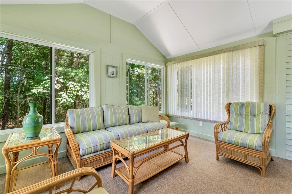 Well-maintained Vineyard-style condo in Southport, offering 2 bedrooms and 2 full baths—all on one level. Ideally located near guest parking with open space surroundings and easy access to community amenities. The kitchen features granite countertops and all new appliances, opening to a light-filled dining area with vaulted ceilings and a Palladian window. Hardwood floors run throughout the main living areas, complemented by brand new carpeting and a wood-burning fireplace, along with a lovely three-season room. The spacious primary suite includes a walk-in closet and private bath. A clean, dry unfinished basement provides excellent storage or flexible use. Enjoy all that Southport offers, including golf, tennis, walking trails, indoor/outdoor pools, a fitness center, game room, and 24-hour security. Conveniently located near Mashpee Commons, restaurants, golf, and beautiful beaches.