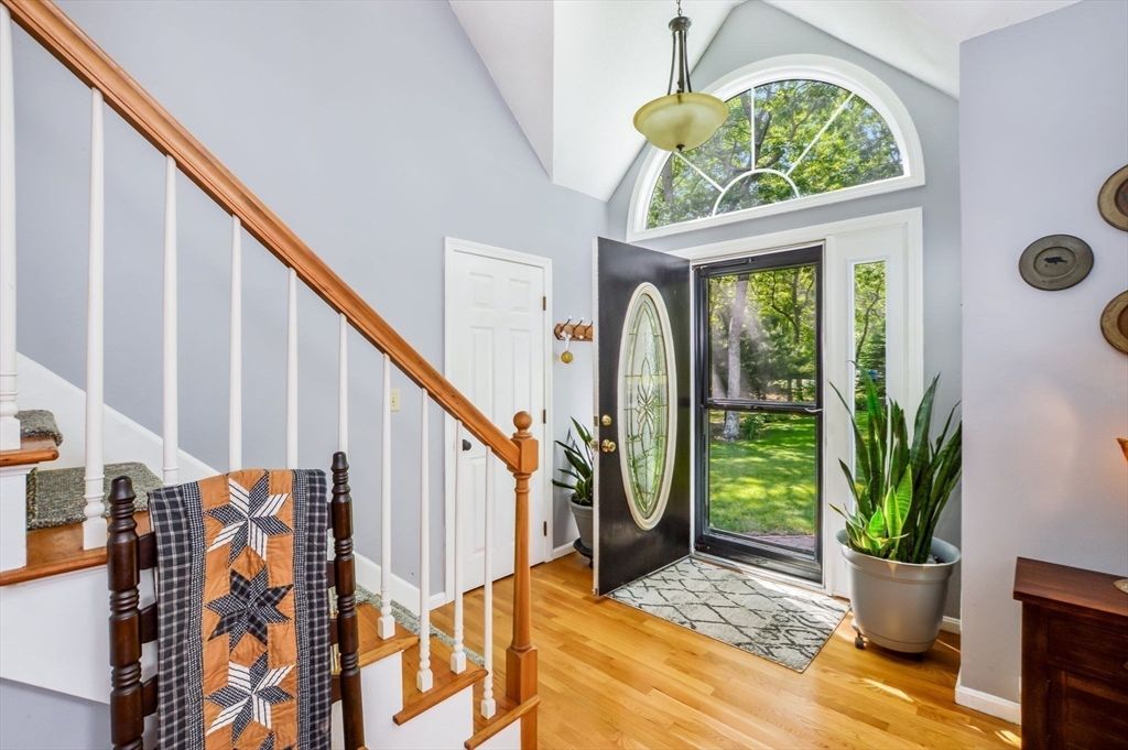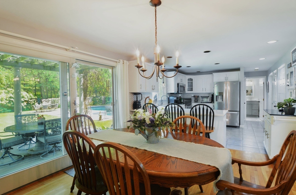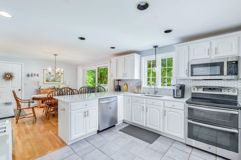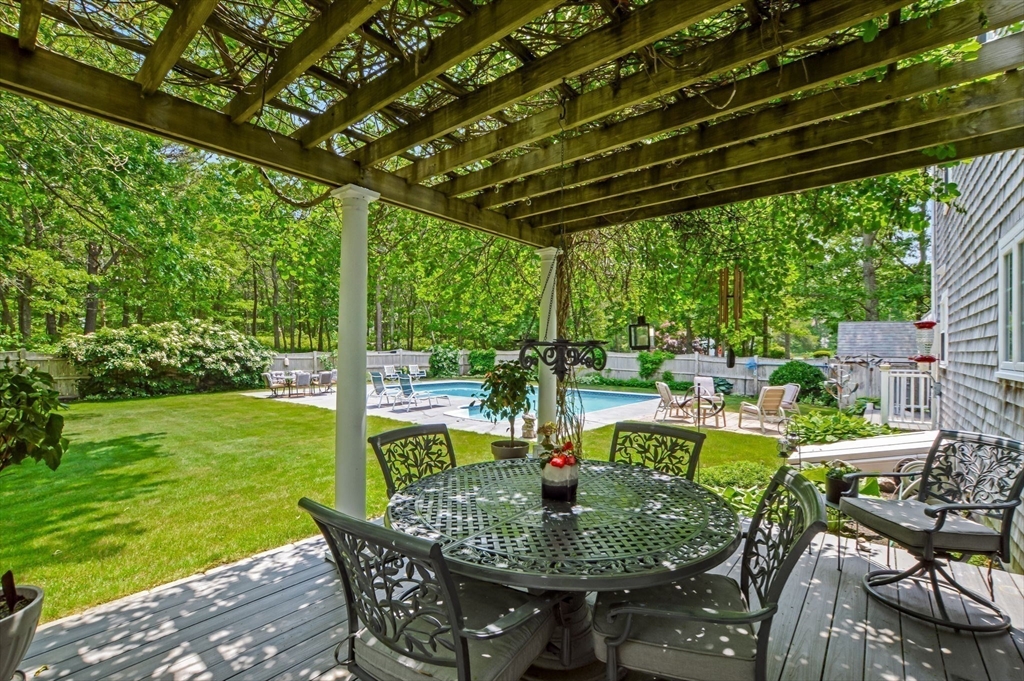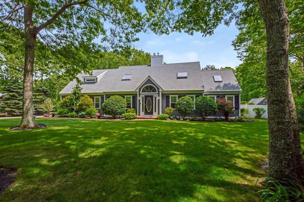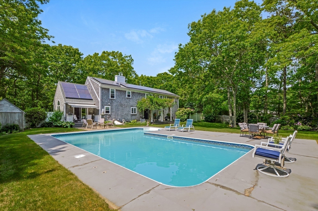 Very private setting boasting 1.5 acres located in East Sandwich, on beautiful Cape Cod. Easy access to schools, shopping, public golf course, east sandwich beaches, sandy neck beach, bike path, and commuting. This immaculate home offers a flexible floor plan with 4 bedrooms, 1st floor bedroom utilized as a large family room, 3 updated bathrooms. Front entry platinum door welcomes guests into a bright living room with skylight, cathedral ceilings, cozy gas fireplace and gleaming hardwood floors. Spacious Open kitchen & dining room features white cabinets, quartz countertops, stainless steel appliances, convenient interior cabinet pull out drawers, dining room slider opens to a new composite deck with covered wisteria pergula. Enjoy interior or exterior gatherings with stunning landscaping, irrigation, inground heated pool. Impressive 2 car garage with additional cabinet storage. Energy efficient solar panels.