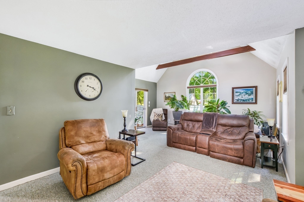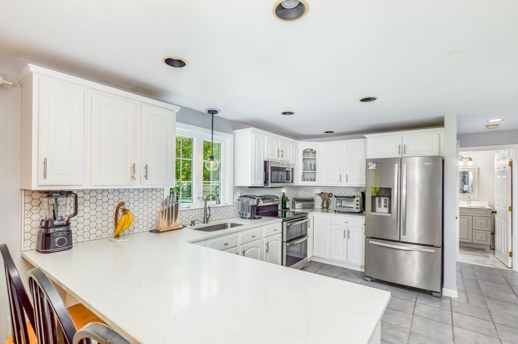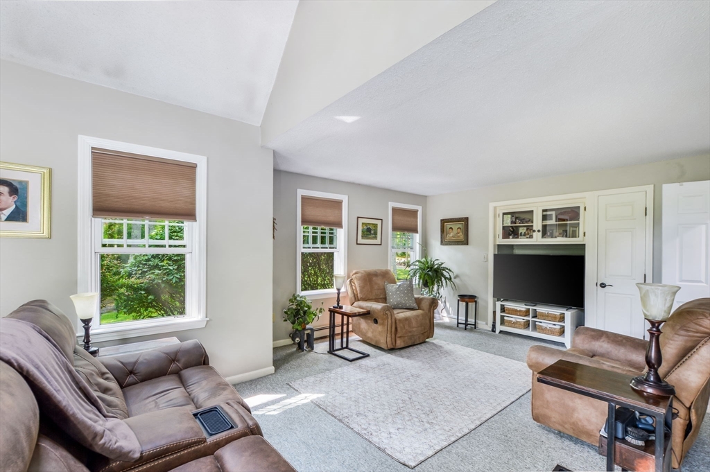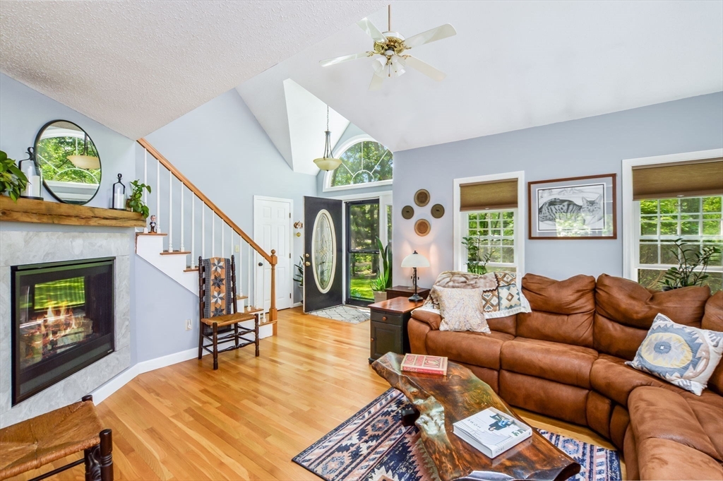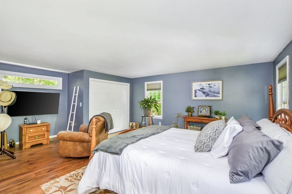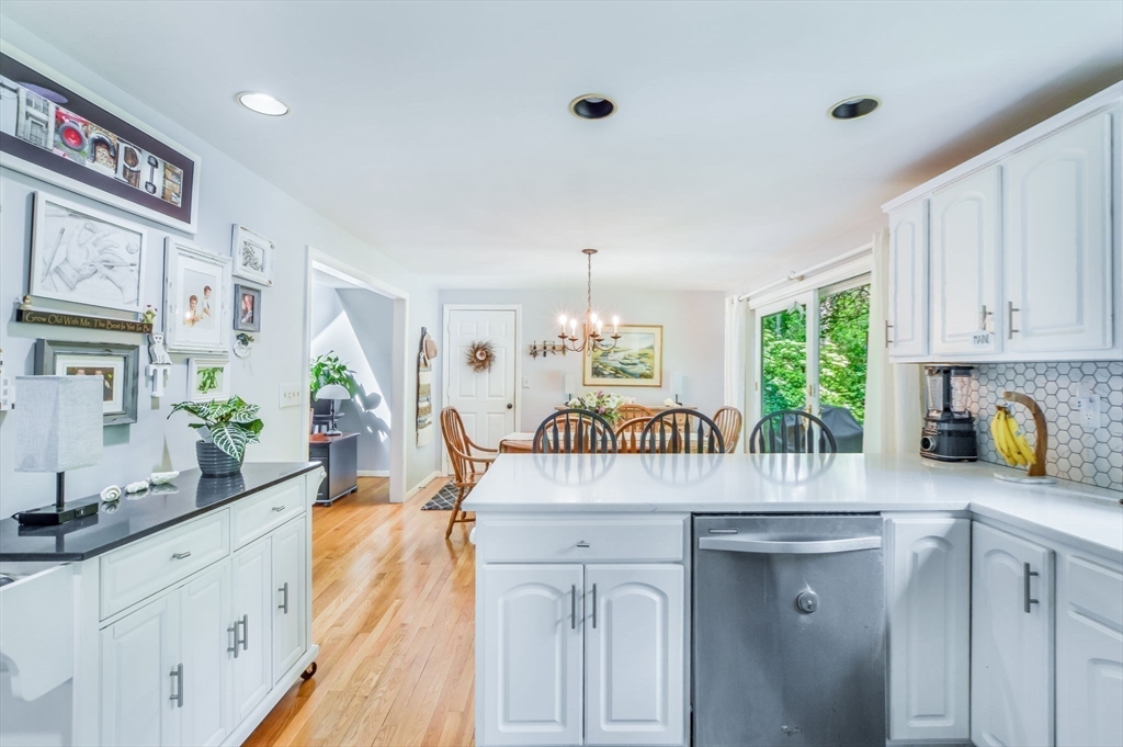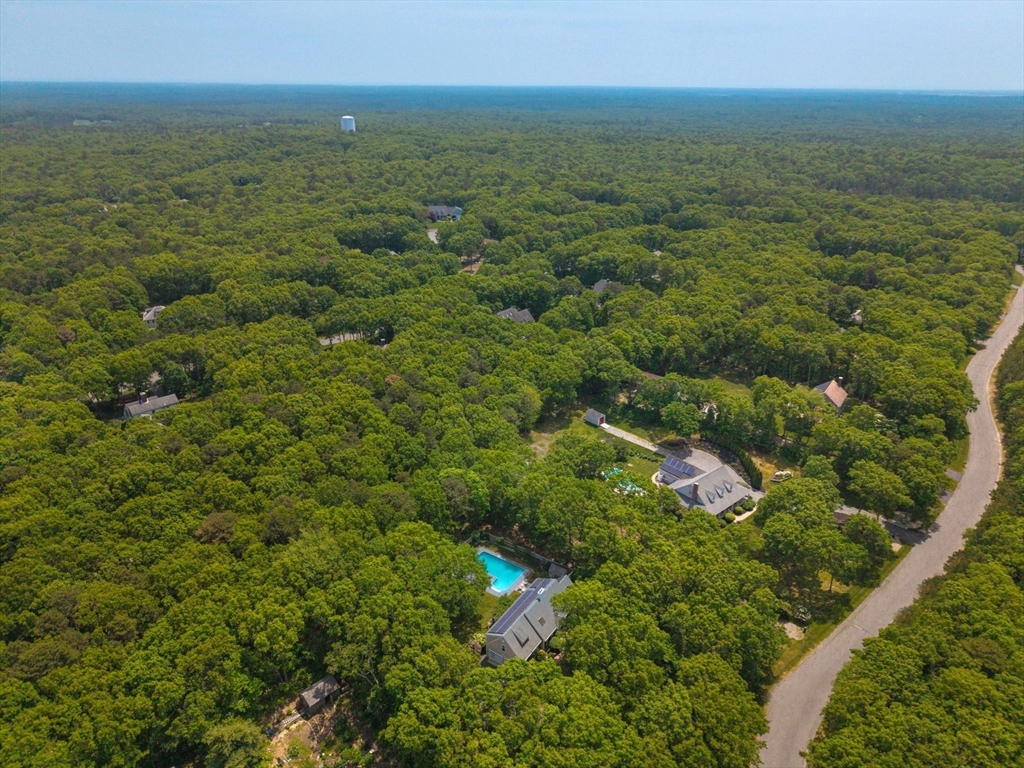 Very private setting boasting 1.5 acres located in East Sandwich, on beautiful Cape Cod. Easy access to schools, shopping, public golf course, east sandwich beaches, sandy neck beach, bike path, and commuting. This immaculate home offers a flexible floor plan with 4 bedrooms, 1st floor bedroom utilized as a large family room, 3 updated bathrooms. Front entry platinum door welcomes guests into a bright living room with skylight, cathedral ceilings, cozy gas fireplace and gleaming hardwood floors. Spacious Open kitchen & dining room features white cabinets, quartz countertops, stainless steel appliances, convenient interior cabinet pull out drawers, dining room slider opens to a new composite deck with covered wisteria pergula. Enjoy interior or exterior gatherings with stunning landscaping, irrigation, inground heated pool. Impressive 2 car garage with additional cabinet storage. Energy efficient solar panels.