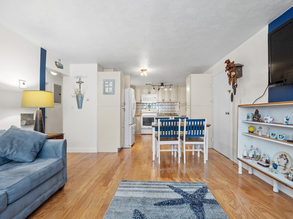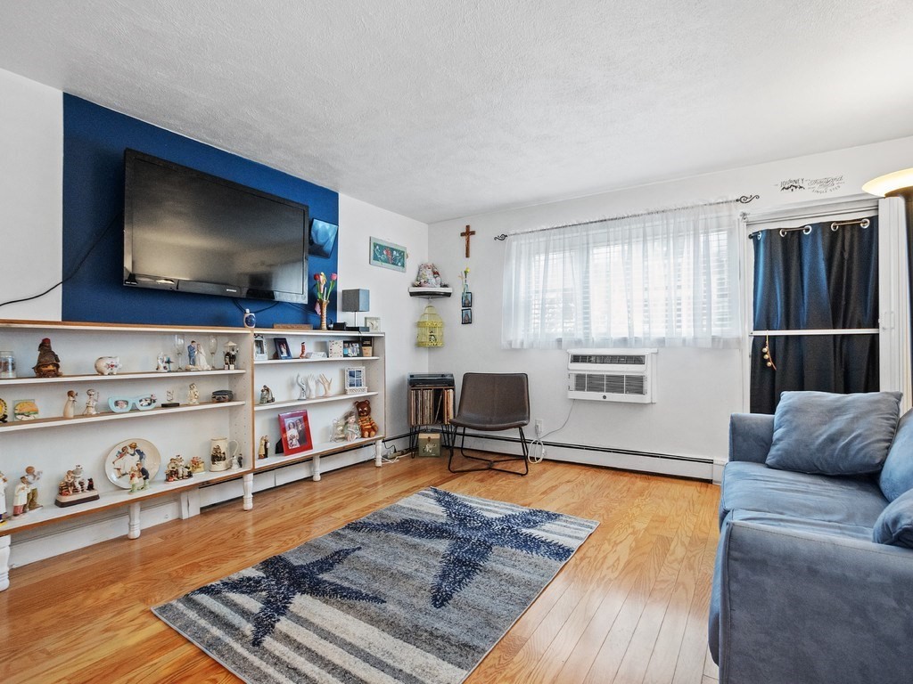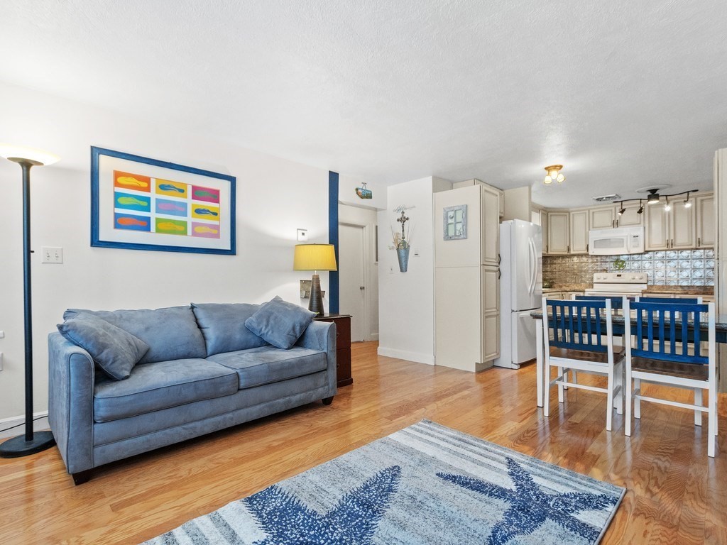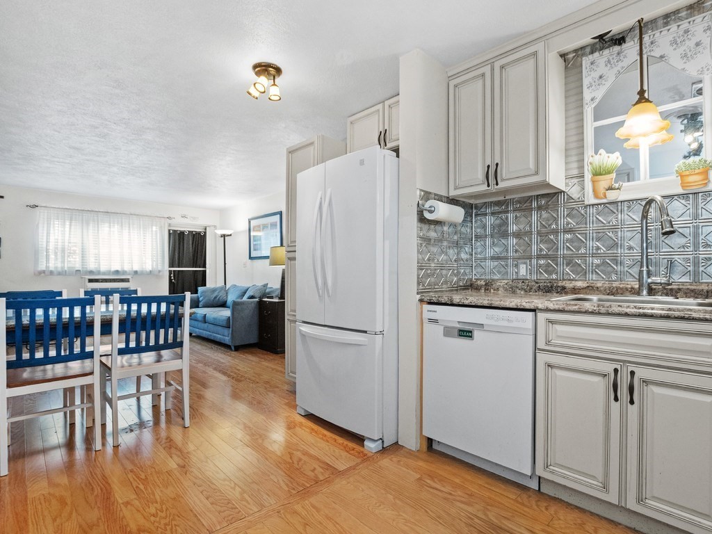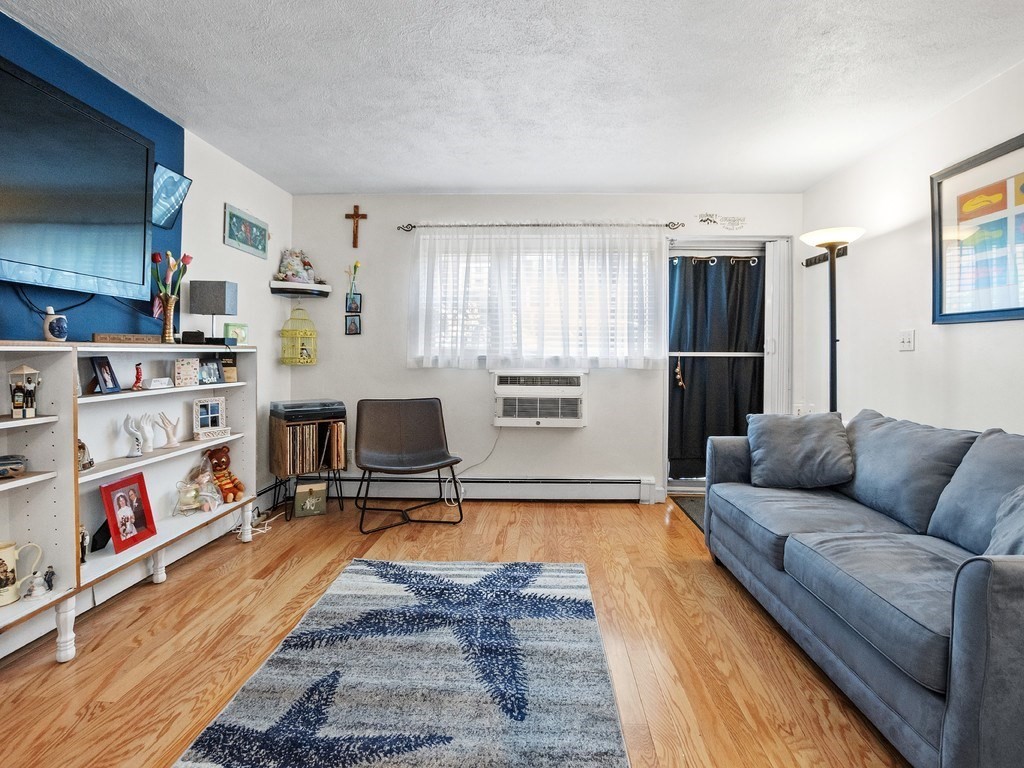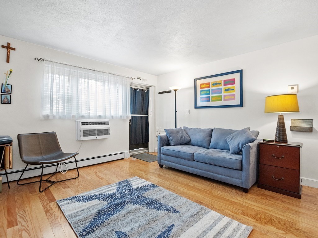 Highly desirable Garden Grove Condominiums located in the heart of Warrendale! This beautifully maintained first-floor unit offers a unique private entrance and a thoughtfully updated layout. The 2017 custom kitchen features stylish cabinetry and a dining area that opens to a bright, oversized living room with built-in shelving and a mounted TV. Two spacious queen-sized bedrooms offer ample closet space. Additional features include full-size newer windows, gleaming hardwood floors throughout, a tiled full bath, and freshly painted interior. Enjoy the convenience of private storage, on-site coin-op laundry, and professionally managed grounds with a seasonal in-ground pool. Low condo fee includes heat and hot water. New roof installed in 2022. Ideally located just steps to public transportation, shops, restaurants, and all that Waltham has to offer. A great opportunity for first-time buyers, downsizers, or investors!