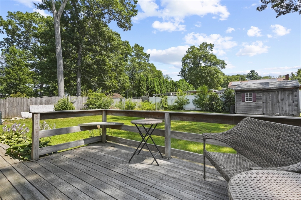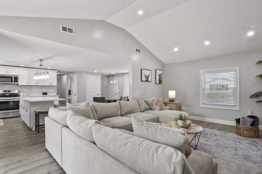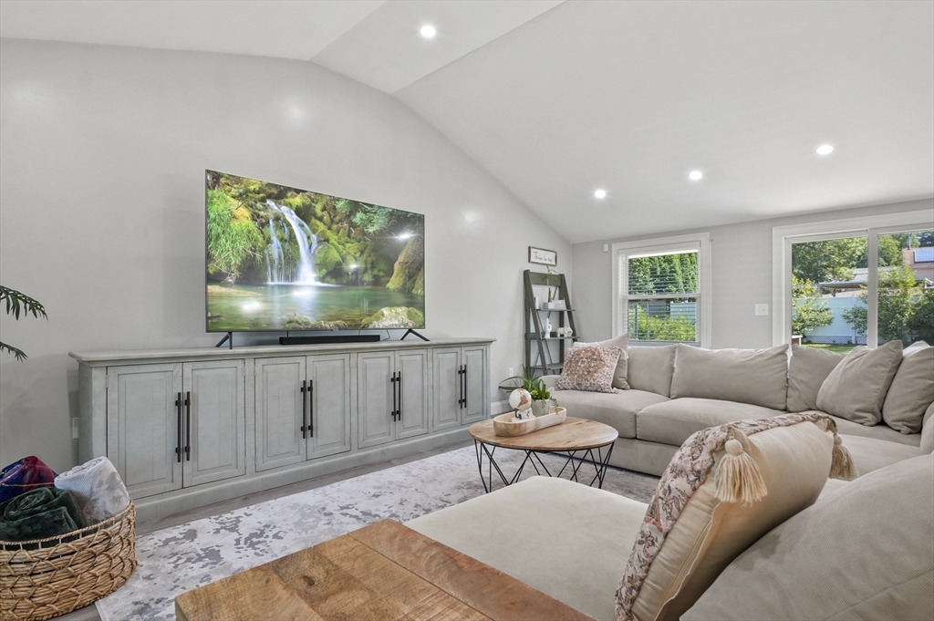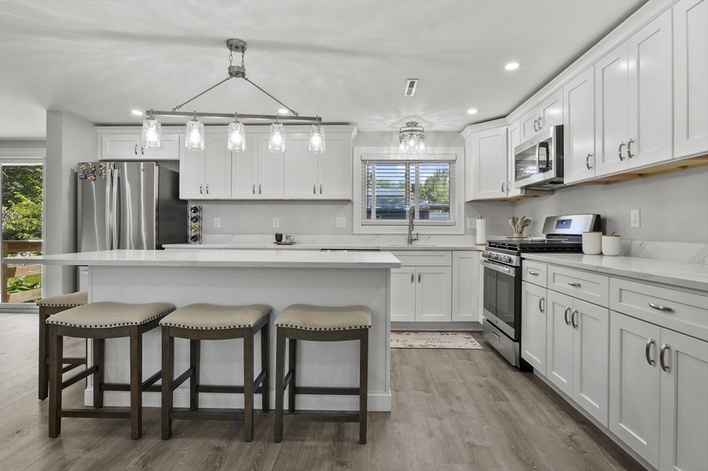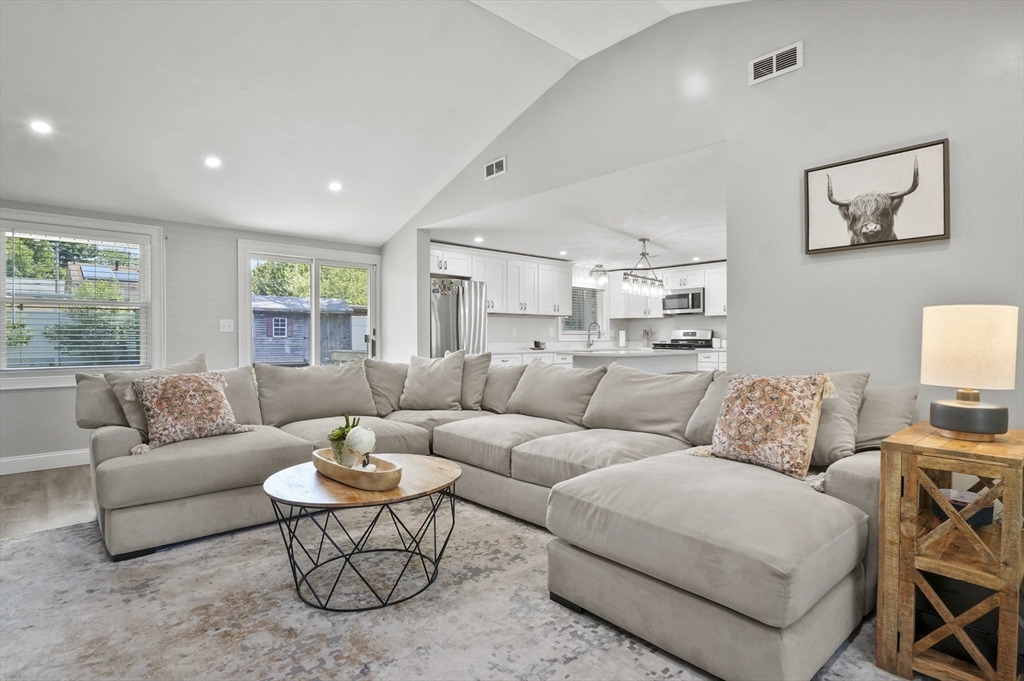 Step into this beautifully renovated ranch style home, where every detail has been thoughtfully upgraded to offer comfort, style, and functionality. Located on a newly paved quiet street in Brockton 's East Side, this 3-bedroom, 1 bath home is the perfect blend of modern design and cozy charm. Inside, you'll find an oversized kitchen with quartz countertops, a center island, and soft -close hardwood cabinetry-ideal for cooking, hosting or gathering with loved ones. Three generous sized bedrooms, all with recessed lighting. An expansive family room which features cathedral ceilings, recessed lighting, and sliding doors that open to a private patio, creating a seamless indoor-outdoor flow. The remodeled bathroom boasts tiled finishes and stone countertops Outside, enjoy a large fenced private yard perfect for entertaining, gardening or relaxing under the stars. A new roof, upgraded plumbing and electrical systems, a new furnace and water heater, makes this one move-in READY!