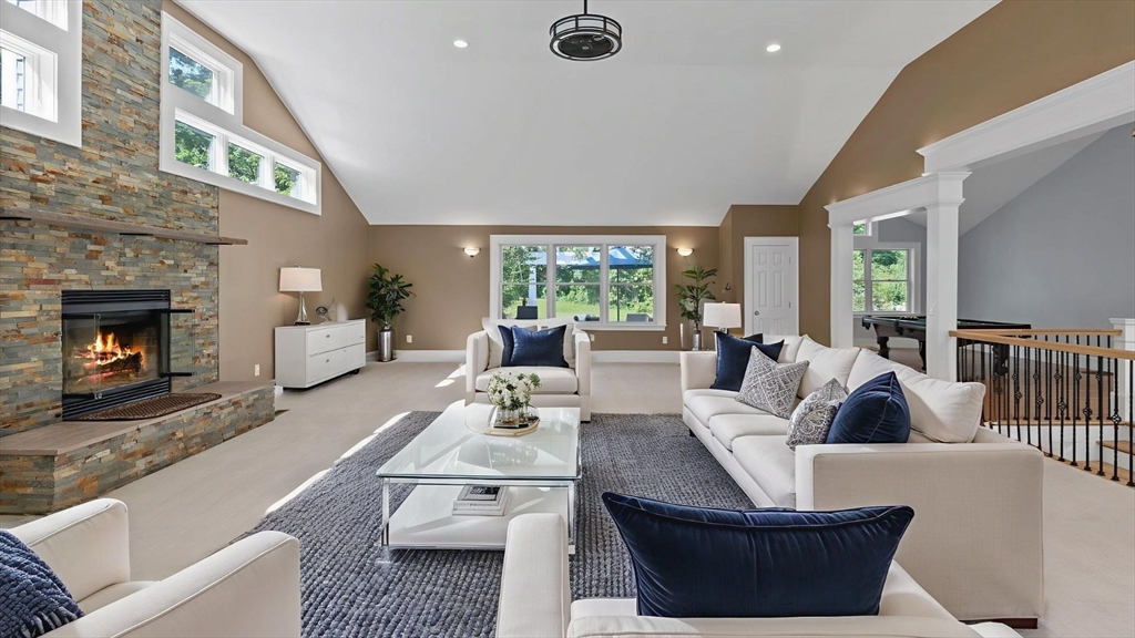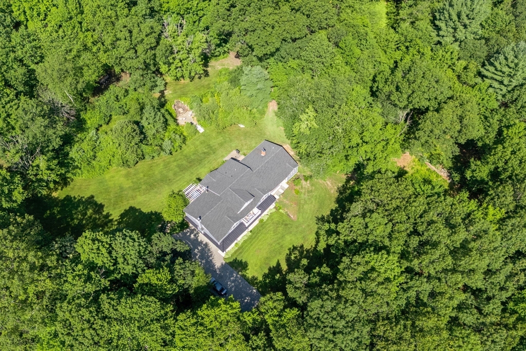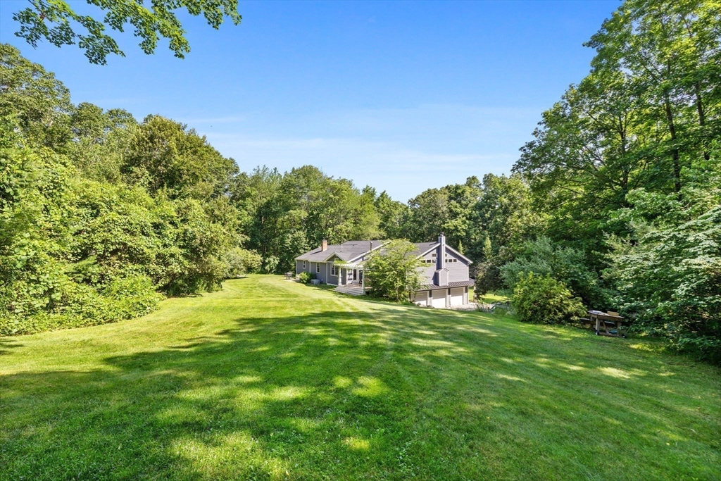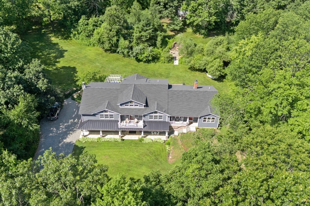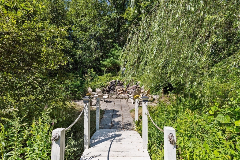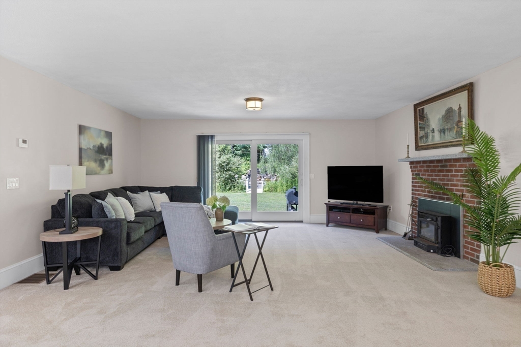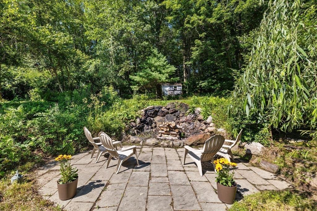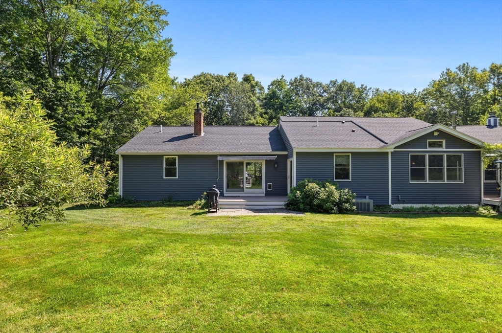 Nestled in the bucolic woods of Boxford, this beautifully updated 4 bed, 3 bath ranch is set on over 9 acres of serene privacy and natural beauty. Thoughtful craftsmanship is evident throughout, offering timeless charm and modern convenience. Live comfortably on the main level with the option to expand into the finished lower level-perfect for guests, recreation, or a home office. The oversized living room is ideal for entertaining and features a striking floor-to-ceiling stone fireplace w/brand-new carpeting. The updated kitchen boasts granite counters, all SS appliances, including brand new stove and refrigerator, a charming farmer's sink, soft lighting above the cabinets, and a spacious walk-in pantry. The inviting family room with a wood-burning stove offers a more intimate gathering space. The primary suite features HDWD flrs and an updated en-suite bath, while 2 more bedrms round out the 1st floor with HDWD flooring. Enjoy the backyd oasis with ovrszd firepit & patio w/pergola!