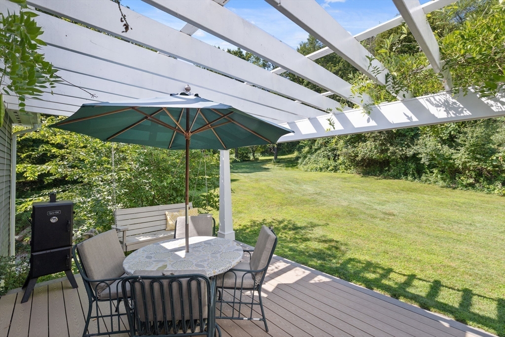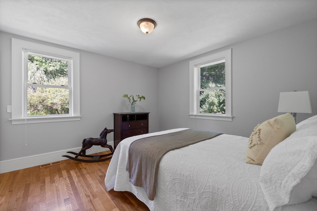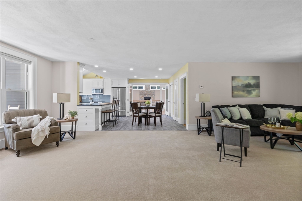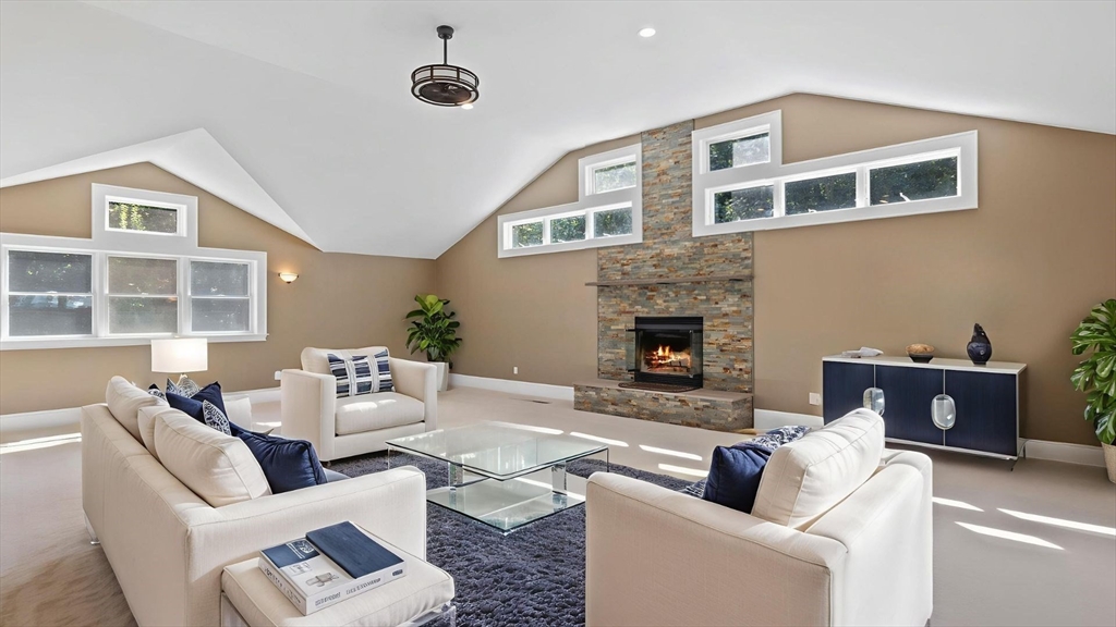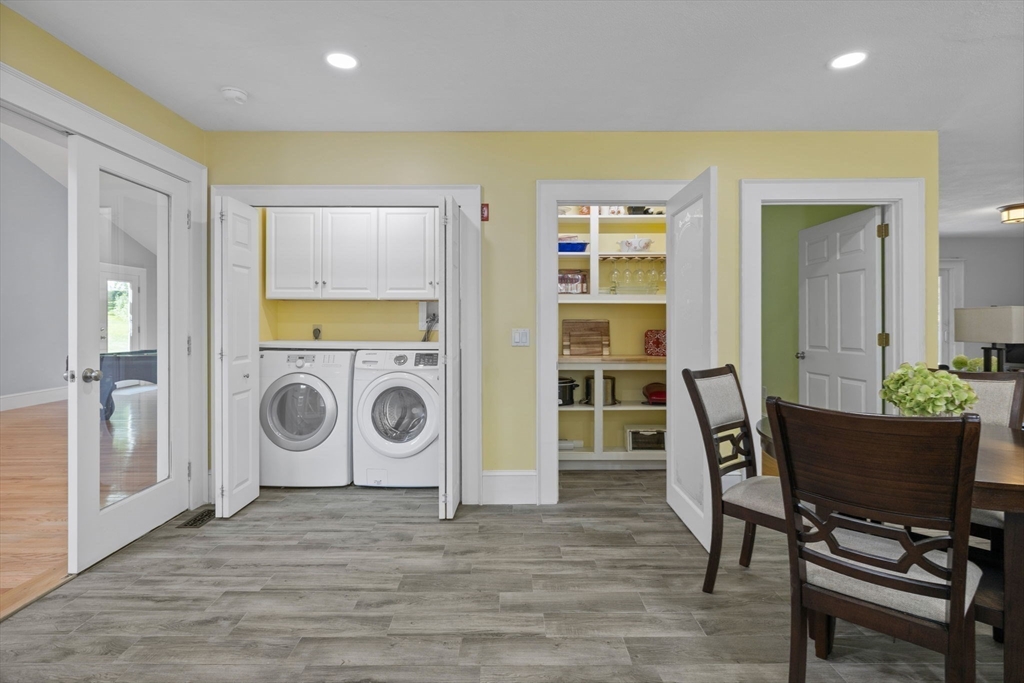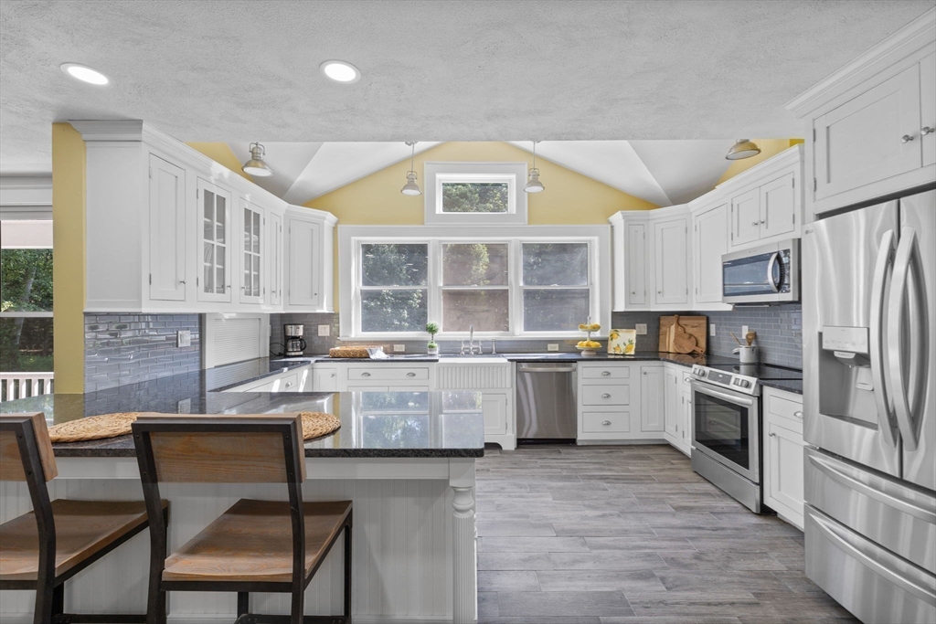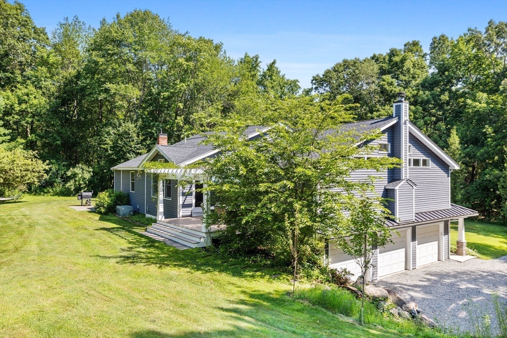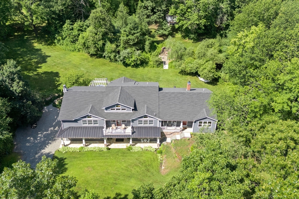 Nestled in the bucolic woods of Boxford, this beautifully updated 4 bed, 3 bath ranch is set on over 9 acres of serene privacy and natural beauty. Thoughtful craftsmanship is evident throughout, offering timeless charm and modern convenience. Live comfortably on the main level with the option to expand into the finished lower level-perfect for guests, recreation, or a home office. The oversized living room is ideal for entertaining and features a striking floor-to-ceiling stone fireplace w/brand-new carpeting. The updated kitchen boasts granite counters, all SS appliances, including brand new stove and refrigerator, a charming farmer's sink, soft lighting above the cabinets, and a spacious walk-in pantry. The inviting family room with a wood-burning stove offers a more intimate gathering space. The primary suite features HDWD flrs and an updated en-suite bath, while 2 more bedrms round out the 1st floor with HDWD flooring. Enjoy the backyd oasis with ovrszd firepit & patio w/pergola!
