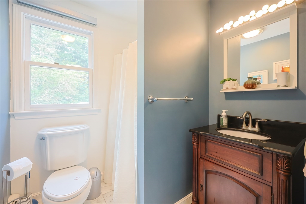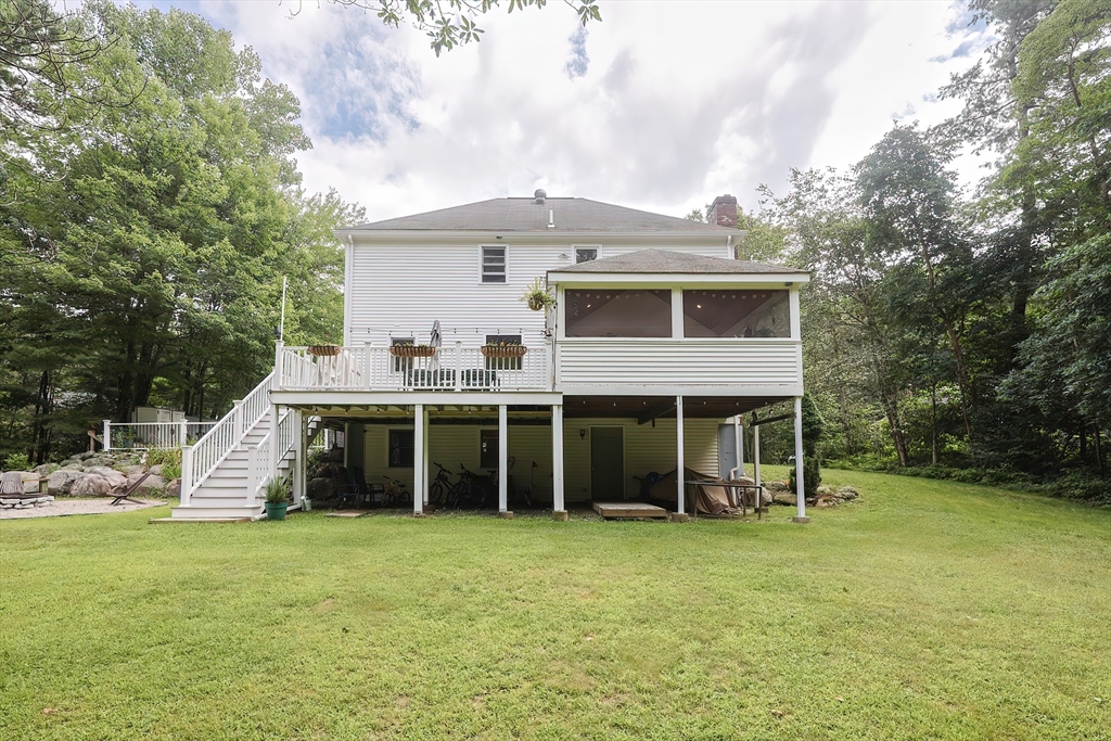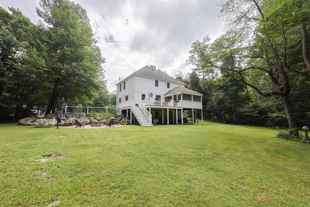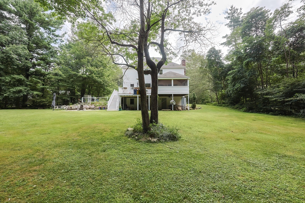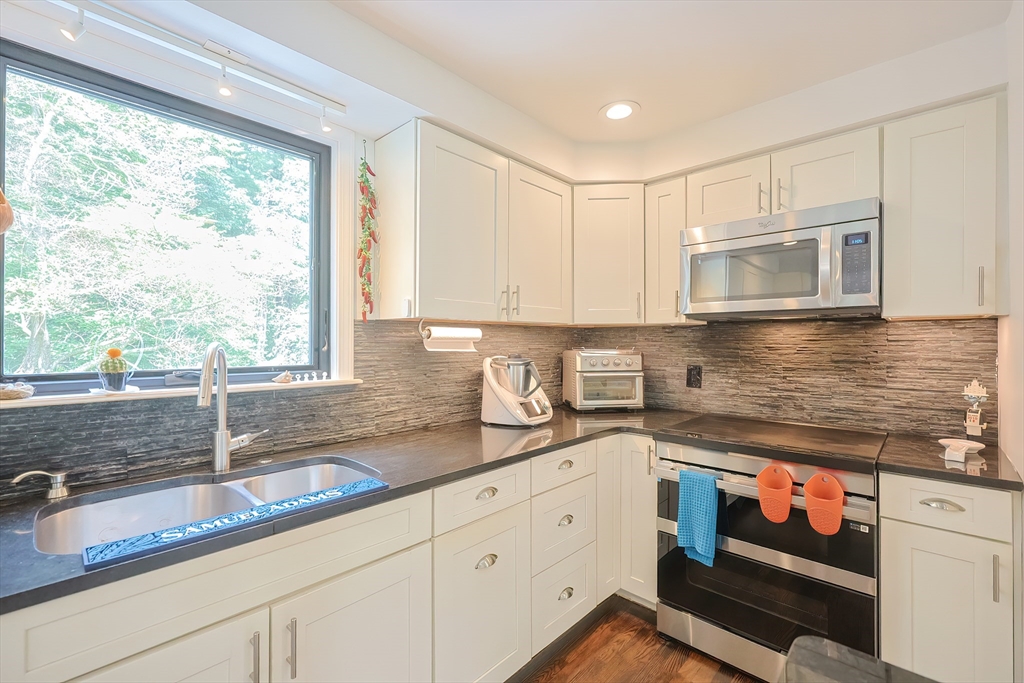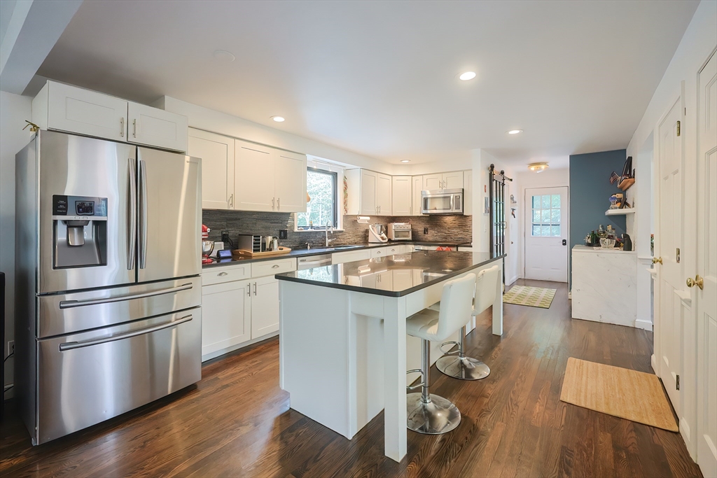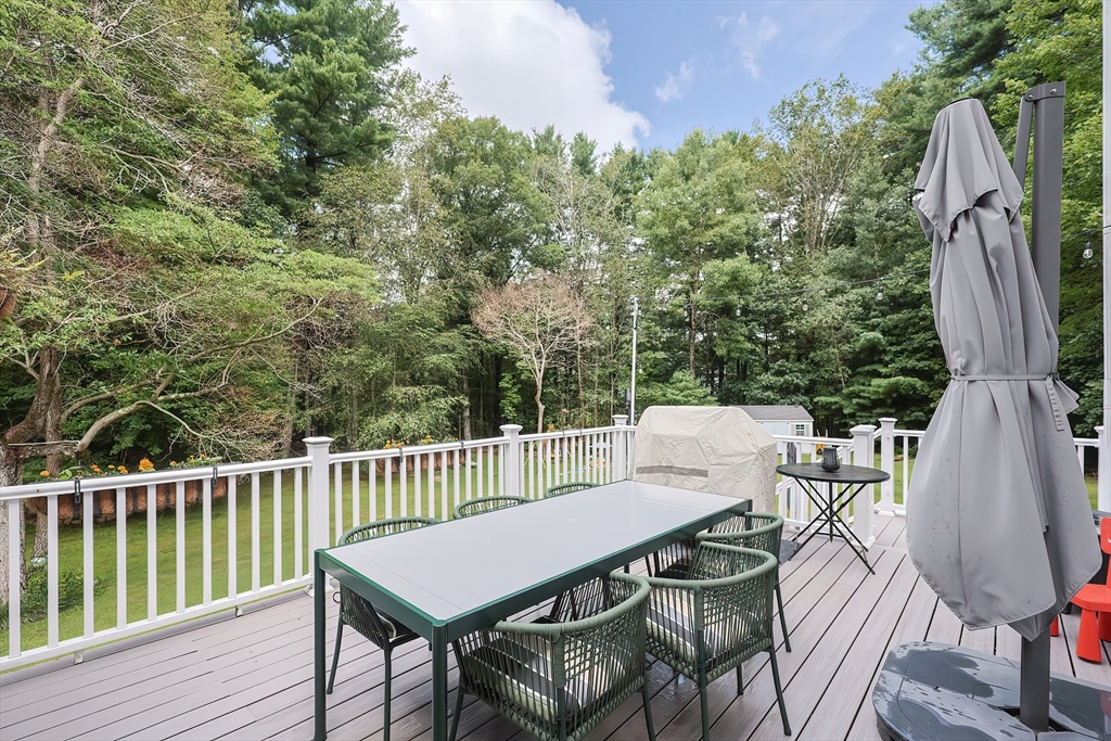 Beautifully updated home at the end of a quiet cul-de-sac! This 4-bed, 3-bath colonial offers a spacious eat-in kitchen with plenty of white cabinets, a large granite island, stacked stone backsplash, stainless steel appliances, a dining area, living room, and a family room with a cozy wood fireplace. Hardwood floors run throughout the first level along with a full bath. Upstairs features a full bath with double sinks and marble herringbone tile, a large front-to-back primary bedroom with walk-in closet, two additional bedrooms, and a convenient laundry room. The high-ceiling walk-up attic offers great potential for expansion. Enjoy the enclosed porch with newer wooden ceiling leading to a composite deck and private backyard abutting conservation trails. The remodeled walk-out basement includes a family room, bedroom, stunning tiled full bath, and a water connection—perfect for adding a bar or kitchenette. Make this your new home!