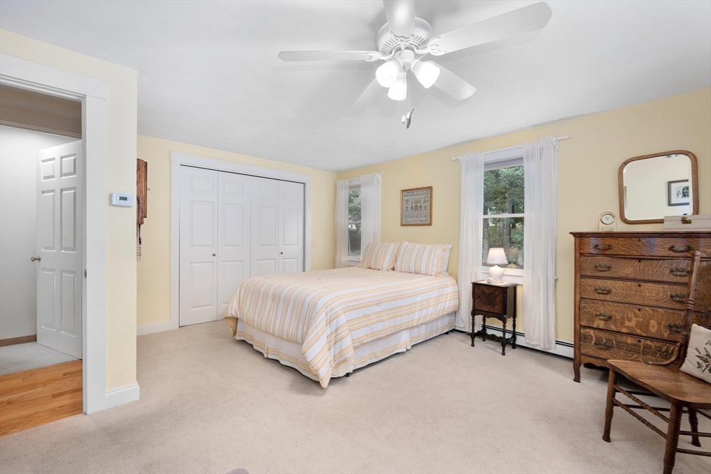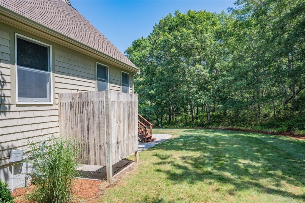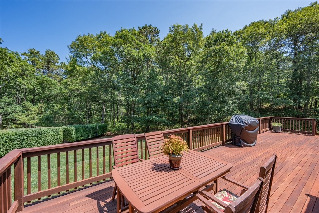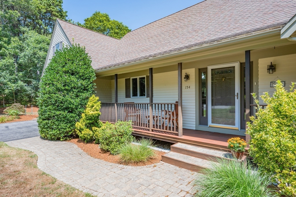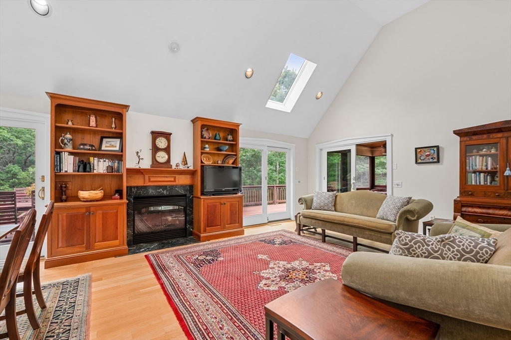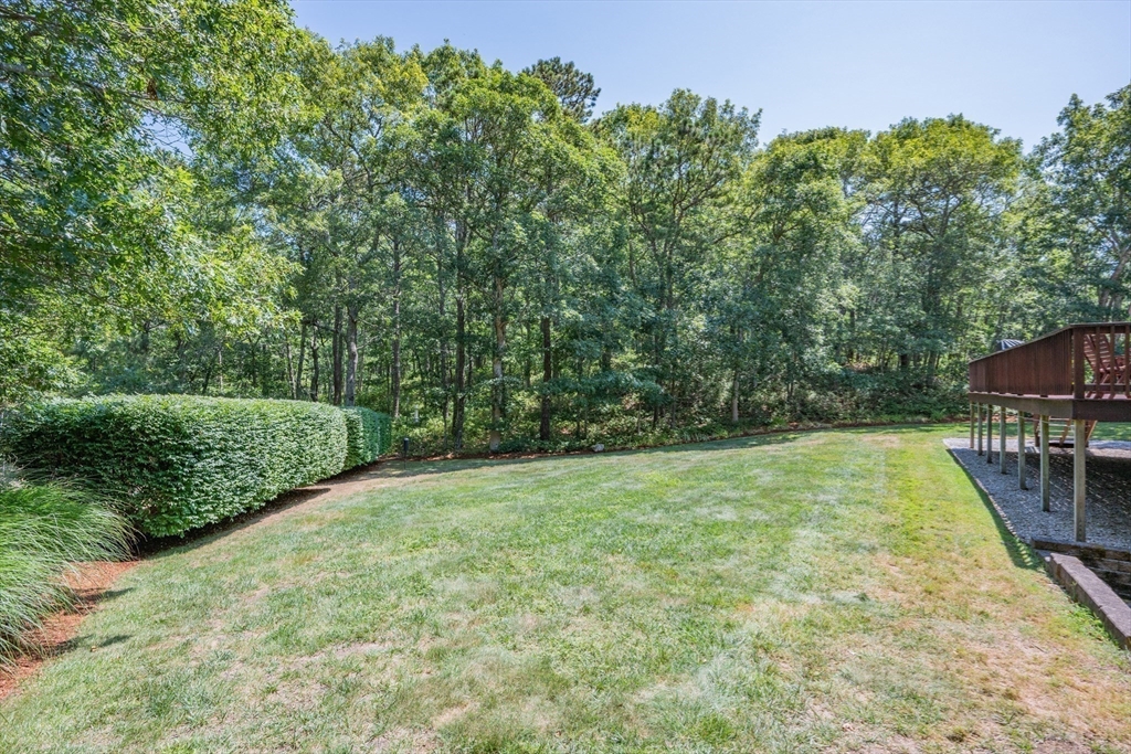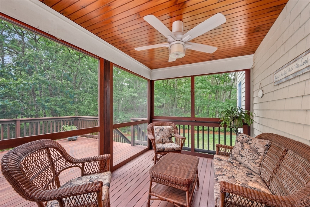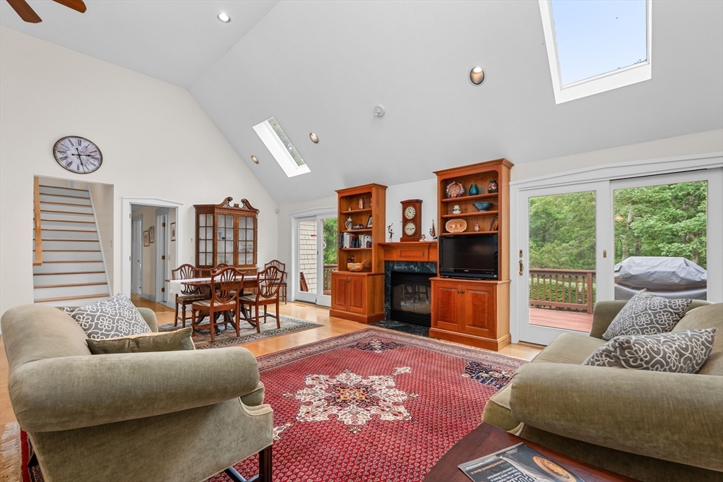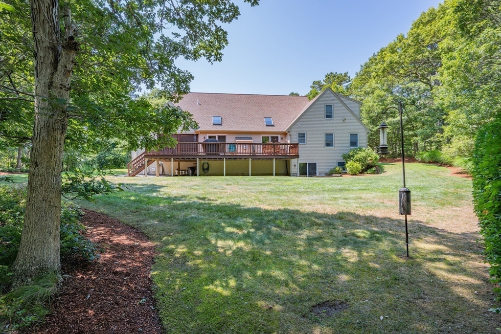 A contemporary Cape nestled next to the Flax Pond Conservation Area! A path out back links with trails leading to a golf course and 2 ponds! From the farmer's porch enter the expansive great room with vaulted ceilings, a gas fireplace, built-ins, and hardwood floors. The kitchen offers granite counters and tile floors. Relax in the screened porch or on the mahogany deck overlooking the private yard. The main BR suite includes a vaulted ceiling, dressing room, and a private bath with dual sinks and walk-in shower. Also on 1st floor, a guest room, a guest bath, laundry, and door to garage. Upstairs, 2 more guest rooms and a 3rd full bath. Lower level offers a huge family room, 2 other rooms (1 used as an office), a workshop, and slider to the backyard. A fenced vegetable garden behind the hedge. Outdoor shower too! Central AC in great rm, main BR, and office. So many great features, in a tranquil, private setting in a lovely neighborhood! Plse see video. Buyers/agents to confirm details.